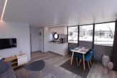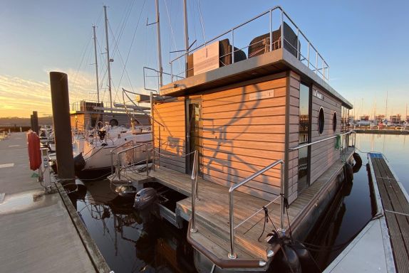 Dieses großzügige festliegende Hausboot bietet Ihnen auf 63 qm Bootsfläche den ganzen Komfort einer modernen und hochwertigen Ferienwohnung mit Sonnen- und Dachterrasse. Im gemütlichen Wohnraum mit Wohnküche lässt es sich entspannt auf der Couch verweilen oder Sie kommen am großzügigen Tisch zu einem leckeren Essen oder Spieleabend zusammen.