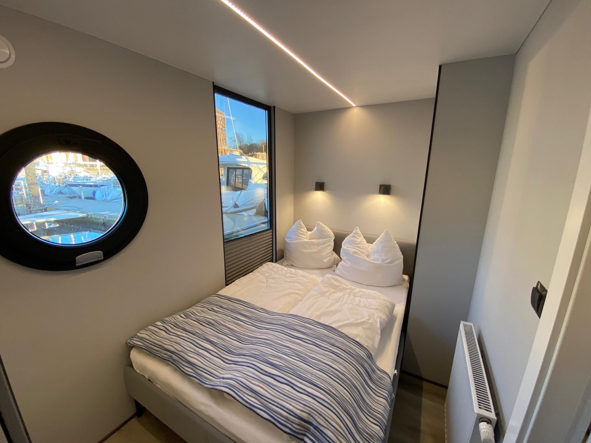 Im Inneren des Hausbootes finden Sie neben dem Wohnraum mit Fußbodenheizung für kalte Tage zwei Schlafräume mit je einem Doppelbett sowie ein modernes Duschbad. Genügend Stauraum finden Sie in den Schränken in den jeweiligen Räumen.