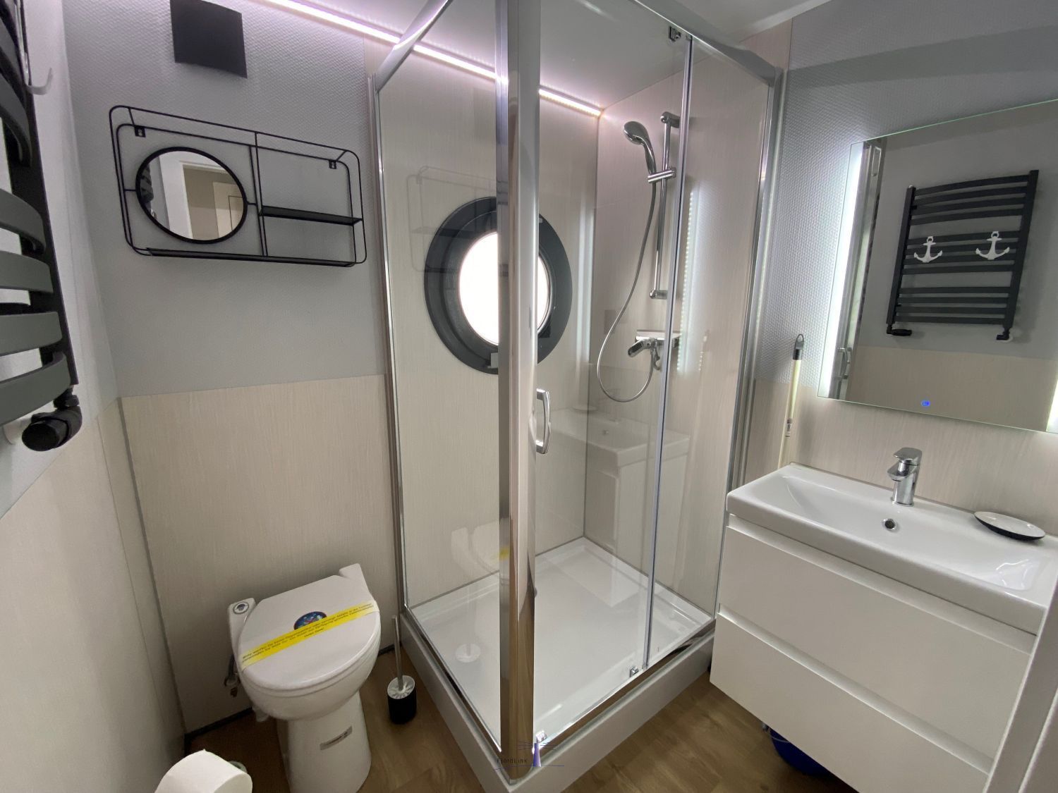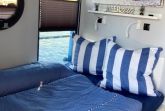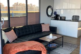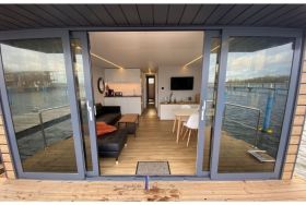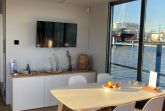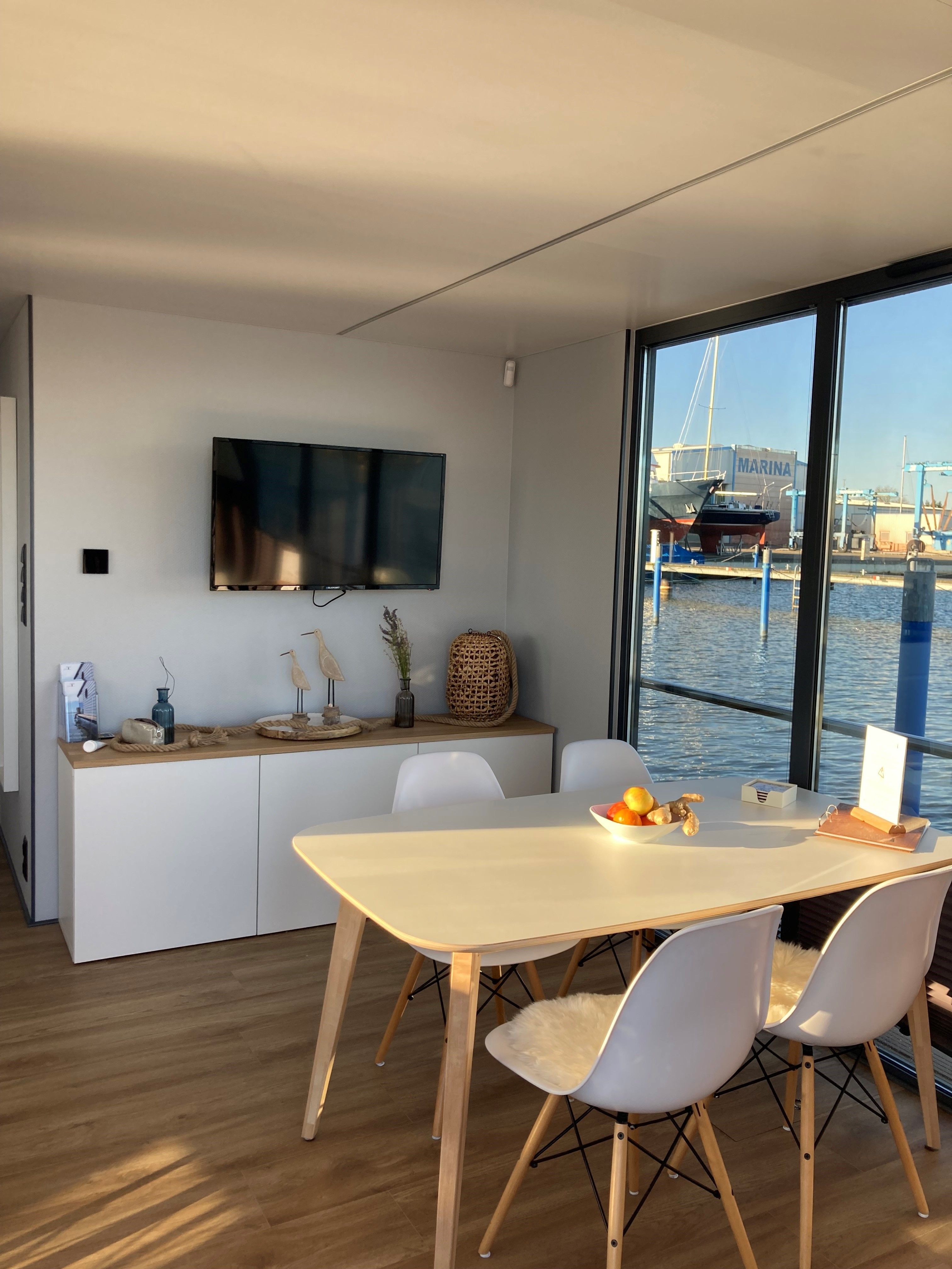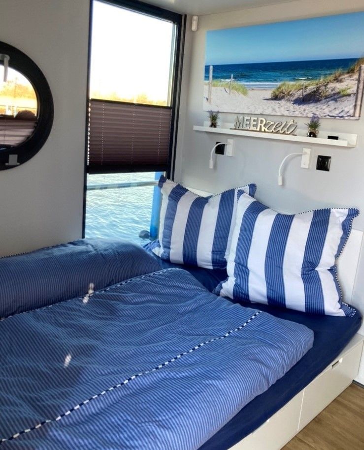 Im Inneren des Hausbootes finden Sie neben dem Wohnraum mit Fußbodenheizung für kalte Tage zwei Schlafräume mit je einem Doppelbett sowie ein modernes Duschbad. Genügend Stauraum finden Sie in den Schränken sowie in den Schubladen unter den Betten.