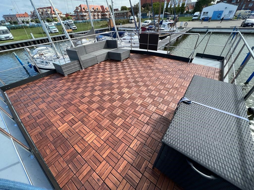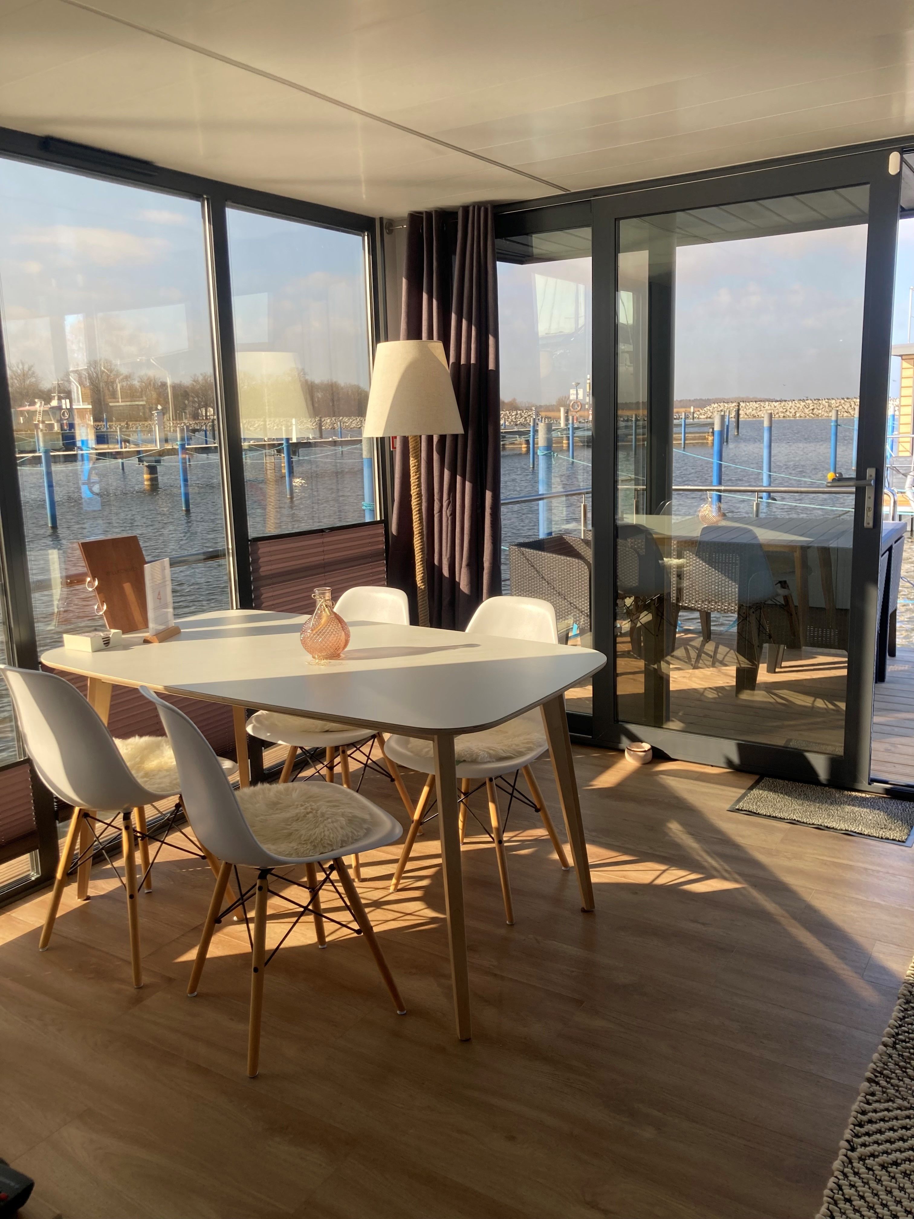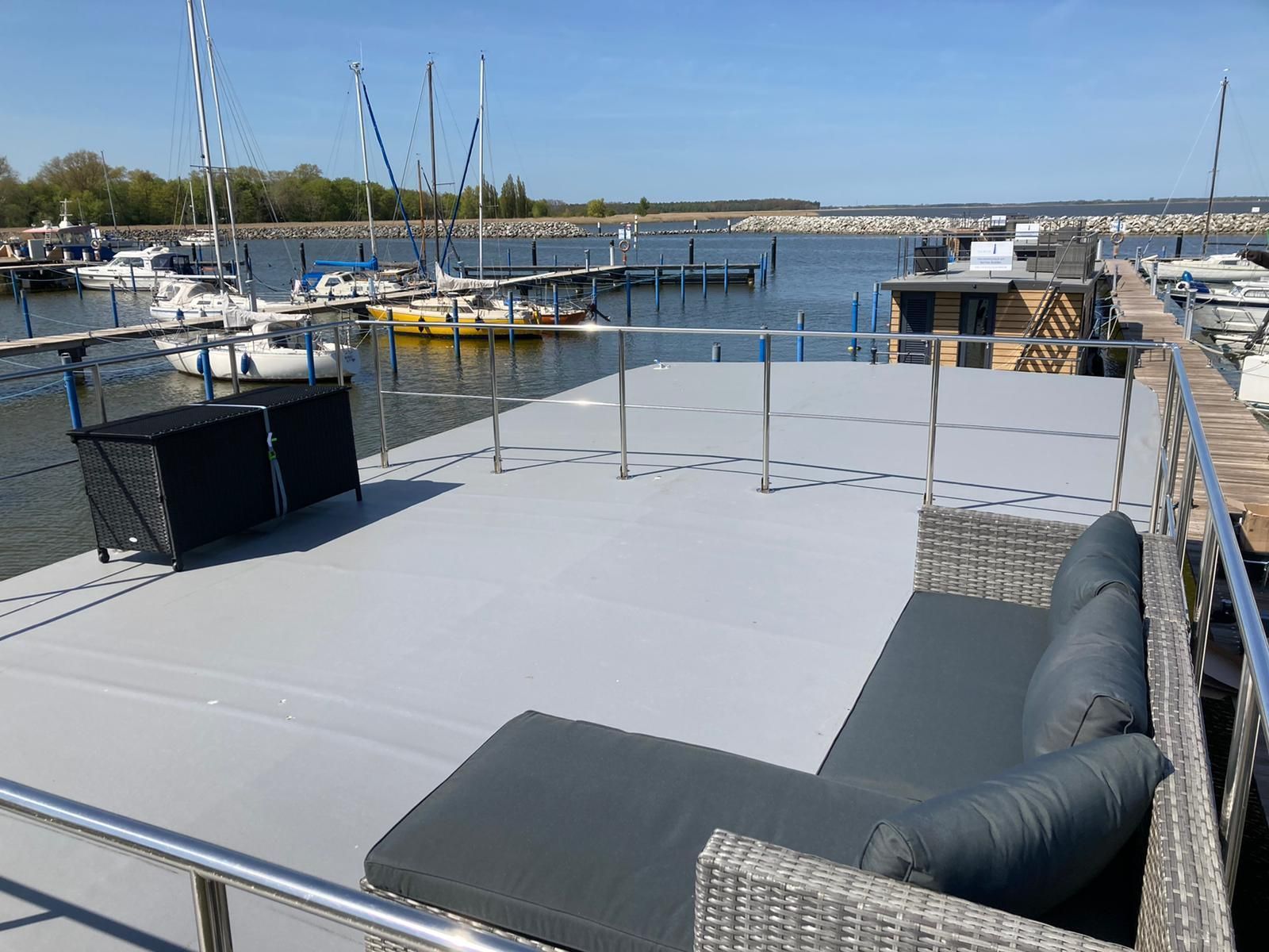 Die vollausgestattete Küche mit allen wichtigen Küchengeräten und einem Induktionsherd lässt keine Wünsche offen. Die Spülmaschine unterstützt Sie dabei, schnell wieder die wesentlichen Dinge des Urlaubes fokussieren zu können. An warmen Tagen laden sowohl die zwei Sonnenterrassen vor und hinter dem Wohnaufbau als auch die Dachterrasse zum Entspannen und Sonnenbaden ein. Auf dieser haben Sie einen atemberaubenden Blick über den Barther Bodden bis zur vorgelagerten Halbinsel Fischland ? Darß - Zingst und können wunderbare Sonnenuntergänge genießen.