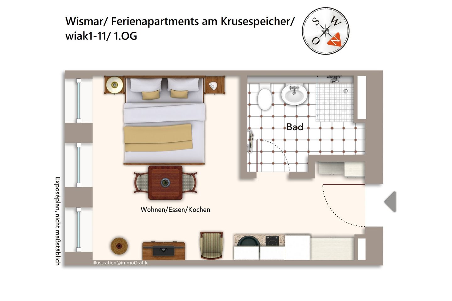 Das hochwertige Apartment befindet sich in südöstlicher Lage im ersten Obergeschoss des Gebäudes. Der Alte Hafen von Wismar, einer der attraktivsten Orte der Hansestadt, liegt euch hier zu Füßen. Von hier aus lässt sich die Stadt und das schöne Umland ideal erkunden. Der Alte Hafen ist übrigens auch ein sehr beliebter Veranstaltungsort für Events und Feste.