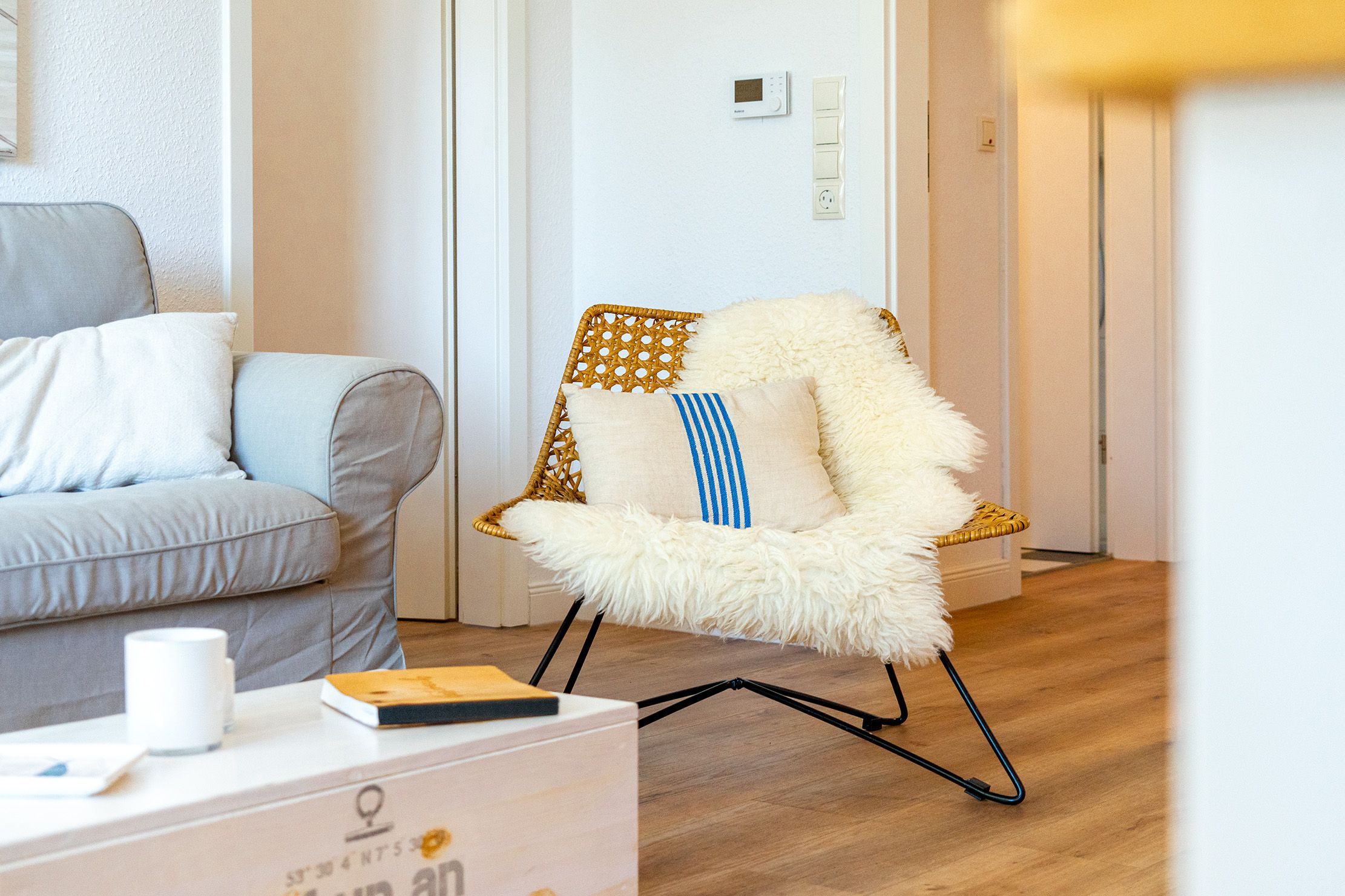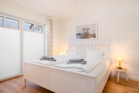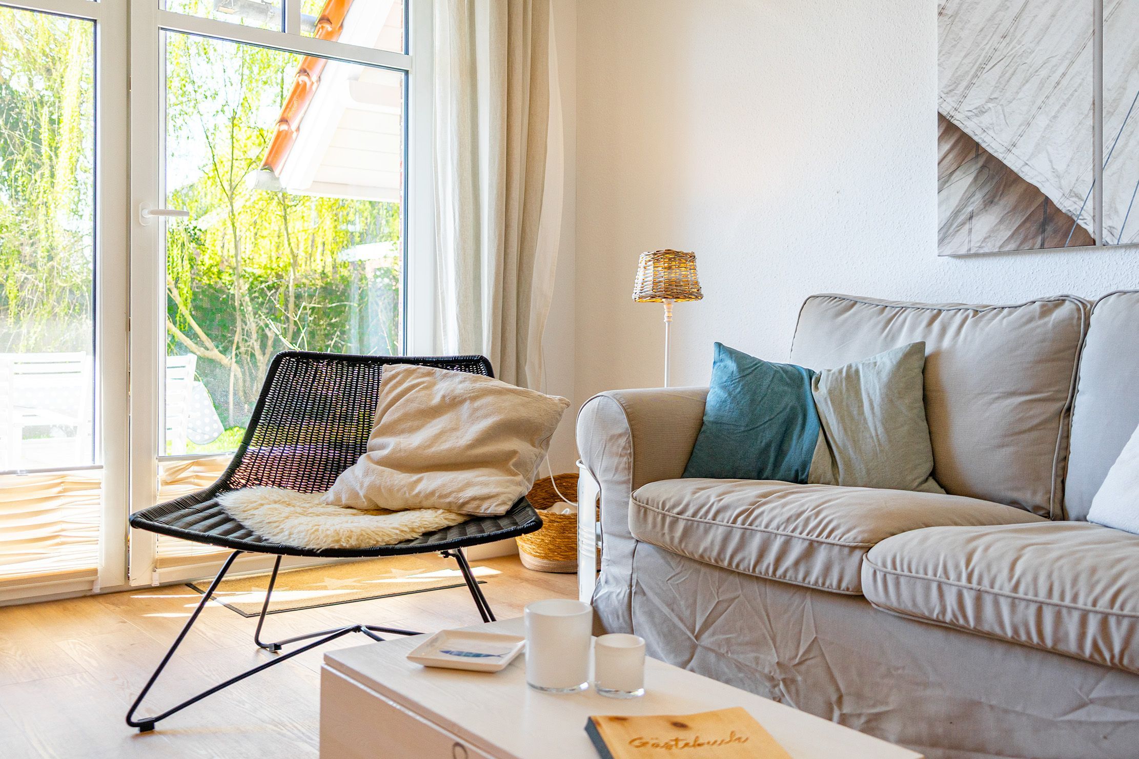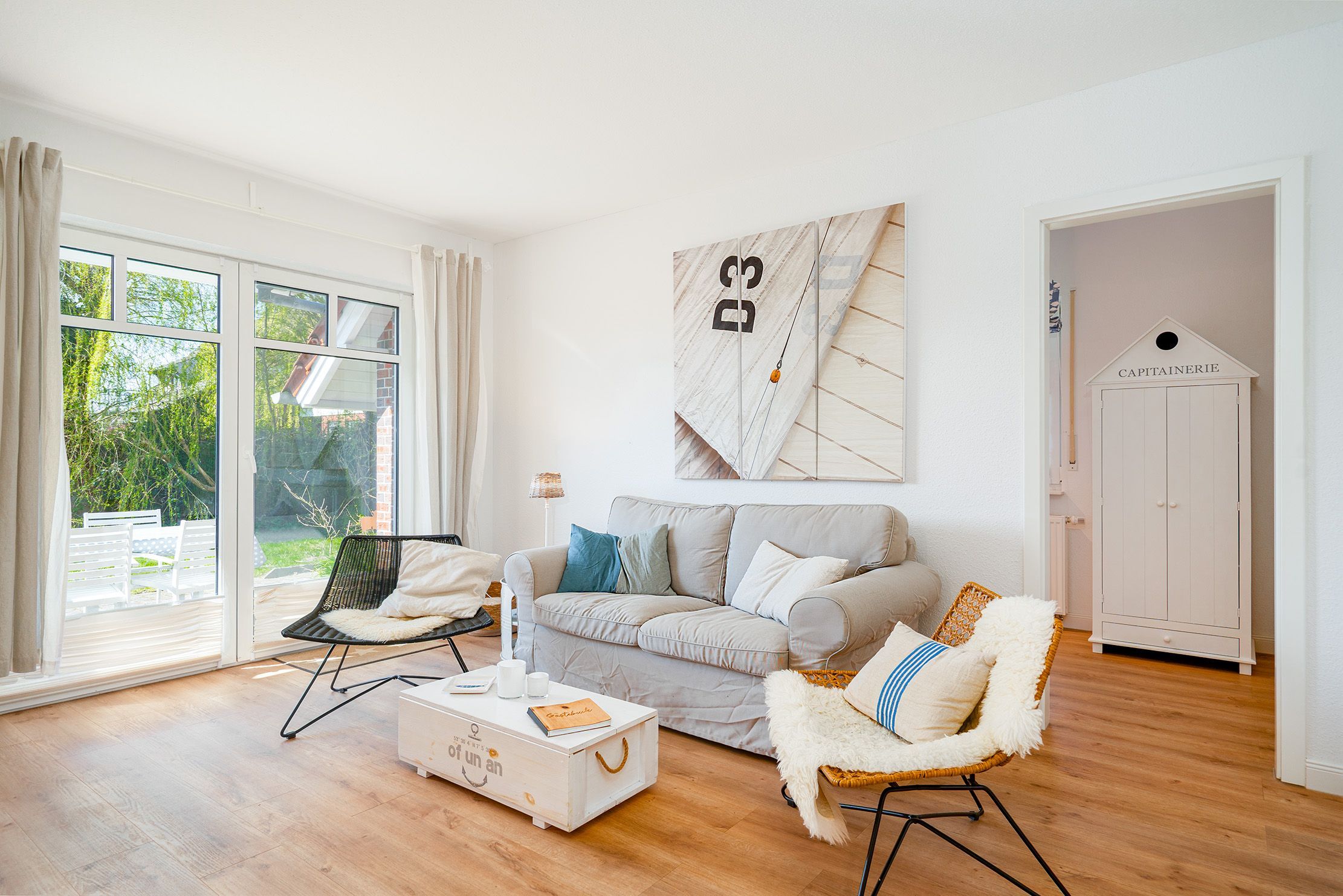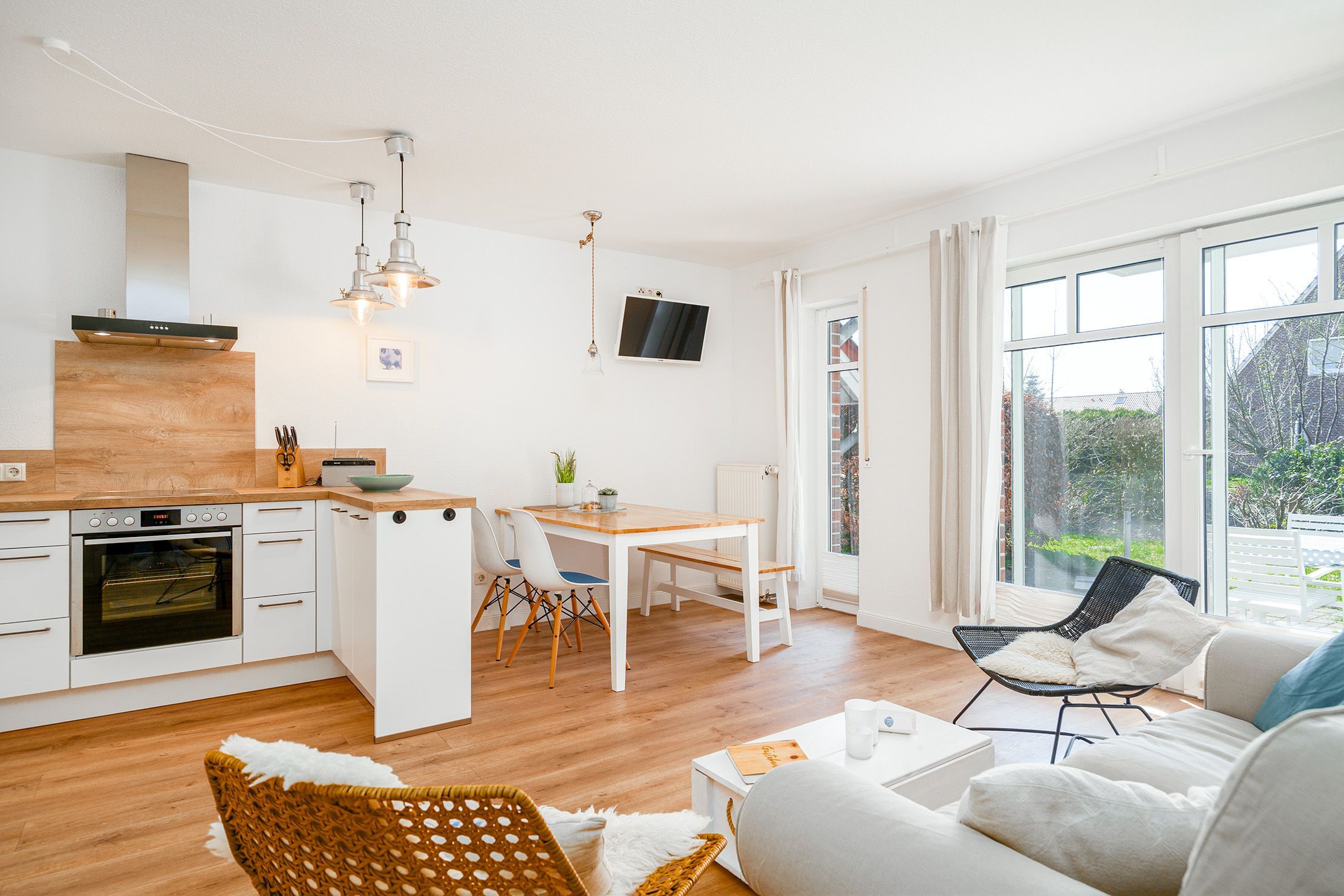 Unsere ebenerdige Ferienwohnung of und an wurde erst kürzlich vollständig renoviert und befindet sich in zentraler Lage direkt hinter dem Deich. Mit ihrer nordischen Einrichtung in sanften Natur- und Weißtönen schafft die Wohnung eine gemütliche Atmosphäre. Auf etwa 70qm bietet sie einen hellen und hochwertig eingerichteten Wohnbereich mit einer großen und voll ausgestatteten Küchenzeile, einen Essbereich sowie eine einladende Sofaecke für gemeinsame Abende. Neben einem Tageslichtbad mit ebenerdiger Dusche verfügt die Wohnung über zwei Schlafzimmer mit Doppelbetten. Auch ein Abstellraum steht zur Verfügung. Die großzügige Terrasse mit Garten erreichen Sie bequem durch den Wohnbereich, hier lässt sich die frische Nordseeluft bestens genießen. Am Haus steht Ihnen ein reservierter Parkplatz zur Verfügung. Besonders hervorzuheben bei dieser Wohnung ist die Kombination aus ruhiger und zentraler Lage, denn den Hafen mit seinen zahlreichen Restaurants und kleinen Geschäften erreichen Sie über den Deich in nur wenigen hundert Metern zu Fuß und dennoch bietet die Wohnung mit ihrer Außenanlage den perfekten Rückzugsort.