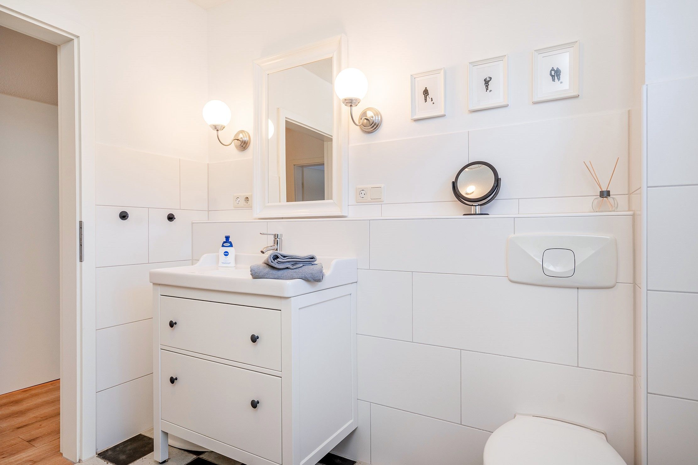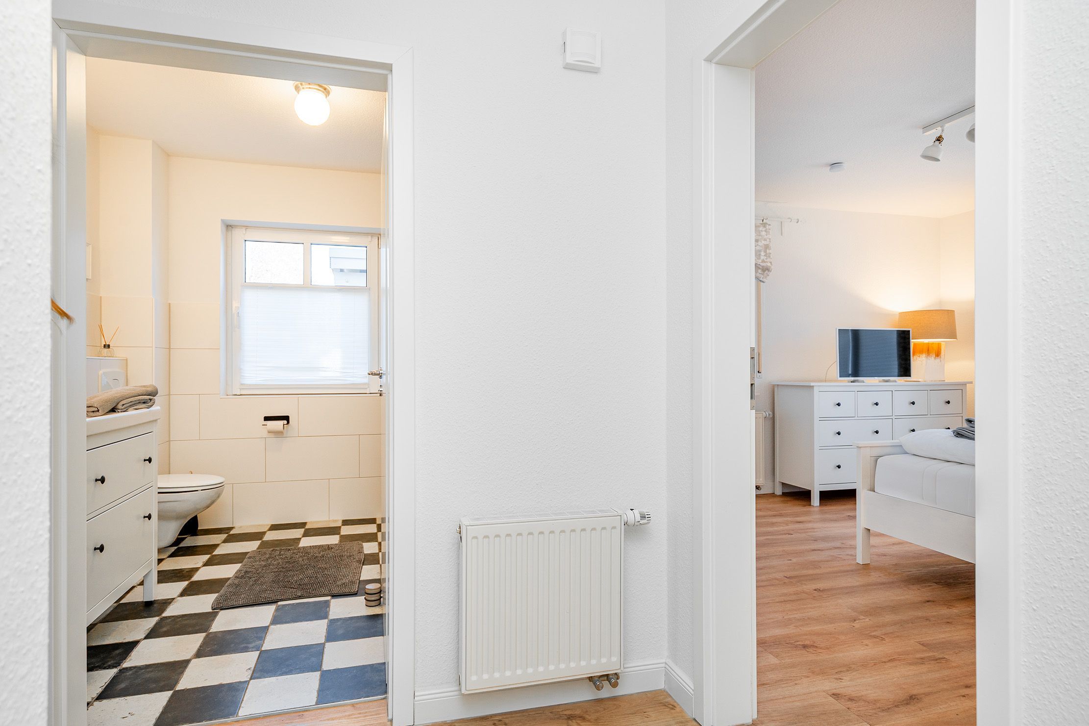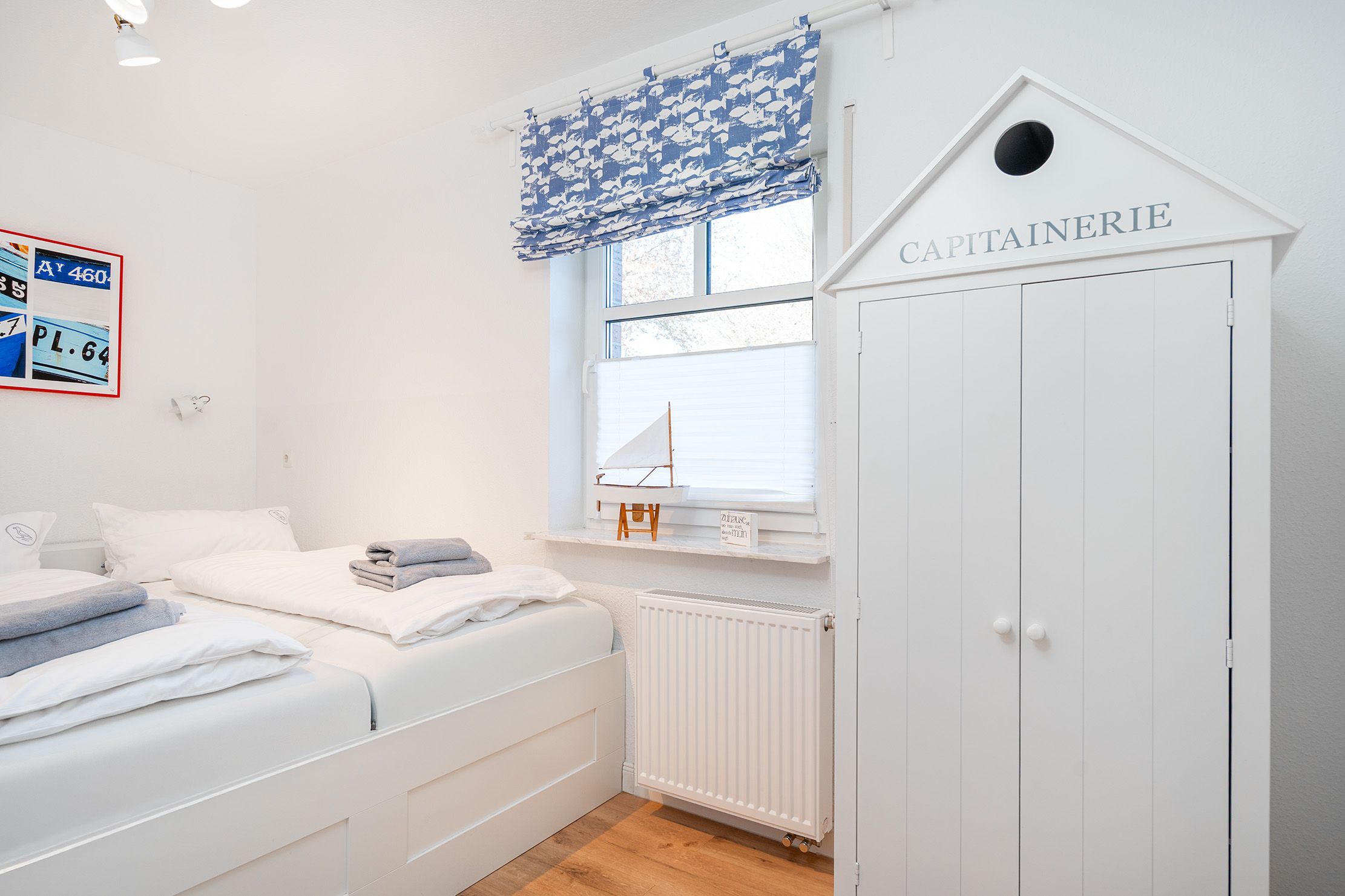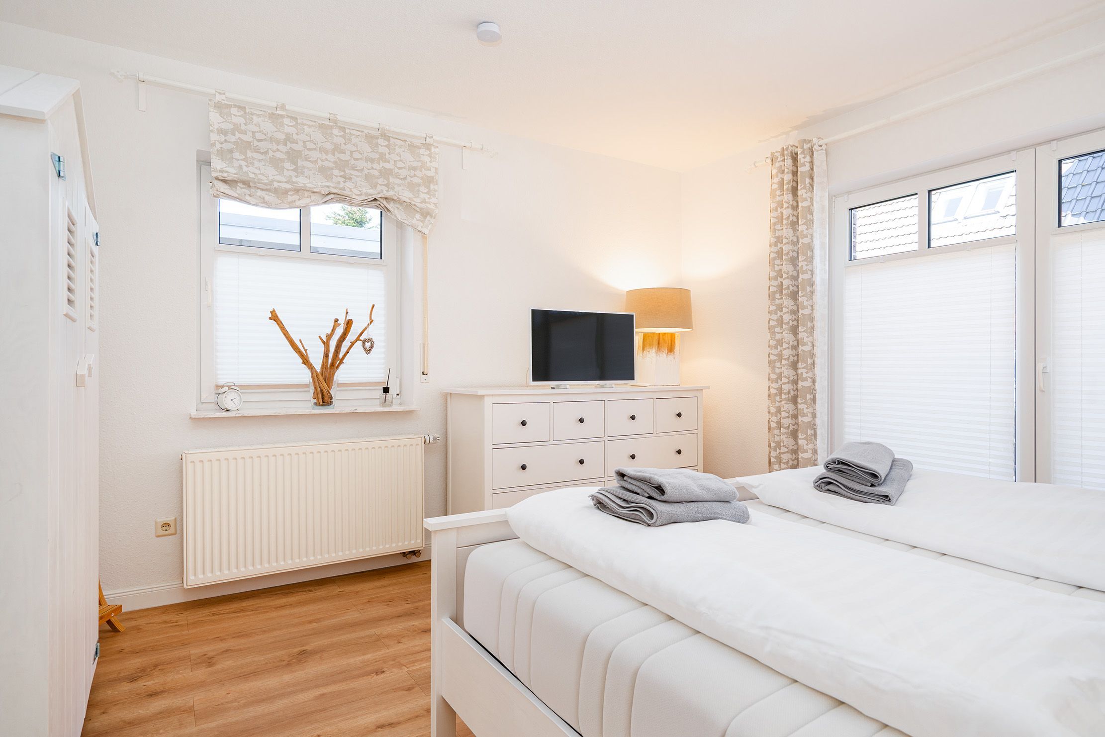 Unsere ebenerdige Ferienwohnung of und an wurde erst kürzlich vollständig renoviert und befindet sich in zentraler Lage direkt hinter dem Deich. Mit ihrer nordischen Einrichtung in sanften Natur- und Weißtönen schafft die Wohnung eine gemütliche Atmosphäre. Auf etwa 70qm bietet sie einen hellen und hochwertig eingerichteten Wohnbereich mit einer großen und voll ausgestatteten Küchenzeile, einen Essbereich sowie eine einladende Sofaecke für gemeinsame Abende. Neben einem Tageslichtbad mit ebenerdiger Dusche verfügt die Wohnung über zwei Schlafzimmer mit Doppelbetten. Auch ein Abstellraum steht zur Verfügung. Die großzügige Terrasse mit Garten erreichen Sie bequem durch den Wohnbereich, hier lässt sich die frische Nordseeluft bestens genießen. Am Haus steht Ihnen ein reservierter Parkplatz zur Verfügung. Besonders hervorzuheben bei dieser Wohnung ist die Kombination aus ruhiger und zentraler Lage, denn den Hafen mit seinen zahlreichen Restaurants und kleinen Geschäften erreichen Sie über den Deich in nur wenigen hundert Metern zu Fuß und dennoch bietet die Wohnung mit ihrer Außenanlage den perfekten Rückzugsort.