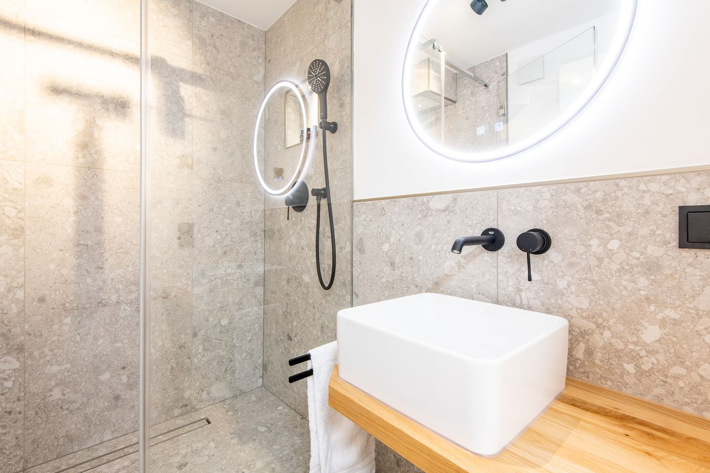 Die zwei modernen Badezimmer sind mit ebenerdigen Duschen ausgestattet. Ein zusätzliches Gäste-WC sorgt für noch mehr Komfort. Highlight ist der gemeinschaftlich nutzbare Wellnessbereich mit Sauna und Fitnessgeräten, der Ihnen pure Entspannung bietet.