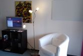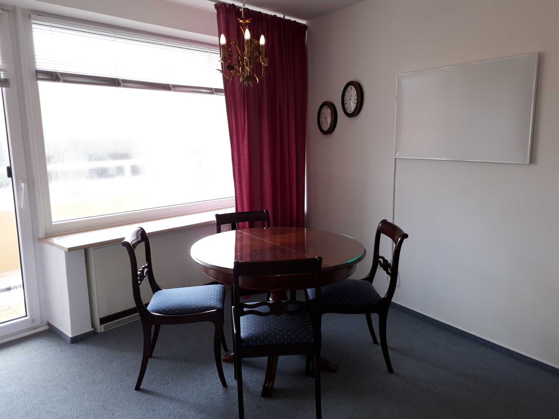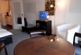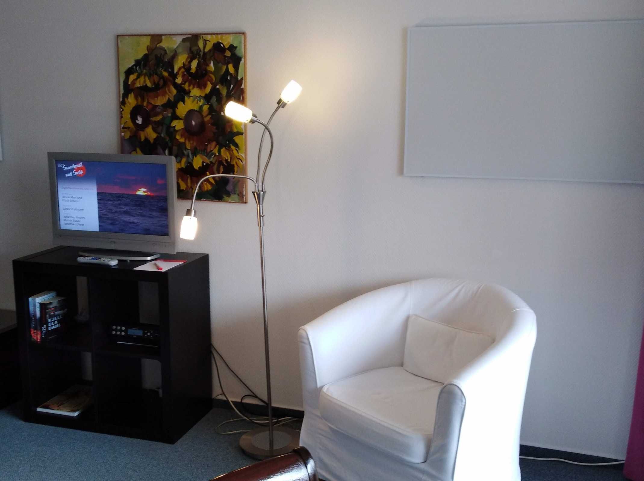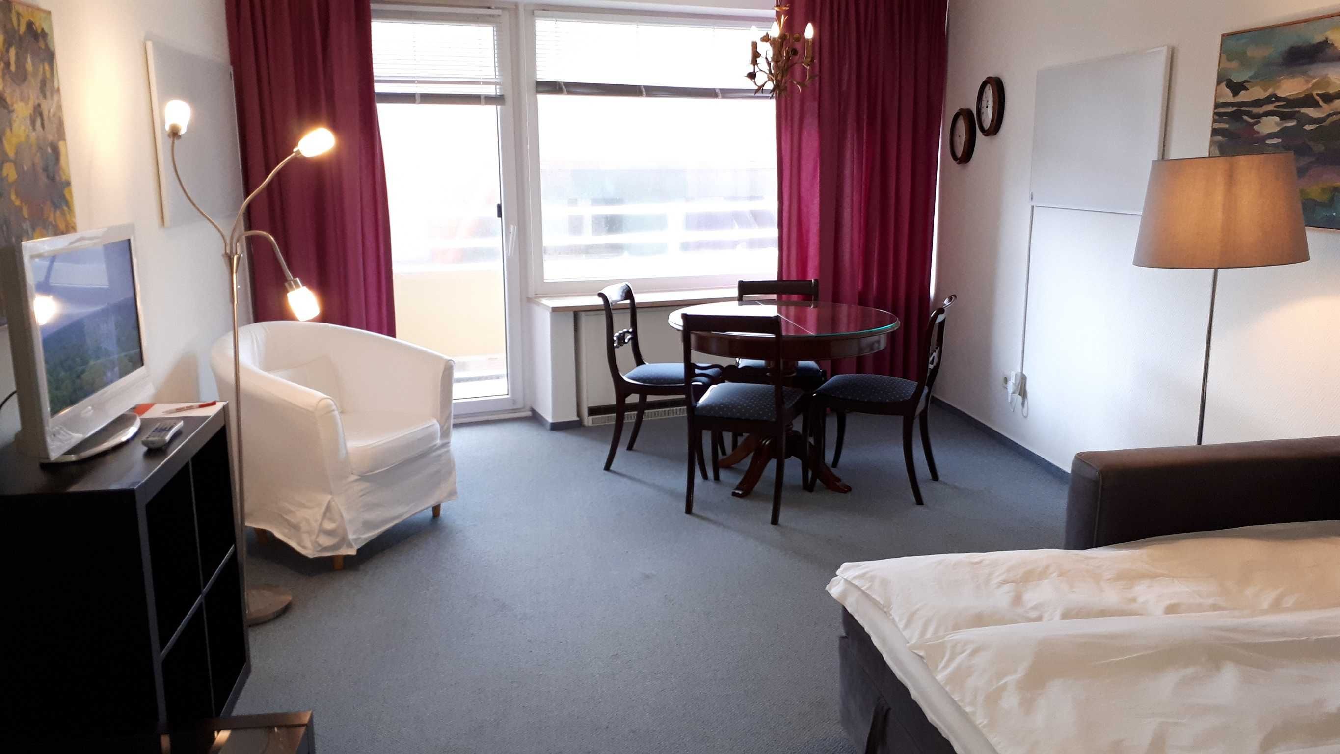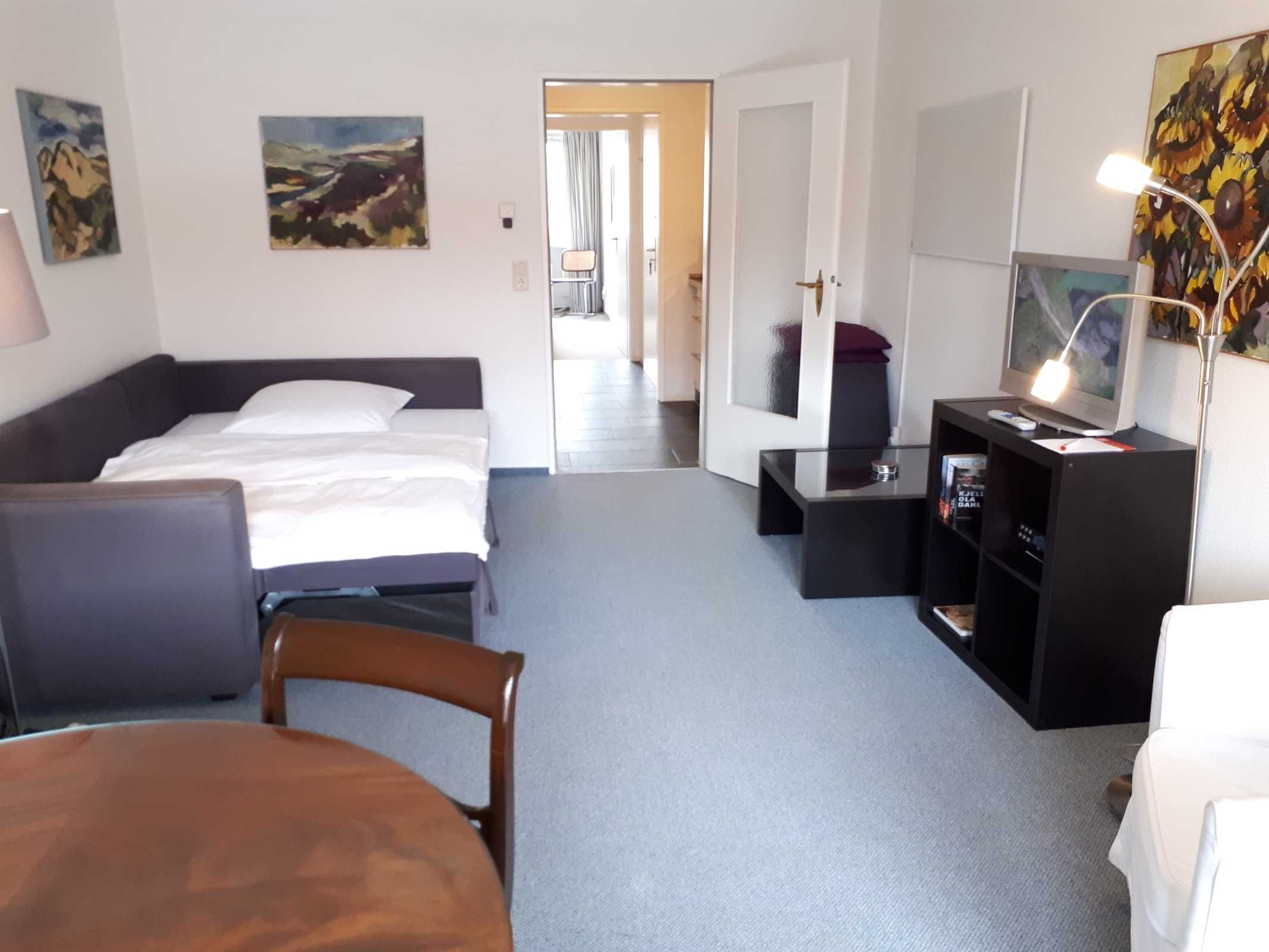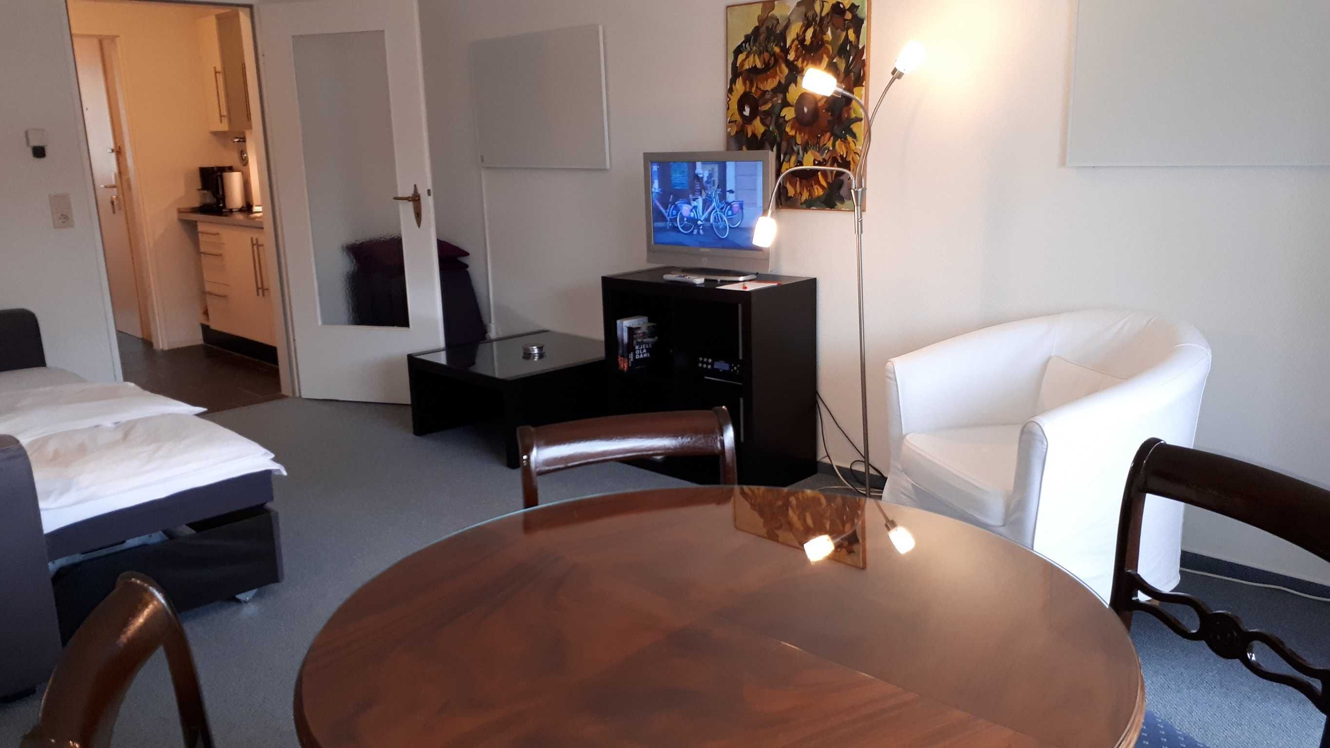 Ein gemütliches Wohnzimmer mit Couchgarnitur (Schlafsofa), Flachbild-TV und Essecke ist der Mittelpunkt der Wohnung.