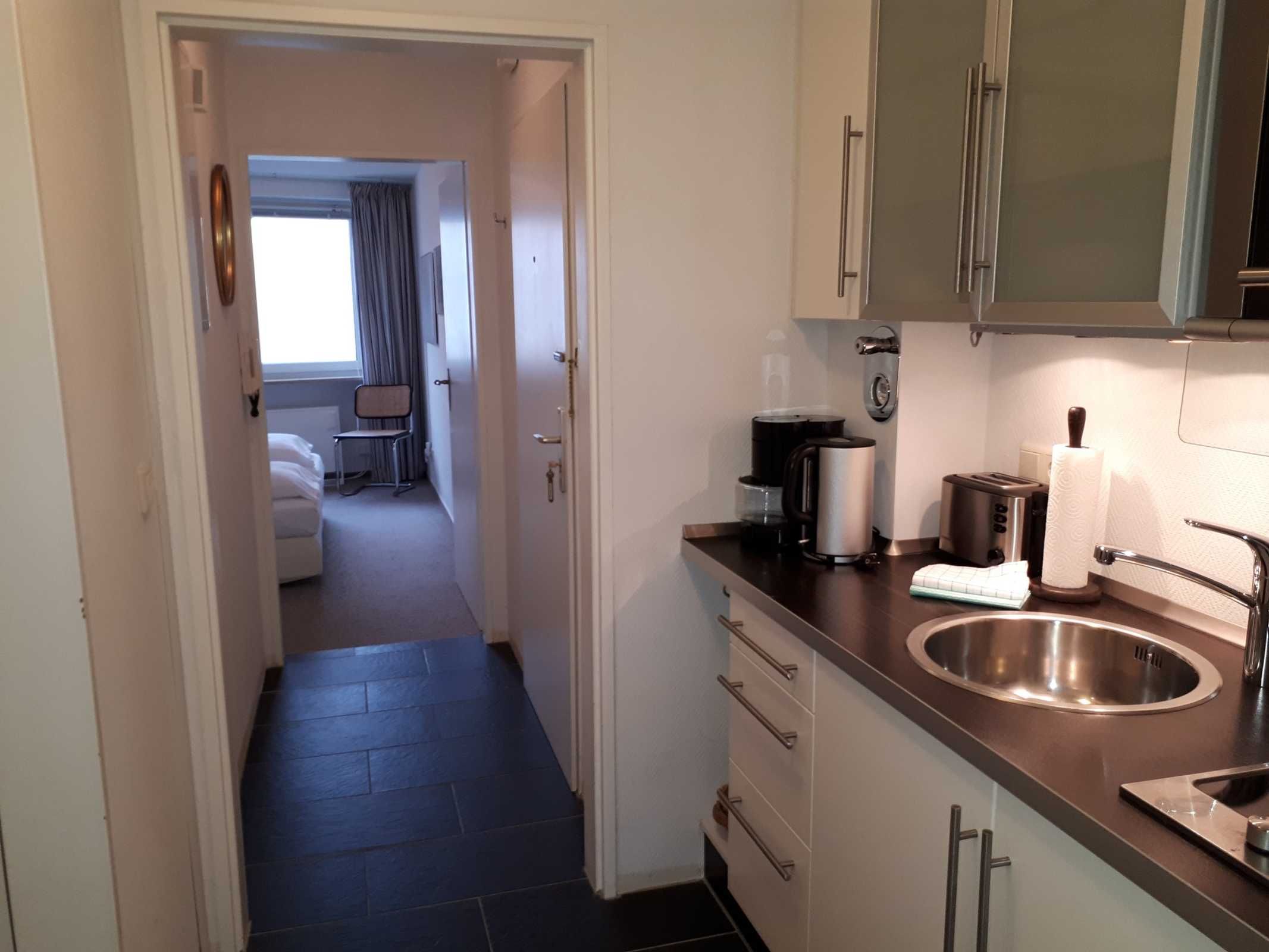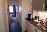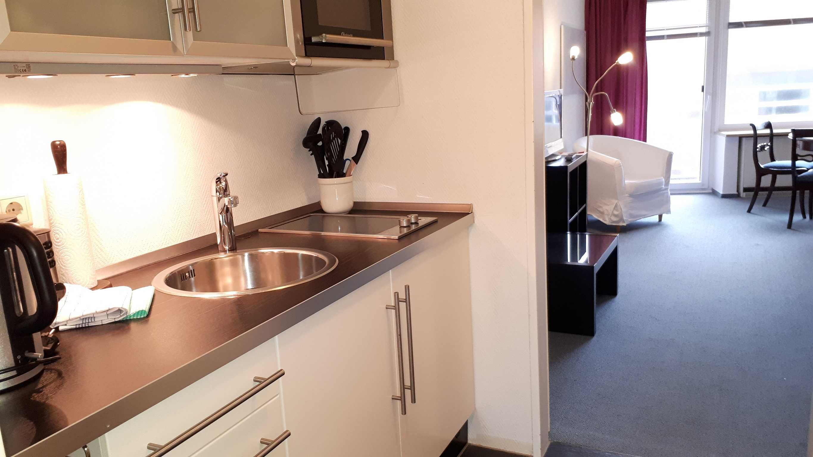 Die moderne Küchennische ist ausgestattet mit 2-Plattencerankochfeld, Mikrowelle, Kühlschrank mit Gefriermöglichkeit, Kaffeemaschine, Wasserkocher, Toaster und Geschirr für den täglichen Bedarf sind selbstverständlich.