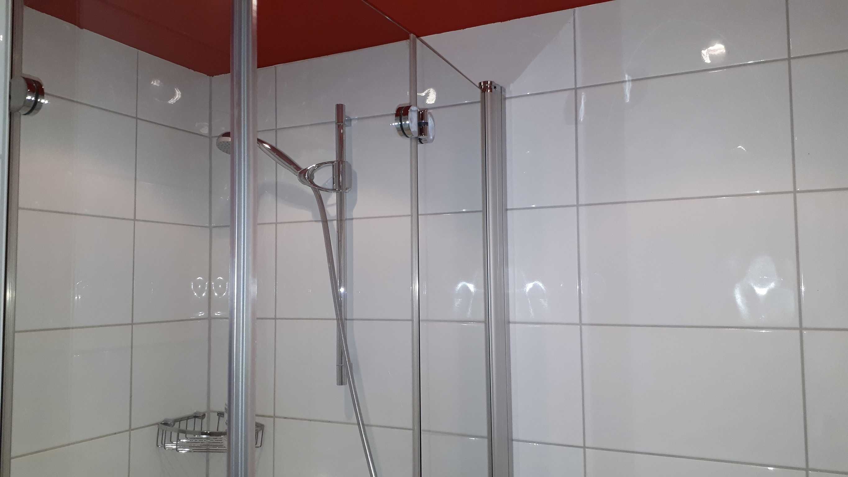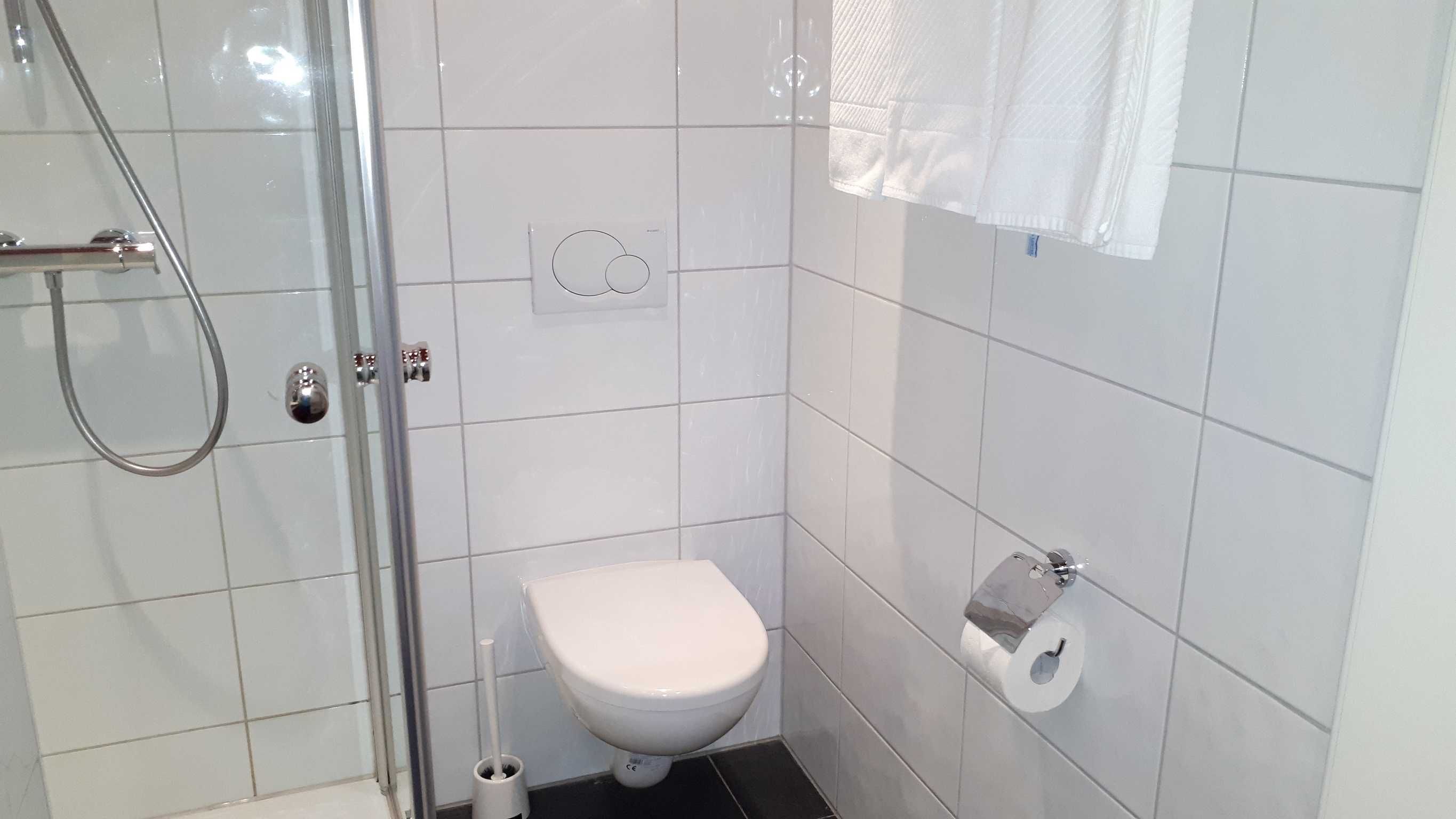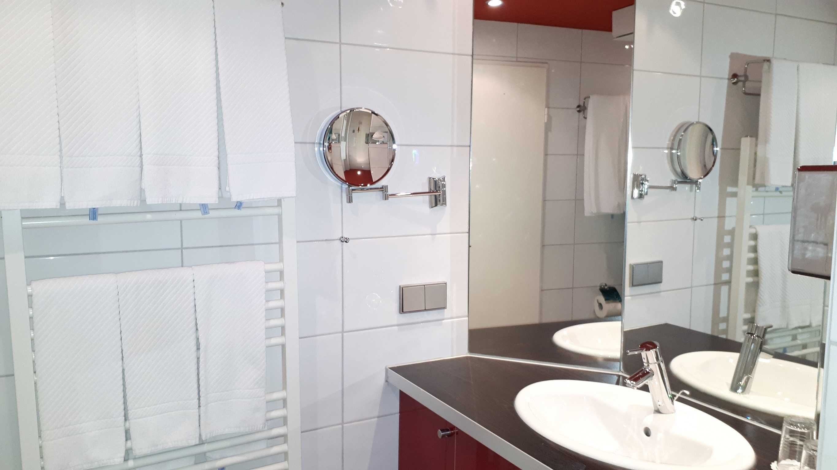 Ein elegantes Bad mit Waschtisch, Dusche, WC, Handtuchwärmer und Haartrockner.