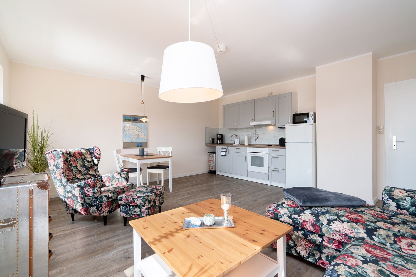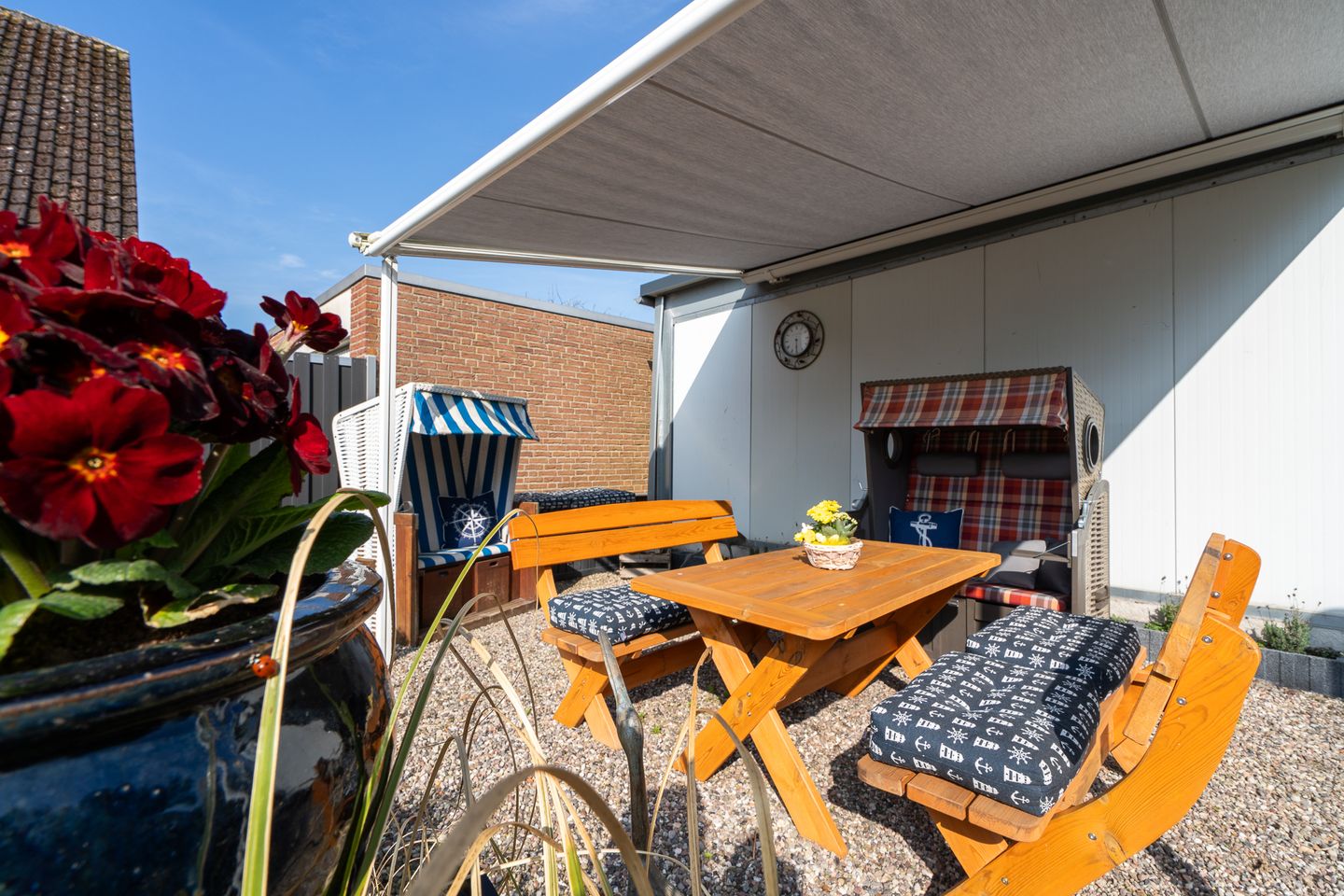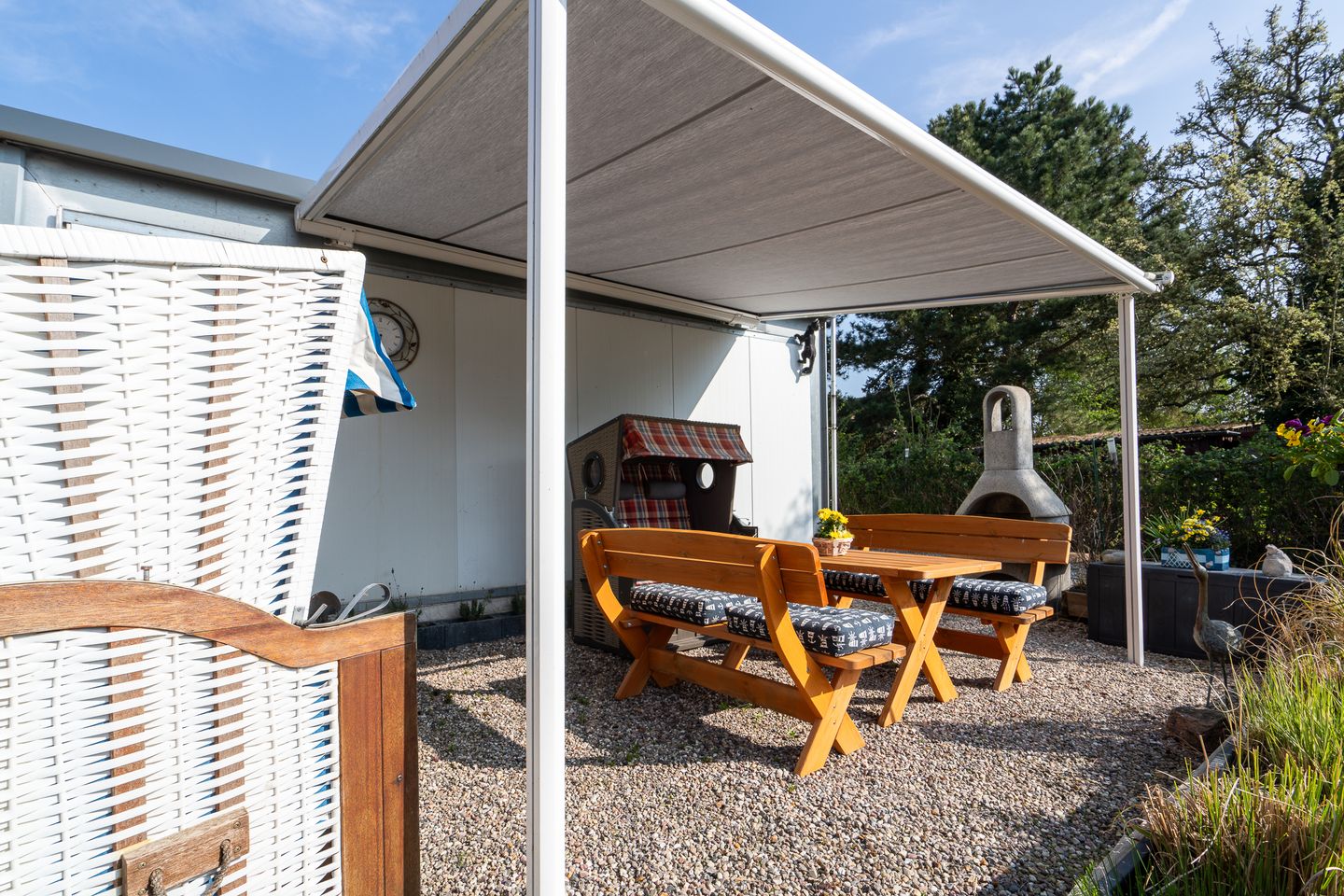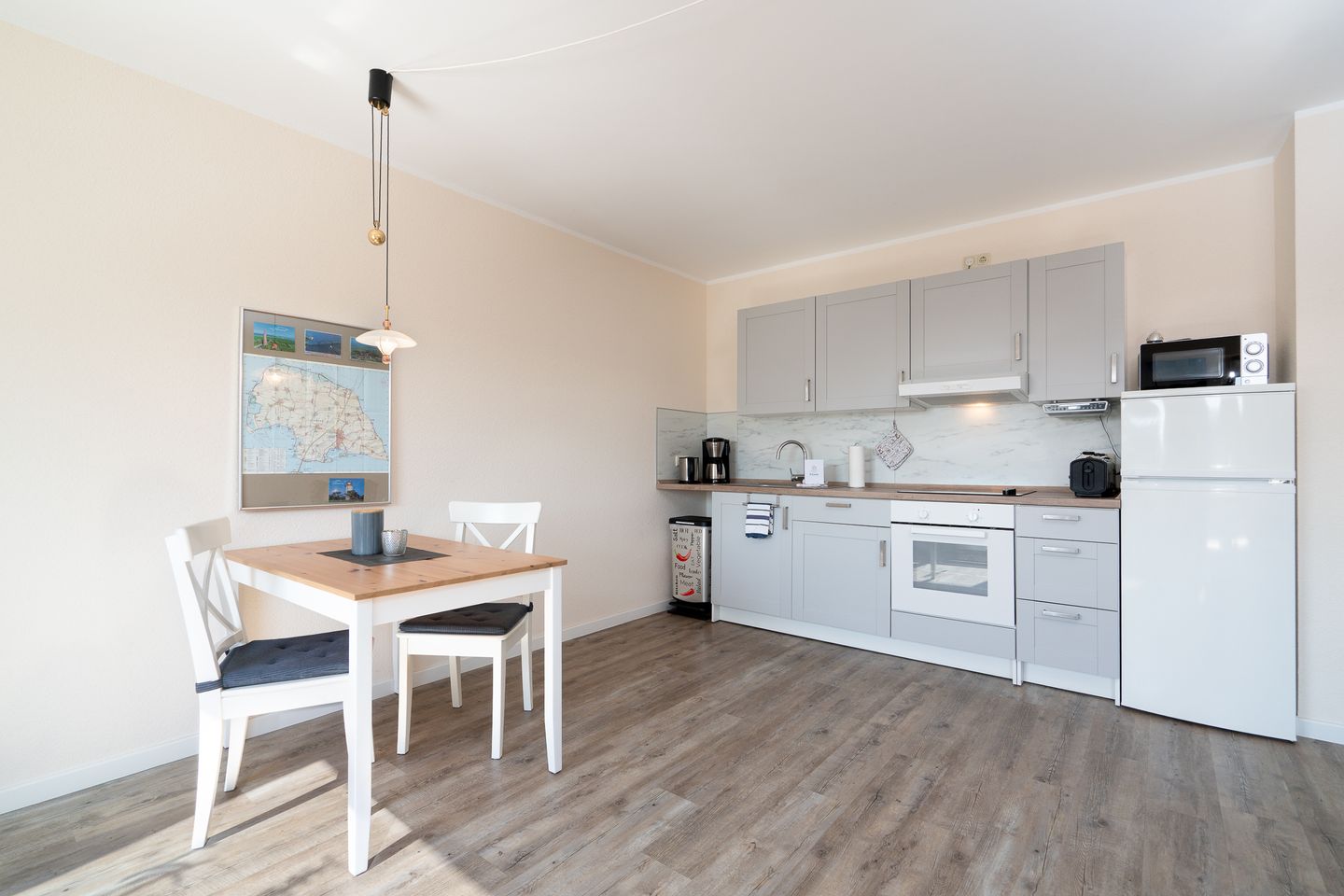 Erleben Sie erholsame Tage in dieser gemütlichen 55 m² großen Ferienwohnung im 1. Obergeschoss – perfekt für zwei Gäste und ihre vierbeinigen Begleiter. Die liebevoll eingerichtete Wohnung bietet ein komfortables Schlafzimmer, ein modernes Duschbad mit Haartrockner sowie eine offene, voll ausgestattete Küche mit Mikrowelle, Kaffeemaschine und allen notwendigen Küchenutensilien. Auf der möblierten Terrasse mit Grillplatz, Markise, Sonnenliegen und Strandkorb können Sie entspannte Stunden genießen. Das 900 m² große, vollständig eingezäunte Grundstück bietet viel Platz für Sie und Ihren Hund.
