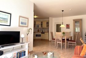 Das Wohnzimmer ist ausgestattet mit einer gemütlichen Couch, Korbsessel, Fernseher und einen Esstisch. Die offene Küchenzeile ist ausgestattet mit, Backofen, Herd, Spülmaschine, Wasserkocher, Toaster und Kaffeemaschine. Töpfe und Geschirr ist ausreichend vorhanden. Das Schlafzimmer verfügt über ein gemütliches Doppelbett und über einen Kleiderschrank. Das Badezimmer ist ausgestattet mit einer Dusche, Haartrockner und Waschmaschine. Zur Wohnung gehört auch ein Abstellraum. Elektrische Außenrolladen befinden sich im Schlafzimmer.