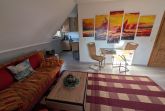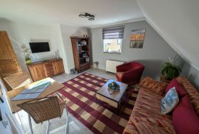 Unsere Ferienwohnung Merle ist eine 45m² Dachgeschosswohnung bestehend aus einem Schlafzimmer,einem Wohnzimmer mit ausziehbarer Couch.Eine SMART-TV,einer voll ausgestatten Küche.