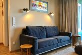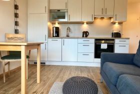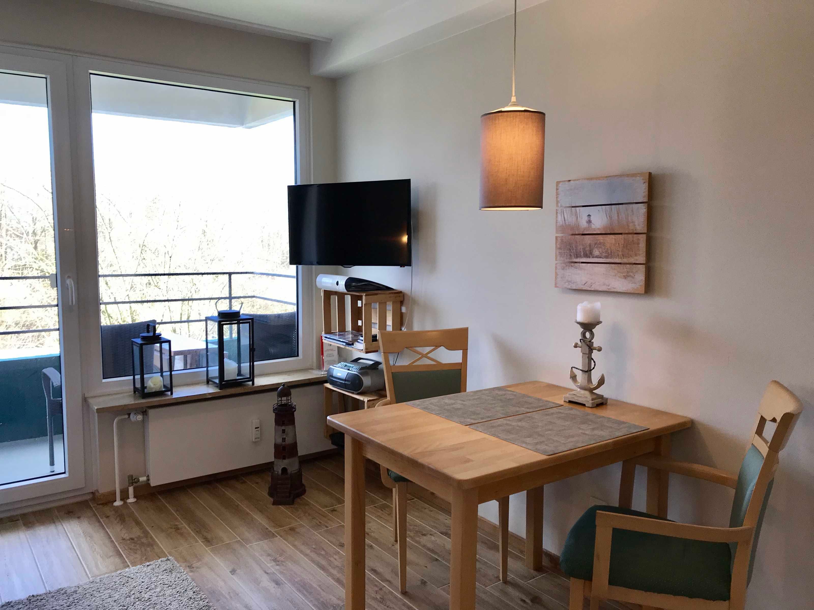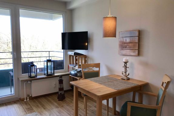 Der Wohnraum der Ferienwohnung besticht mit schönem Design und verfügt über ein Schlafsofa, einen Esstisch mit 2 Stühlen sowie einen 80 cm Fernseher (Kabel TV). Die integrierte Einbauküche inkl. Spülmaschine und Induktionsherd ist sehr komfortabel. Auf dem Balkon der Ferienwohnung genießen Sie Ostseeblick. Ausgestattet ist der Balkon mit 2 Stühlen und einem kleinen Tisch.