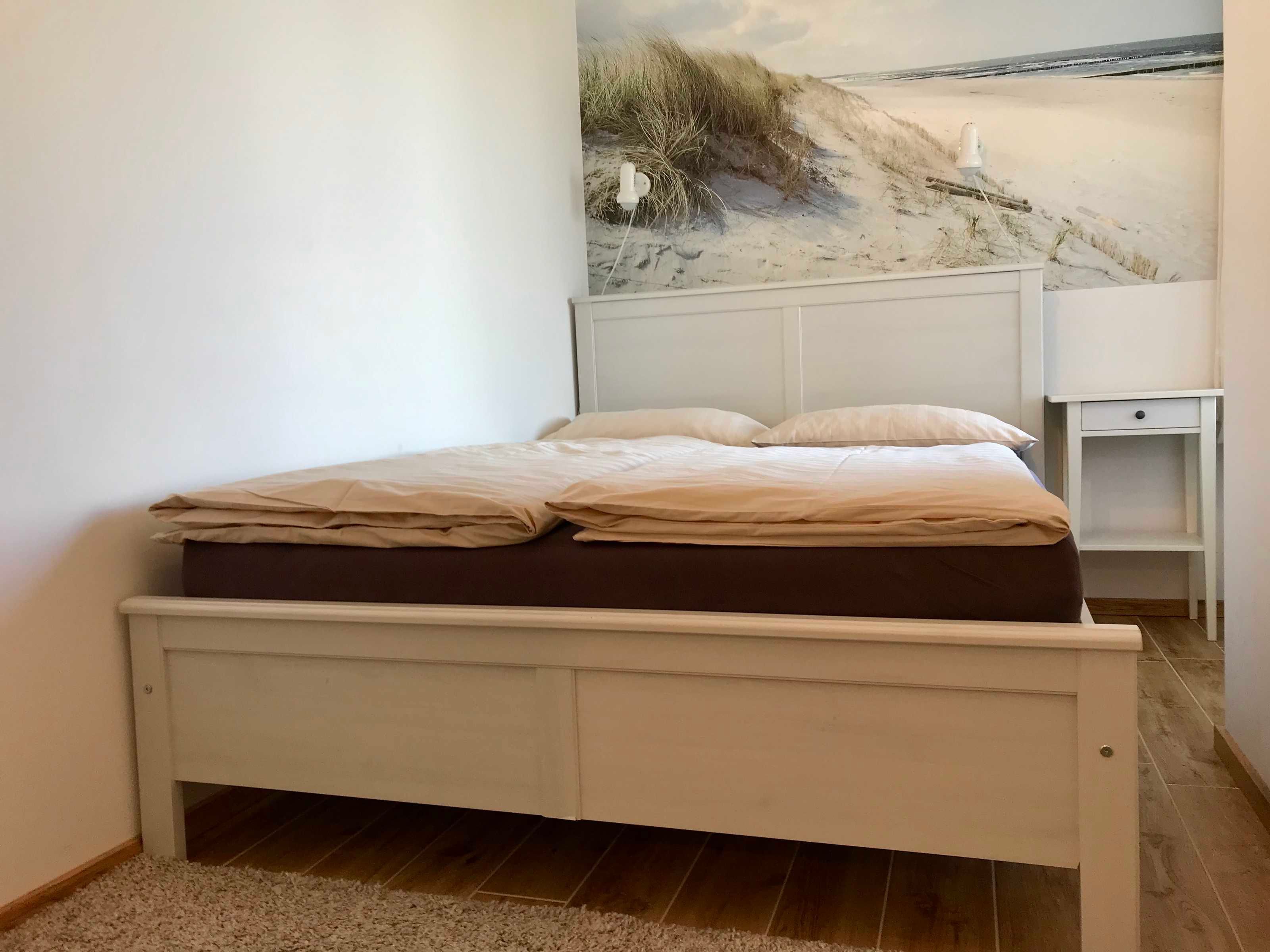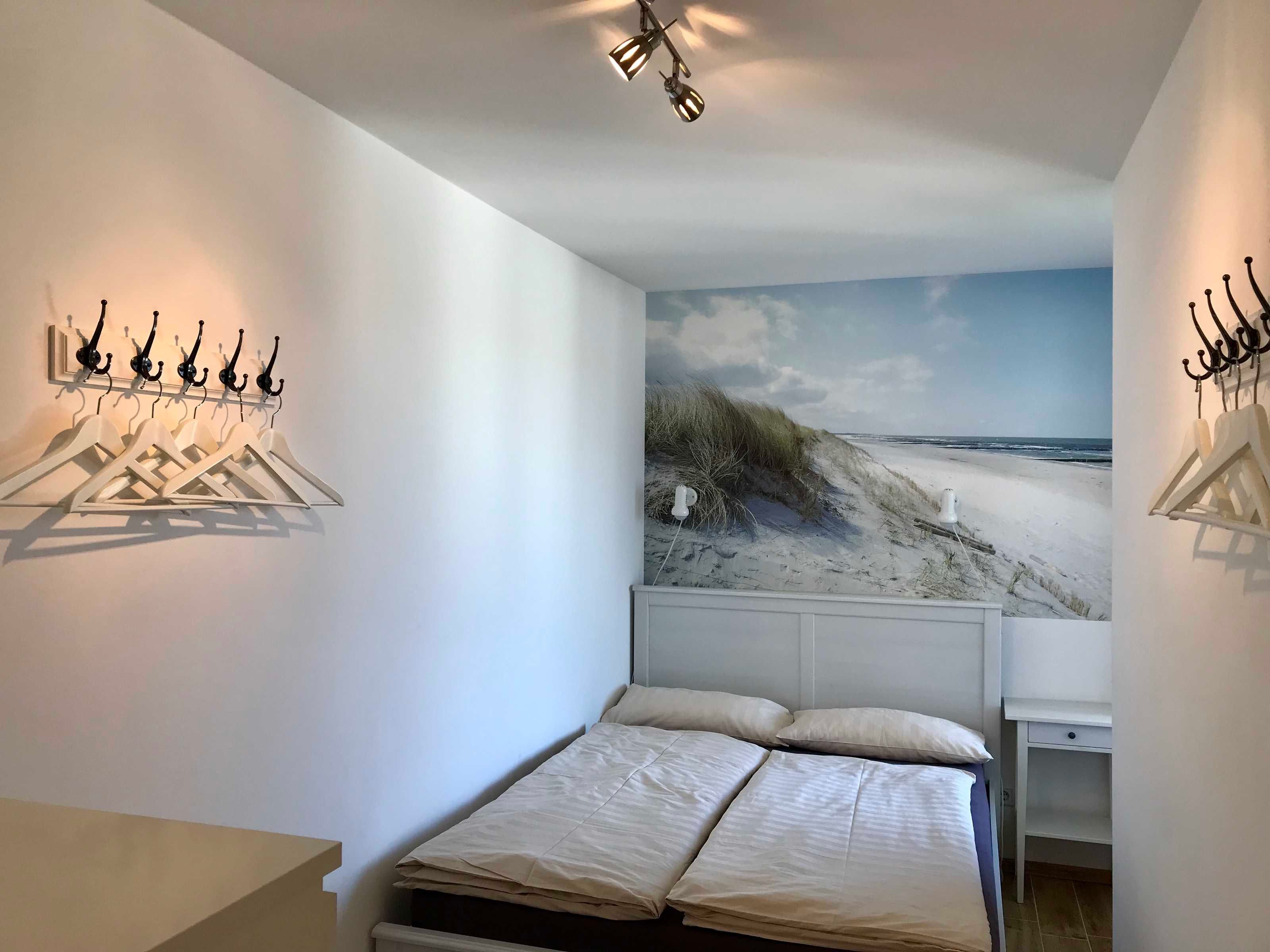 Im Schlafzimmer der Ferienwohnung steht ein kuscheliges Bett im Format 140x200 cm zum Ausruhen bereit mit 2 Bettdecken im Format 155x220. Besonderheit sind die Bettleuchten mit farbigen LED und Fernbedienung.