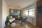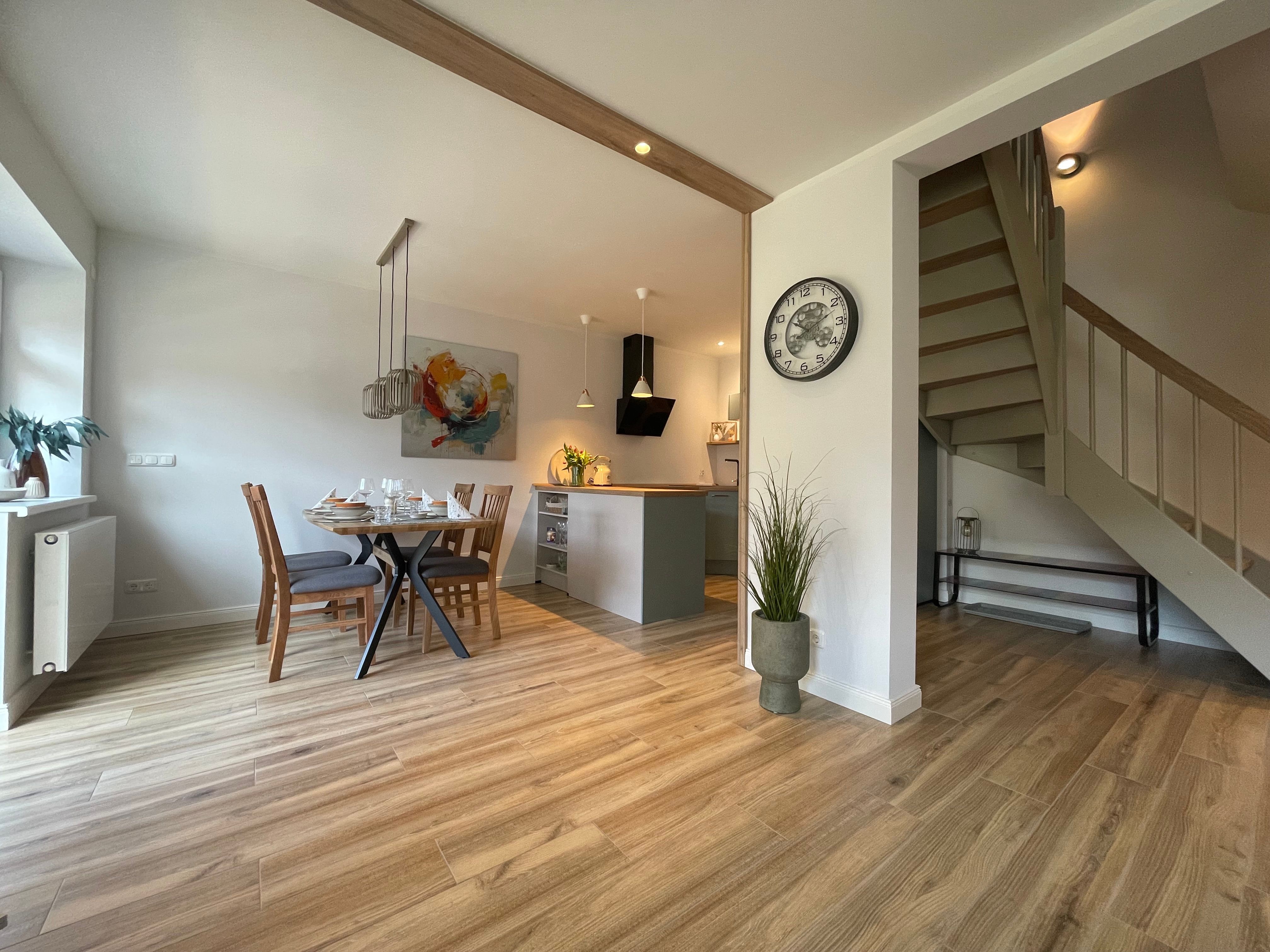 Im unteren Bereich erwartet Sie ein helles und freundliches Wohnzimmer, das mit modernen Möbeln und liebevollen Details ausgestattet ist. Hier können Sie entspannen, lesen oder gesellige Abende mit Freunden verbringen. Die offene Küche lädt zum Kochen ein und bietet alles, was Sie für Ihre kulinarischen Kreationen benötigen. Weiterhin befindet sich hier eine kleine Gästetoilette.