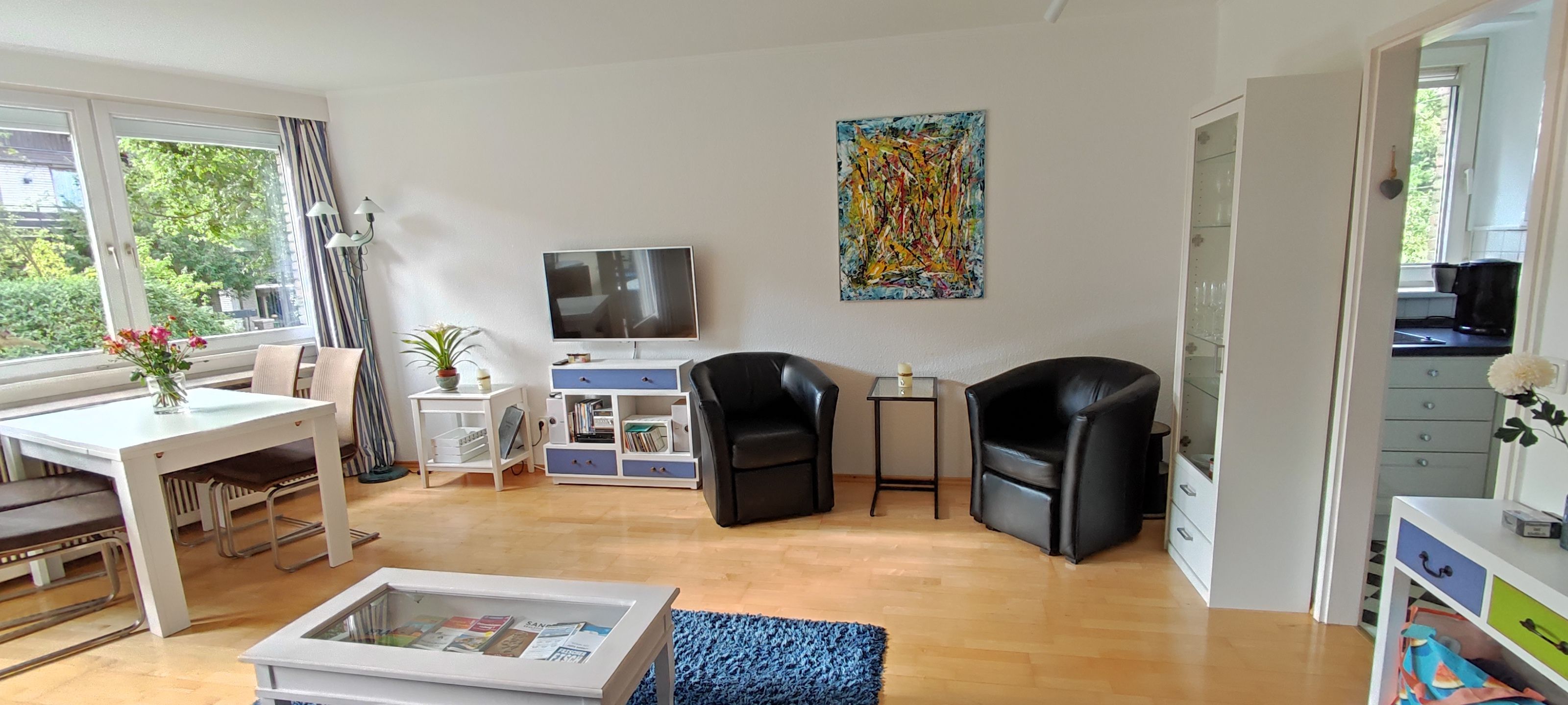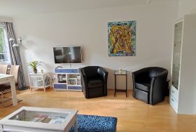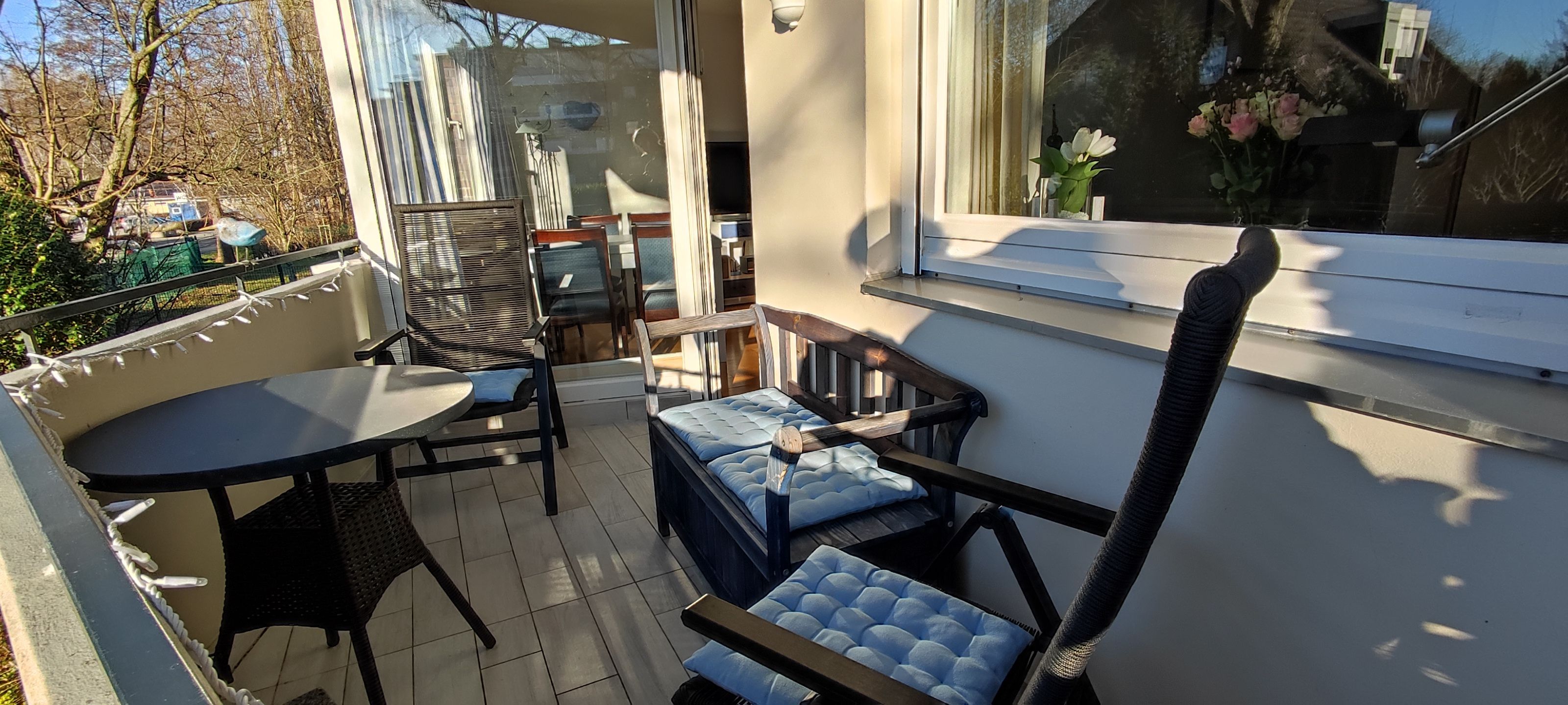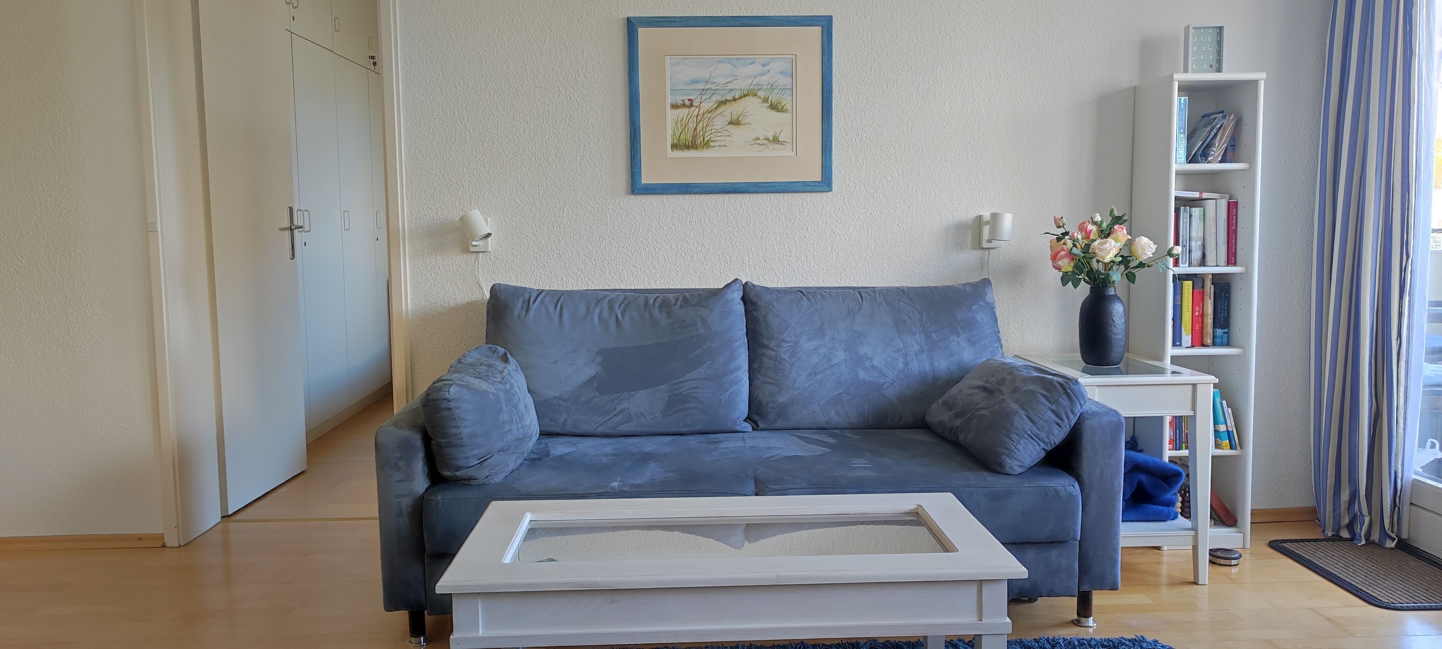 Unsere lichtdurchflutete 2 Zi-Wohnung liegt im EG und ist ohne Stufen zu erreichen. Der Wohnraum ist mit einem gemütlichen Schlafsofa, einem hellen Essbereich und einer Leseecke ausgestattet. Auf dem Balkon mit West-Ausrichtung, kann man bis zum Abend die Sonne genießen. Das Schlafzimmer mit einem Doppelbett 2 x 80 x 200cm und einem kleinen Schreibtisch bietet die Möglichkeit sich zurückzuziehen. In der Küche findet sich alles was für die Zubereitung einfacher Speisen benötigt wird.