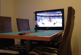 • Wohnzimmer mit bequemer Schlafcouch, Eßbereich und Fernseher