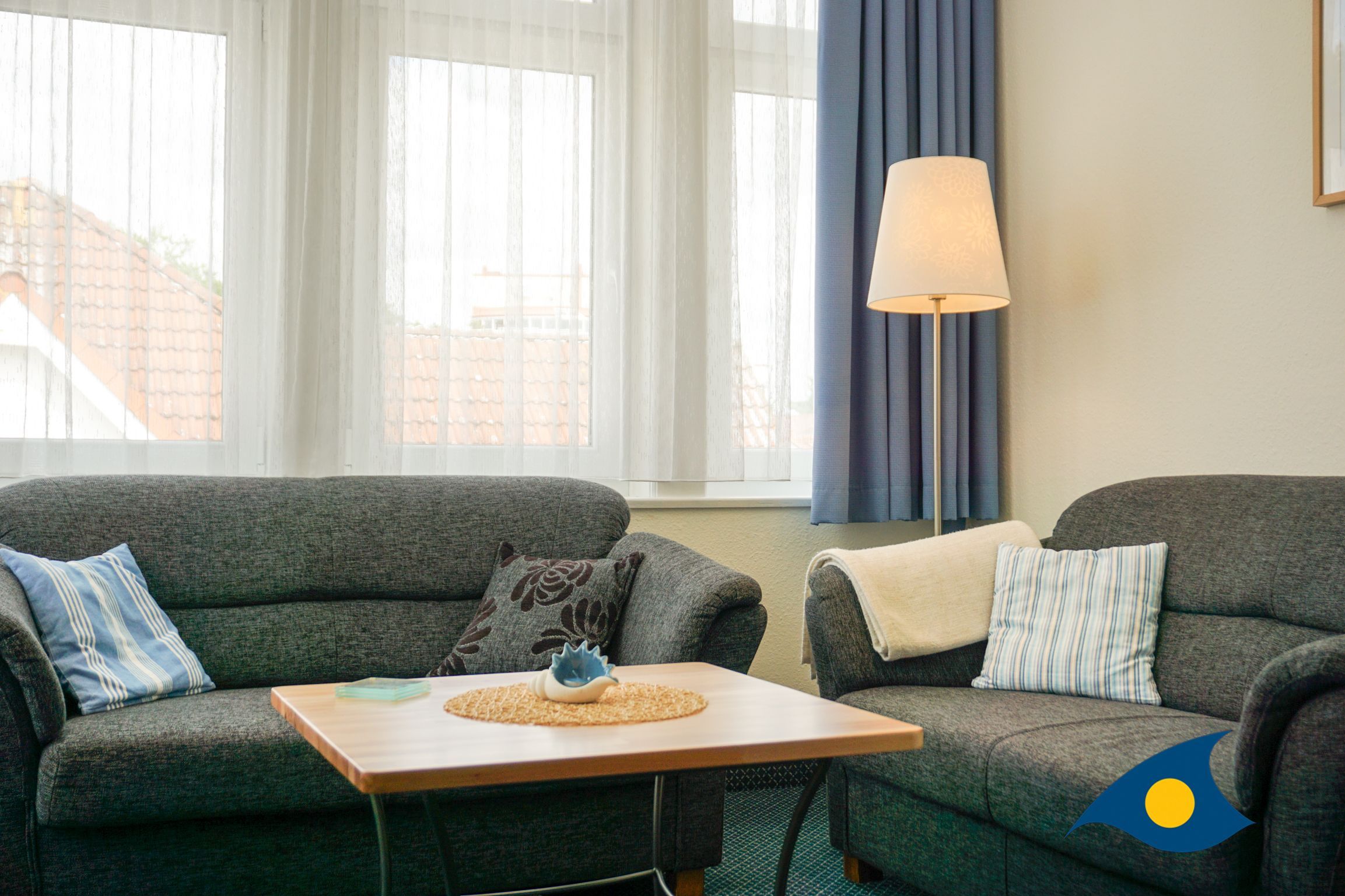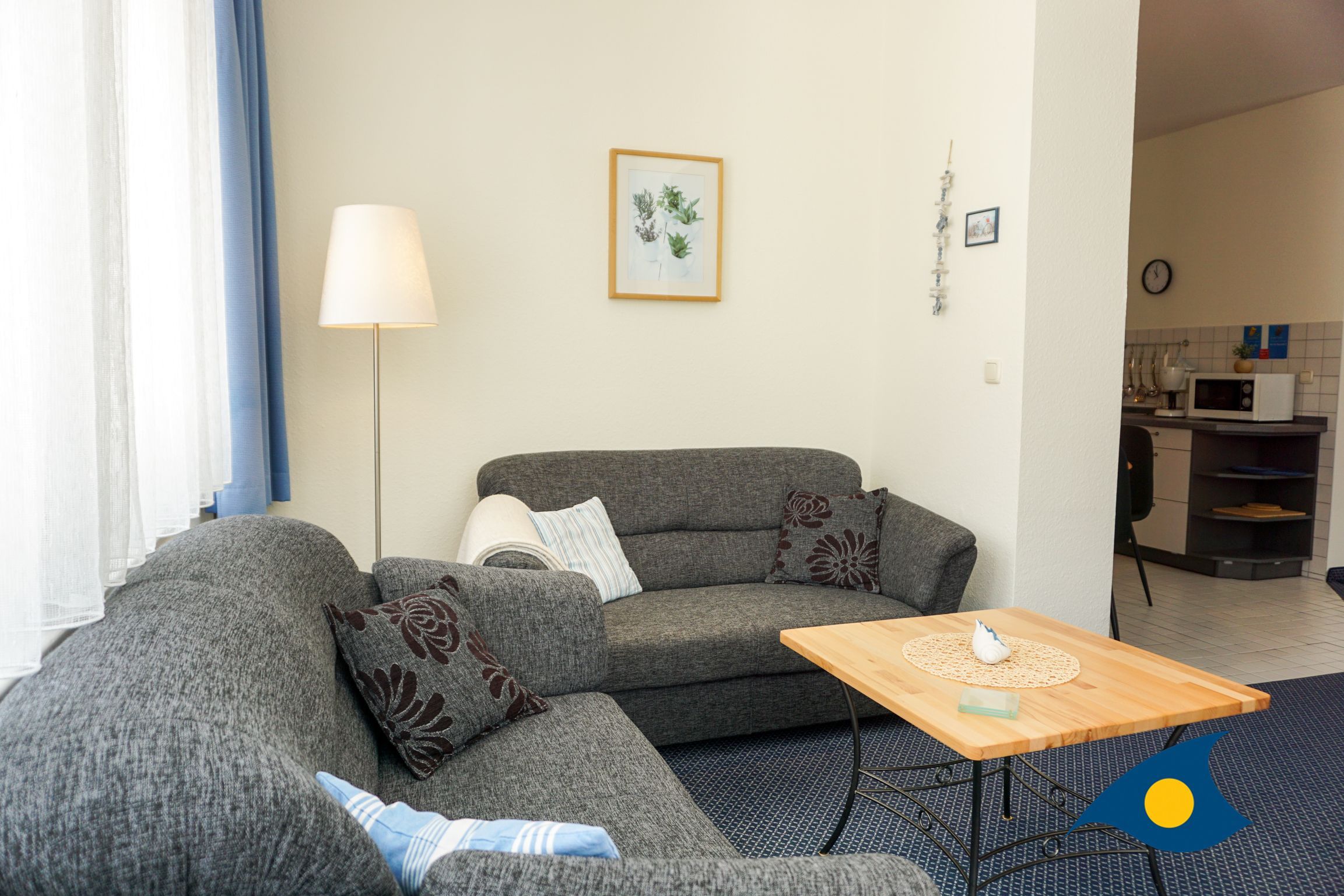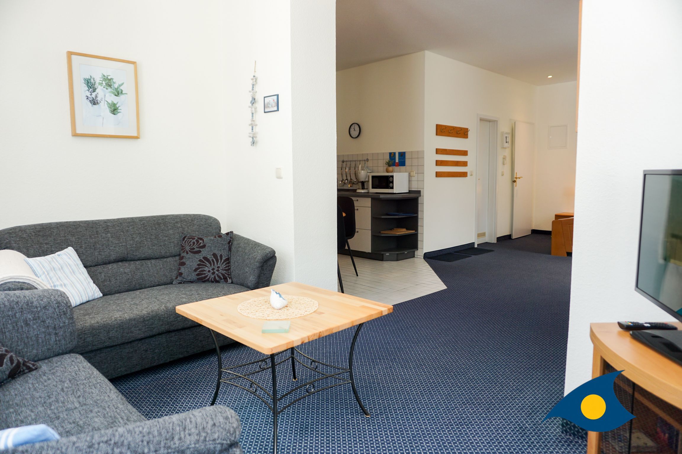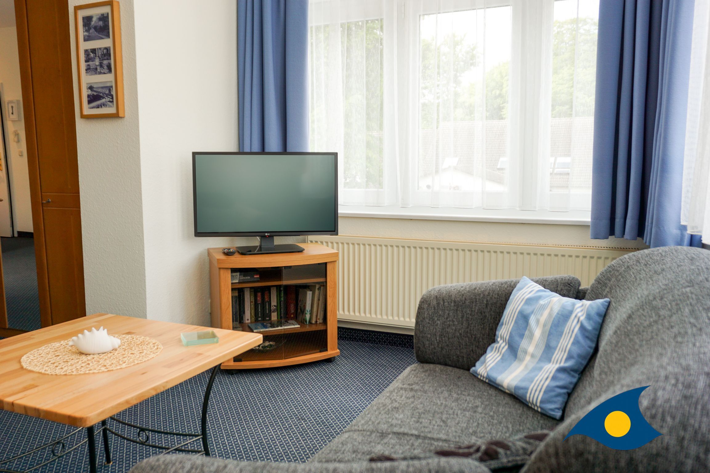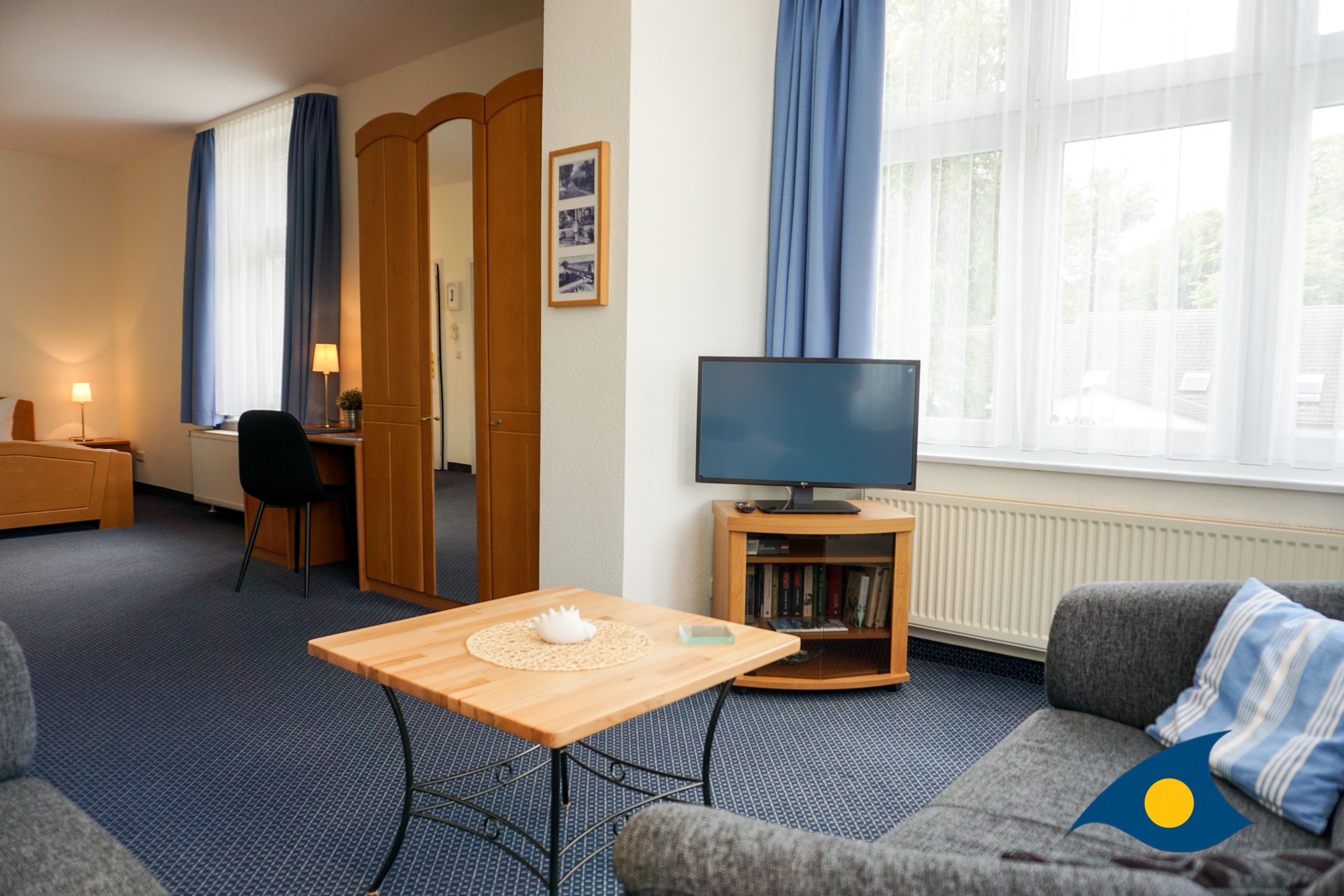Der kombinierte Wohn-  und Schlafbereich besticht durch seinen großzügigen Schnitt. Die gemütliche Couch-Ecke direkt am Fenster, läd zu entspannten Abenden nach langen Strandtagen ein. Für Unterhaltung sorgt ein moderner Smart-TV. Das komfortable Doppelbett (180x200) garantiert ruhige und erholsame Nächte.