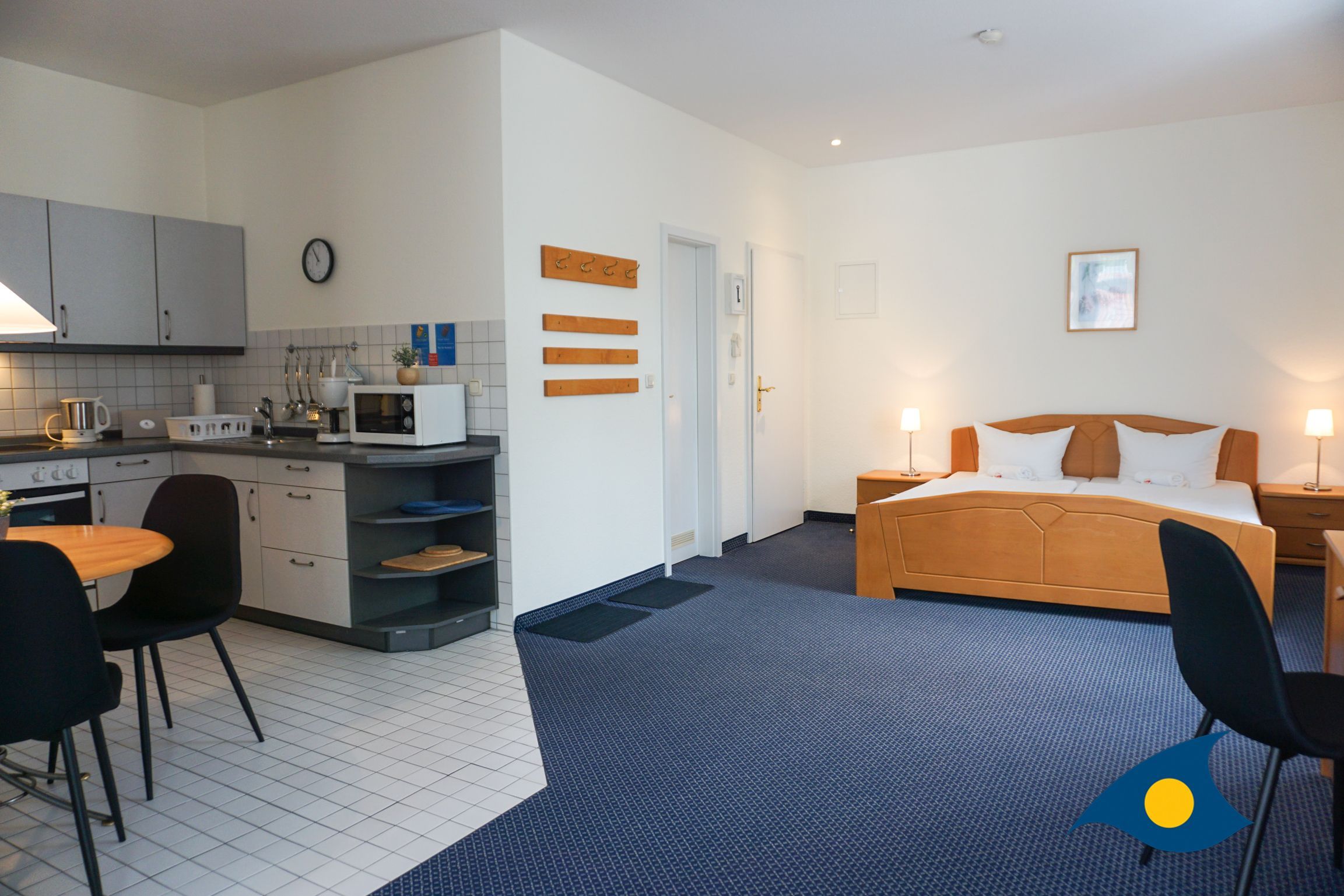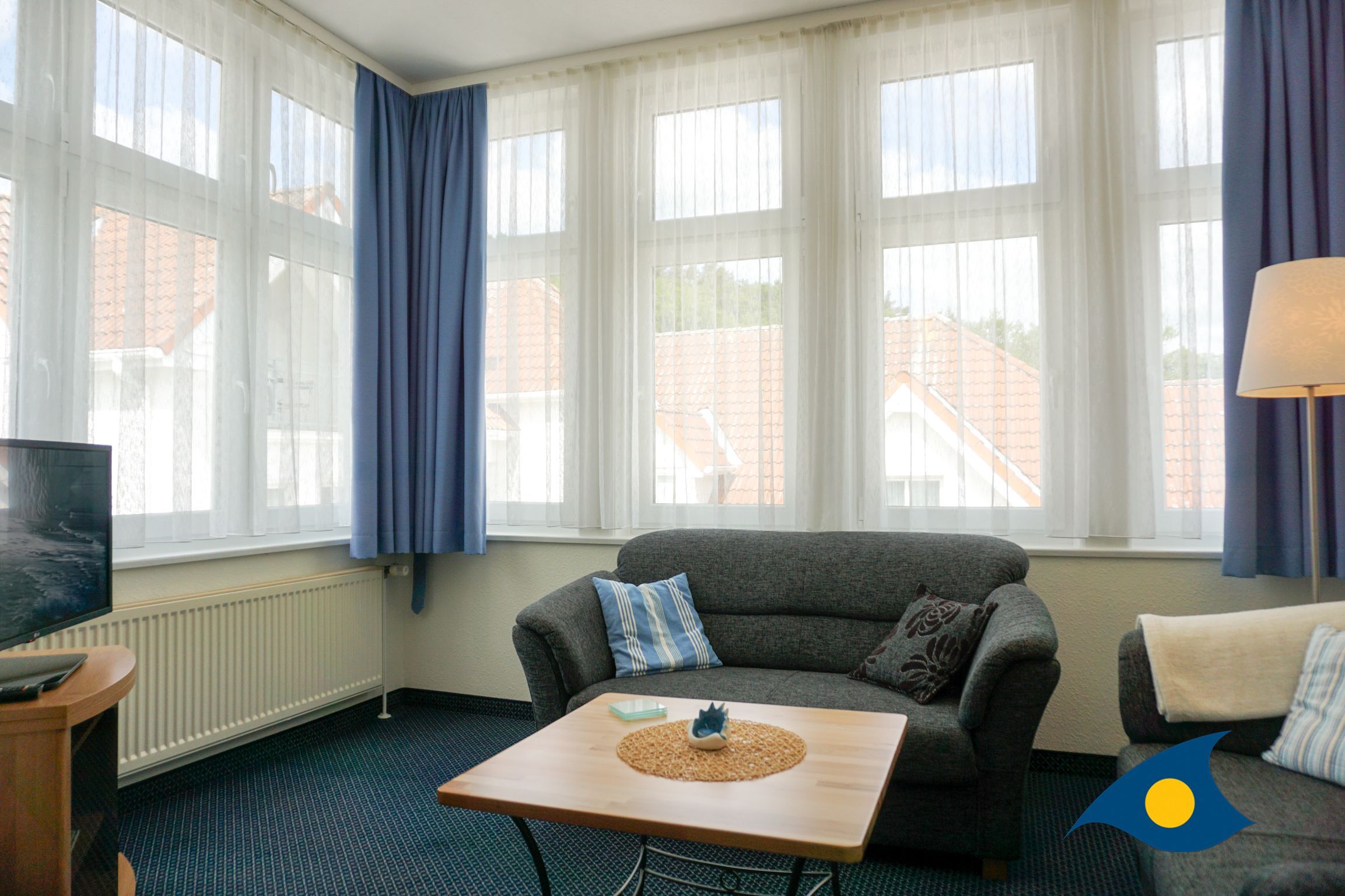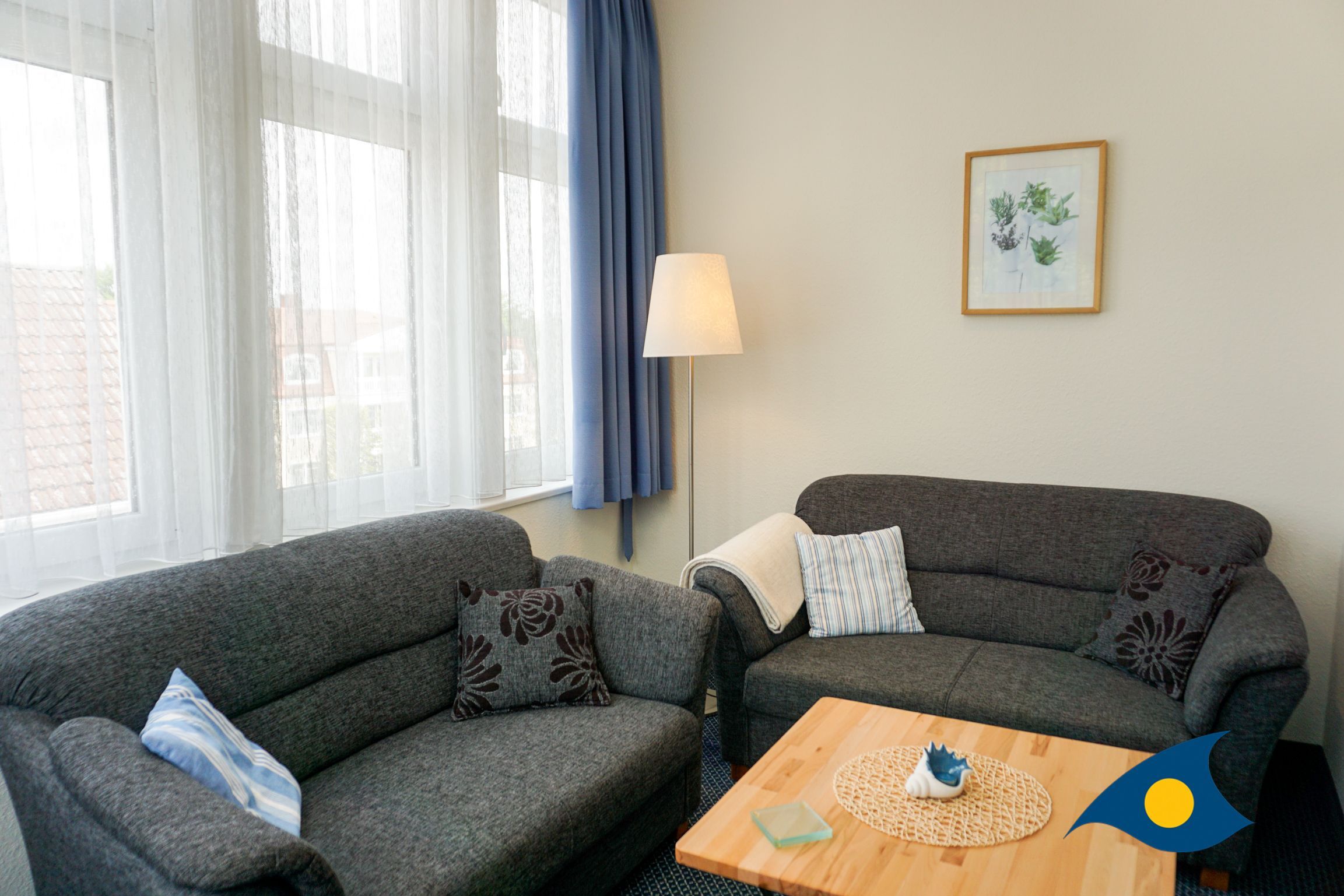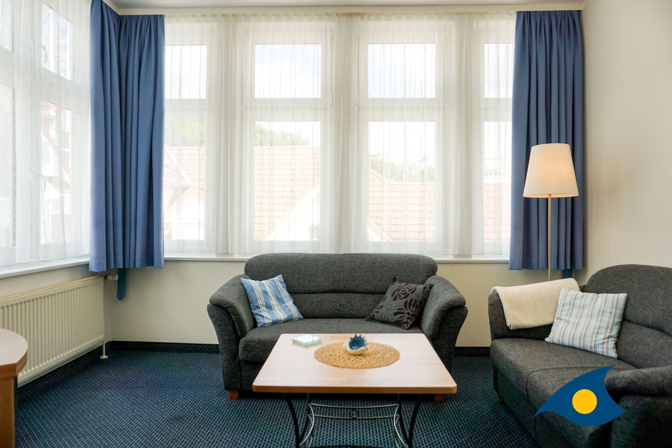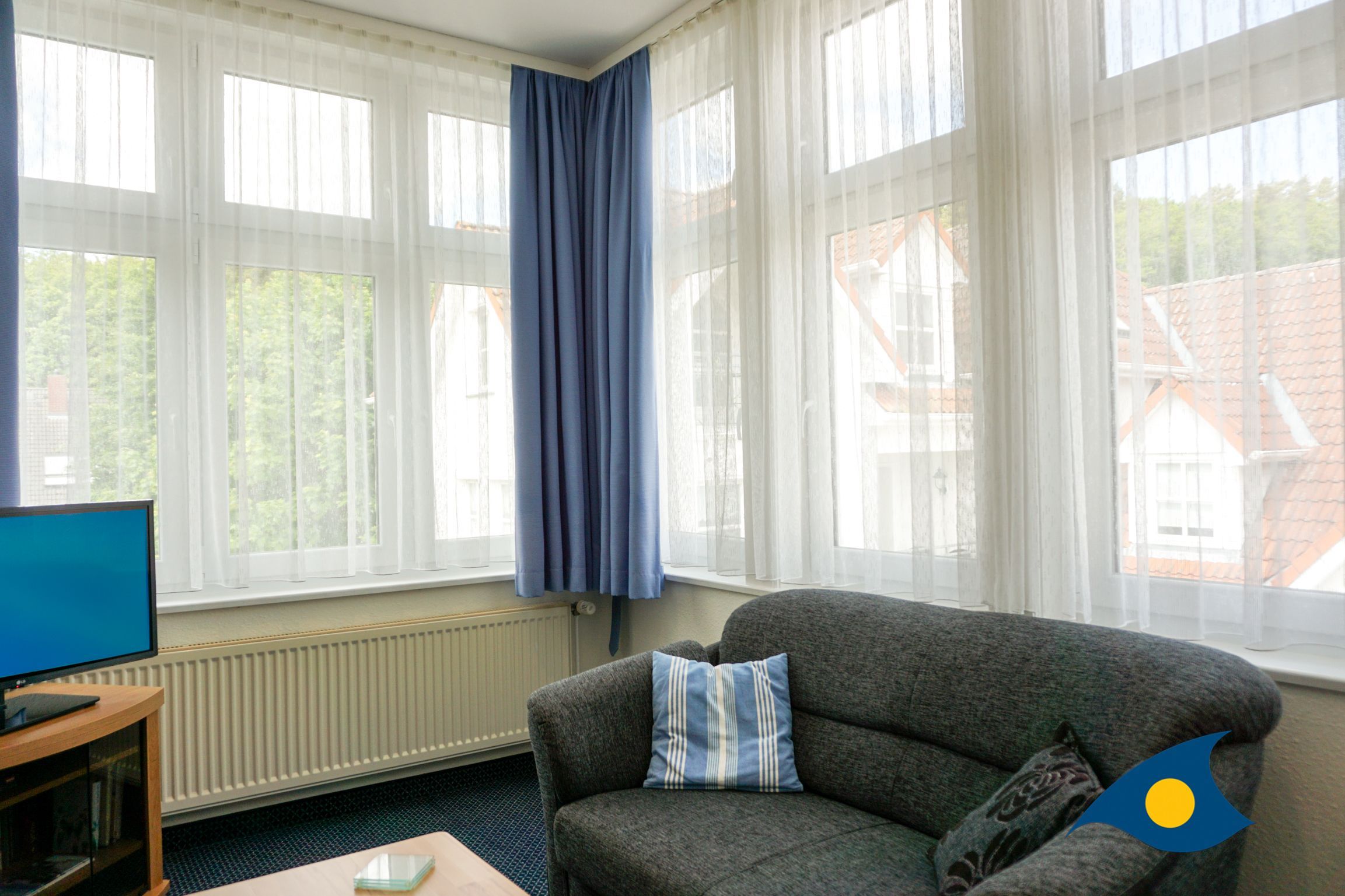 Der kombinierte Wohn-  und Schlafbereich besticht durch seinen großzügigen Schnitt. Die gemütliche Couch-Ecke direkt am Fenster, läd zu entspannten Abenden nach langen Strandtagen ein. Für Unterhaltung sorgt ein moderner Smart-TV. Das komfortable Doppelbett (180x200) garantiert ruhige und erholsame Nächte.
