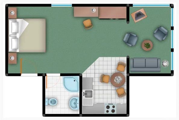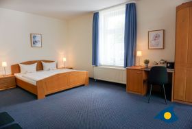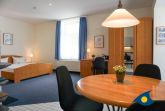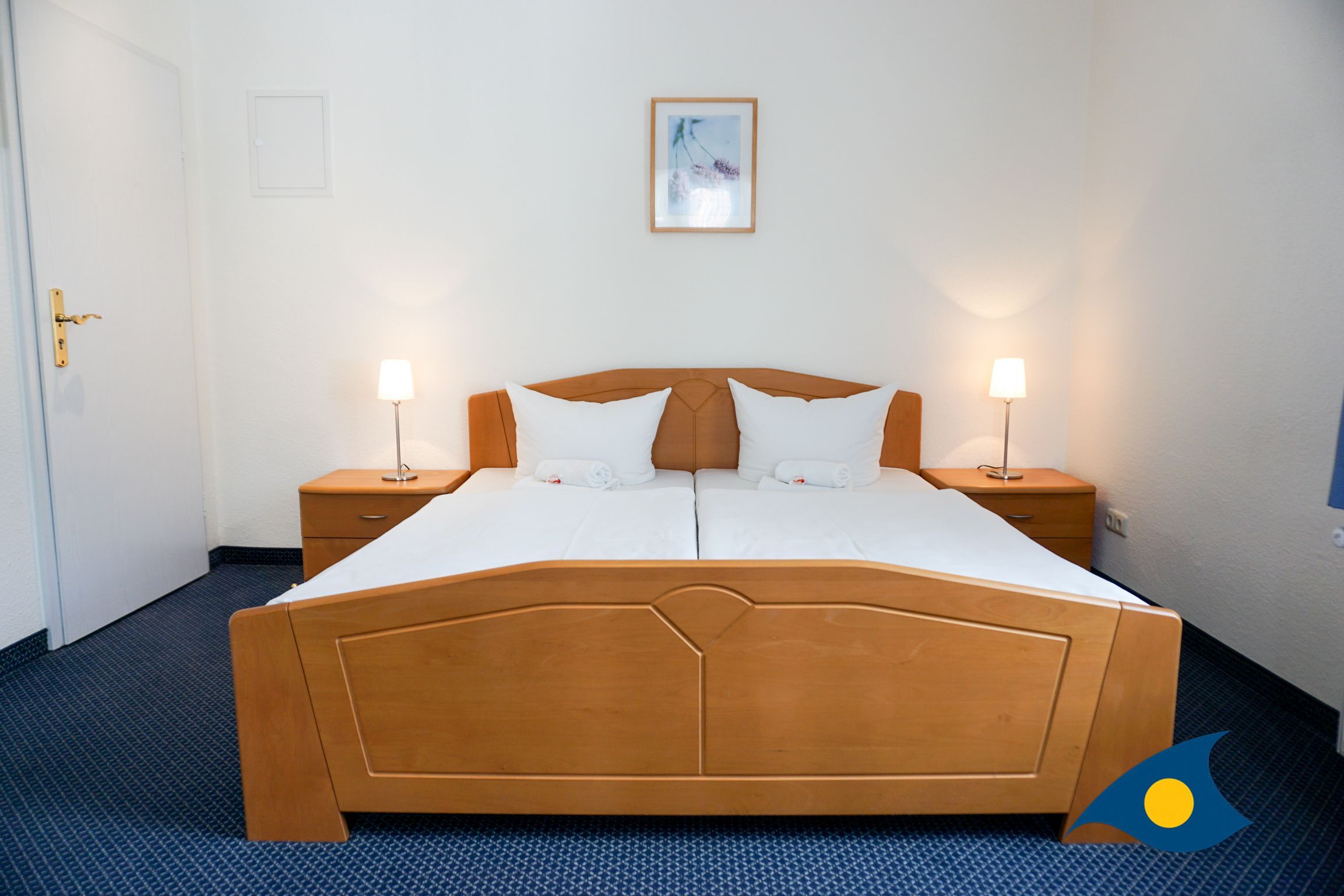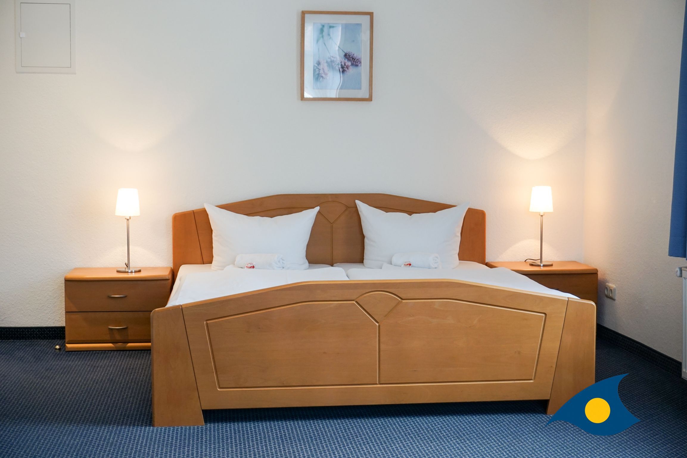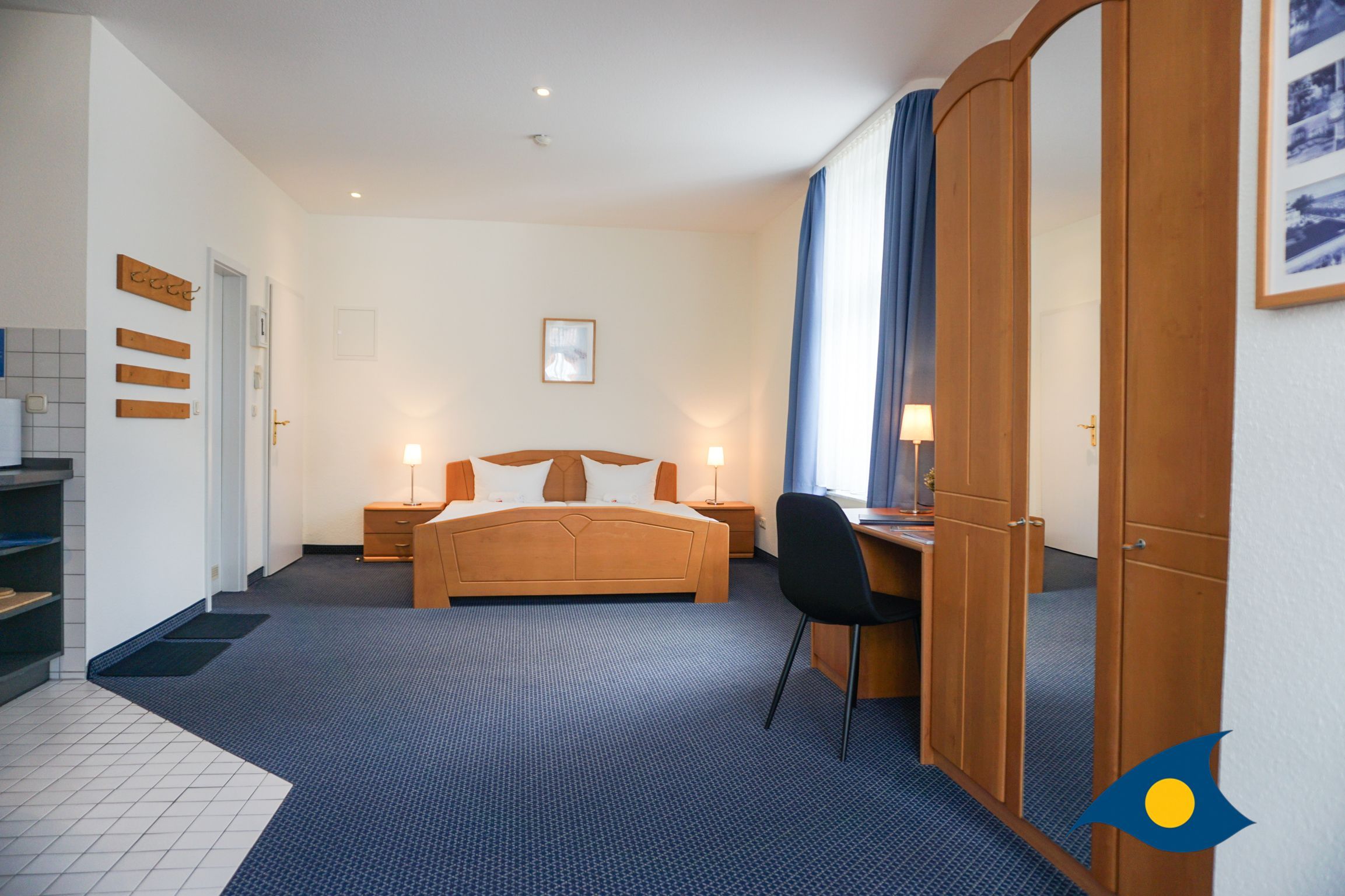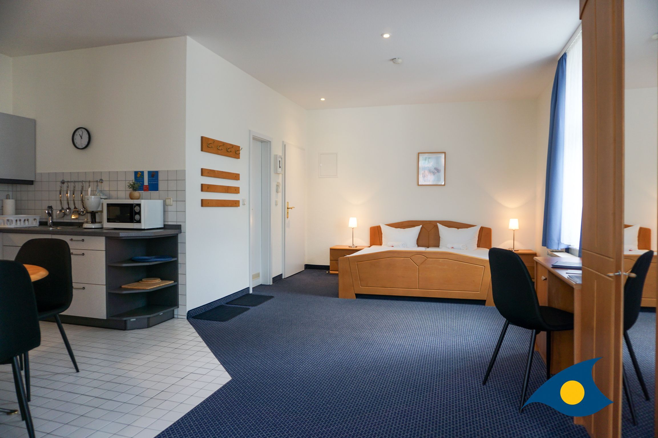 Der kombinierte Wohn-  und Schlafbereich besticht durch seinen großzügigen Schnitt. Die gemütliche Couch-Ecke direkt am Fenster, läd zu entspannten Abenden nach langen Strandtagen ein. Für Unterhaltung sorgt ein moderner Smart-TV. Das komfortable Doppelbett (180x200) garantiert ruhige und erholsame Nächte.