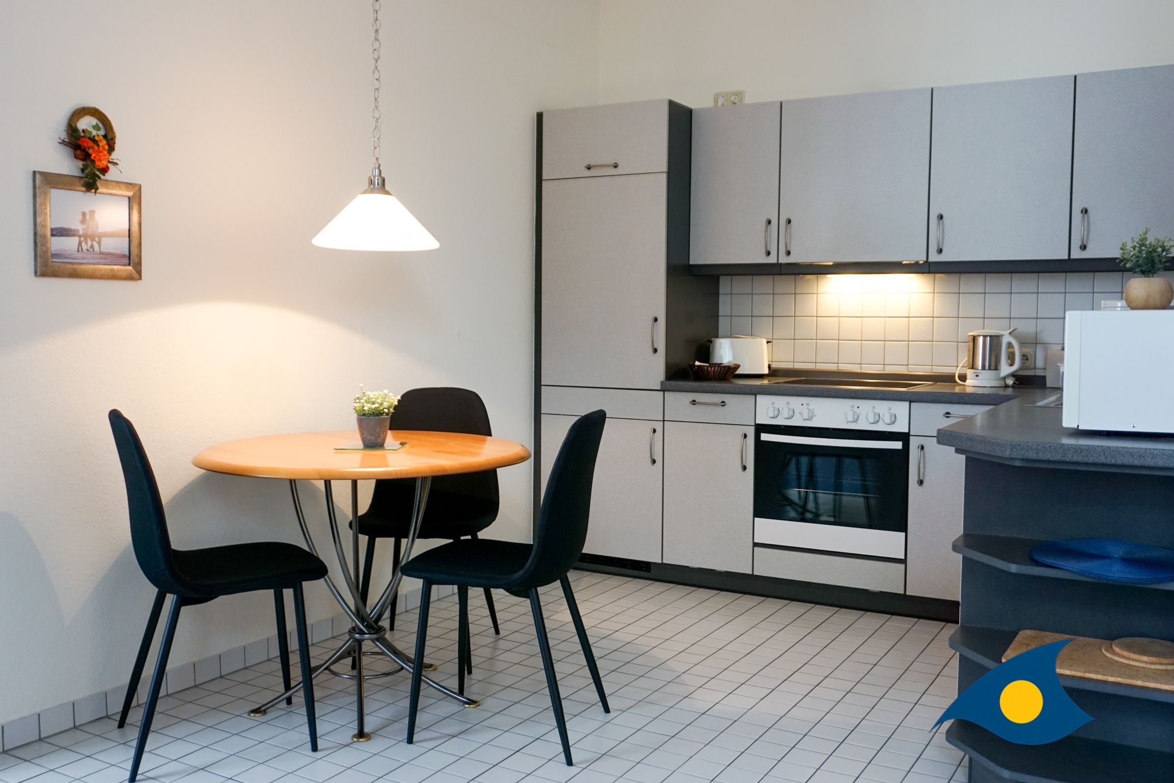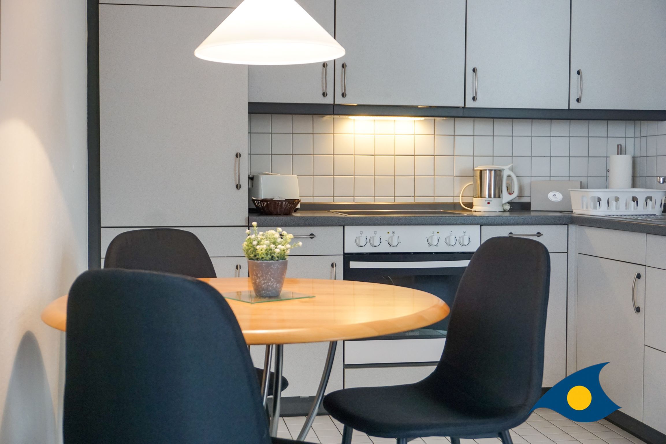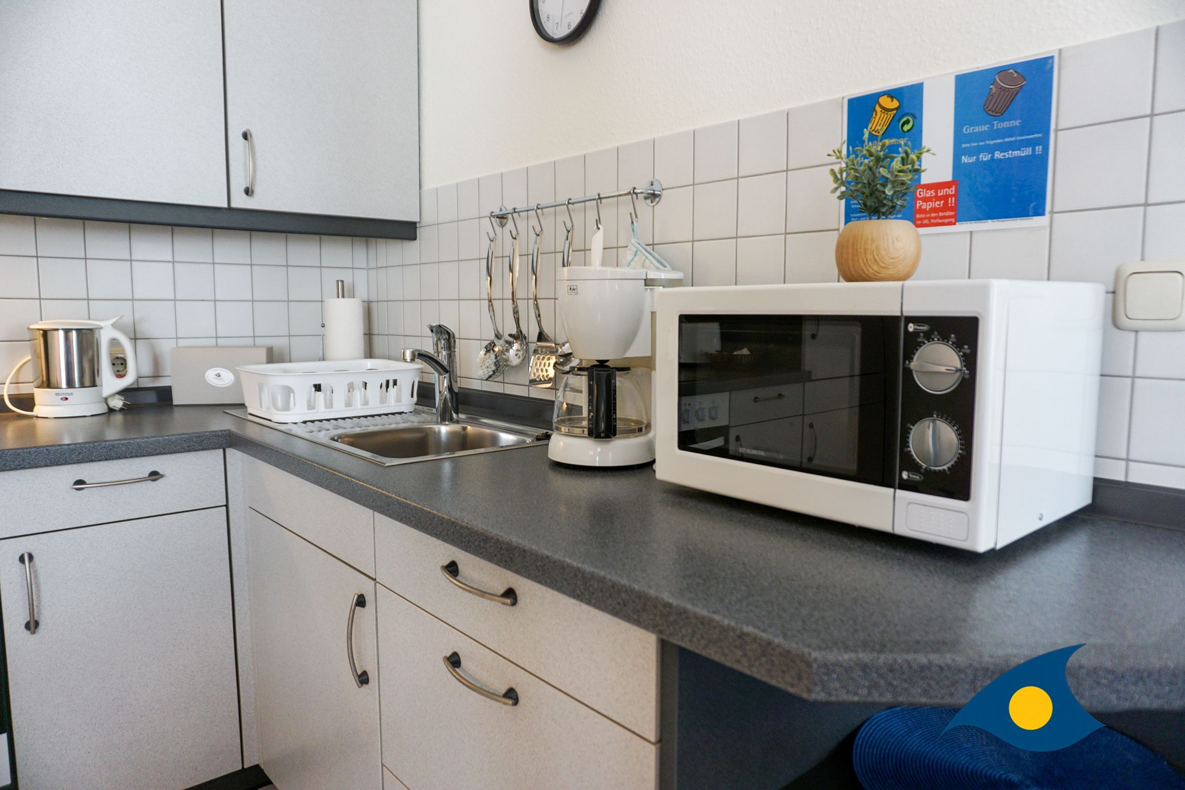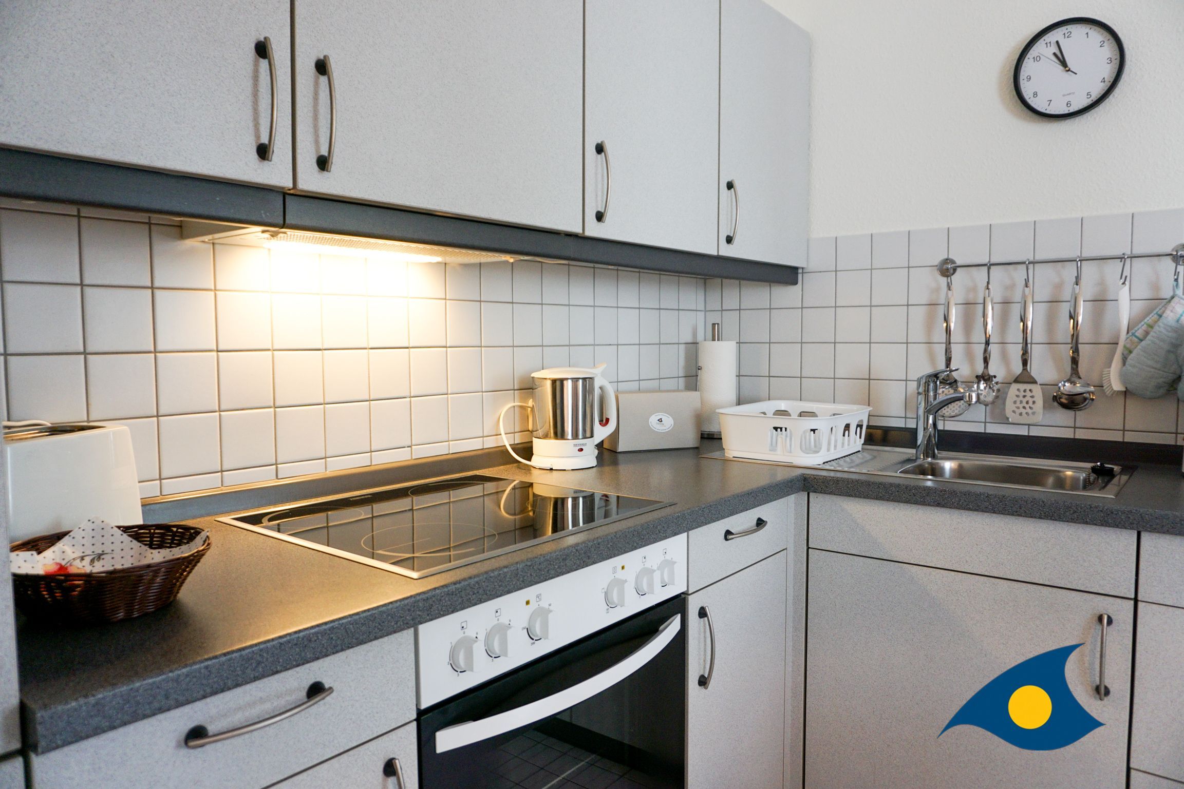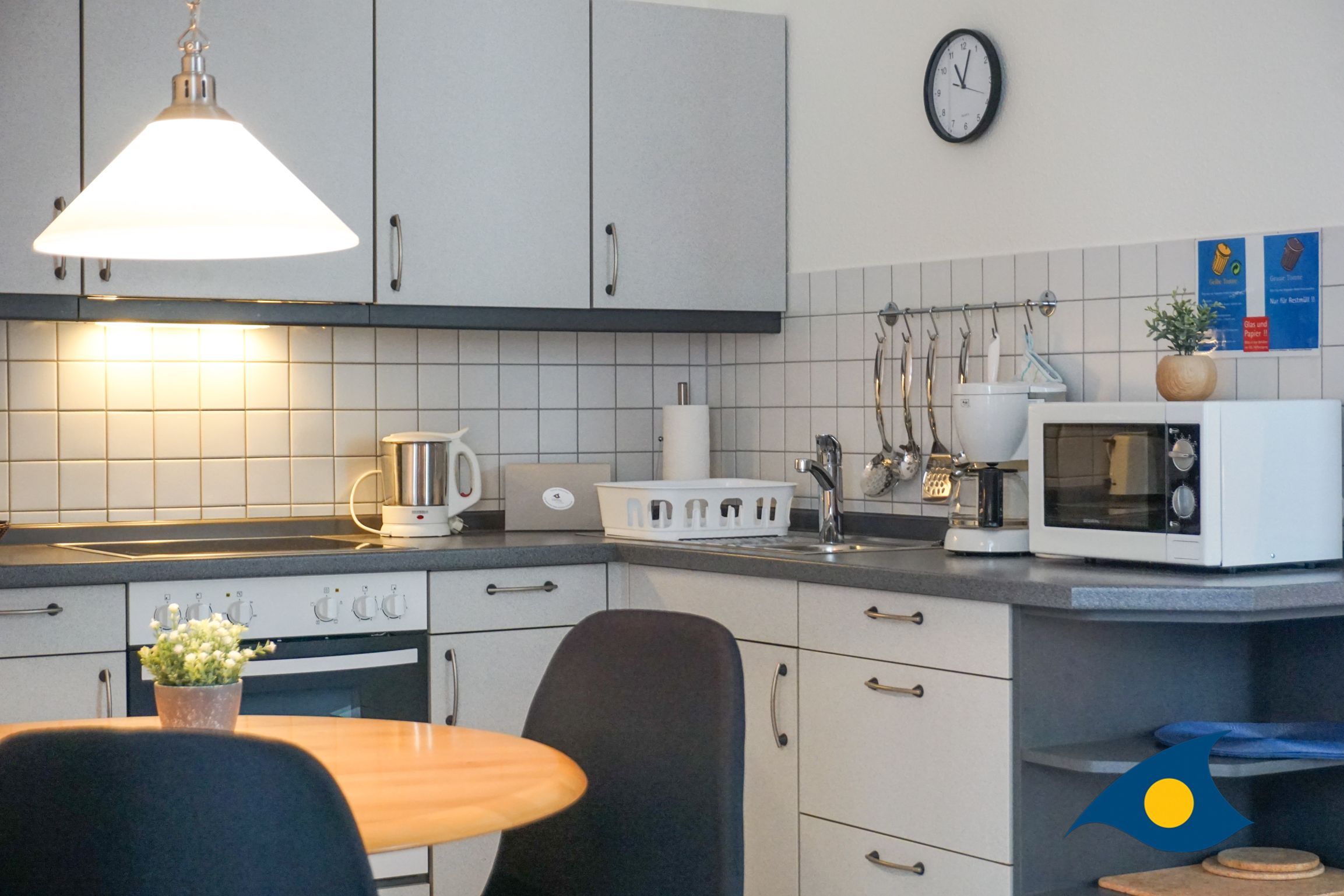 Die gut ausgestattete, etwas separierte Küche, verfügt über einen Herd mit Backofen, Kühlschrank mit Gefrierfach, Mikrowelle sowie Toaster, Wasserkocher und Kaffeemaschine.