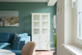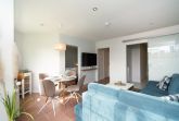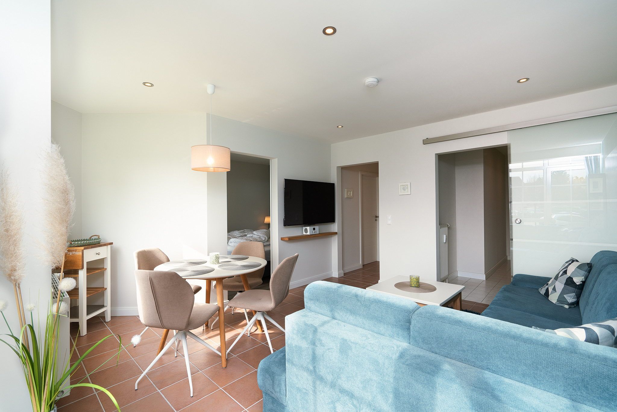 Lichtdurchfluteter freundlicher Wohn-Essbereich. Das Wohnzimmer ist mit einer gemütlichen Schlafcouch ausgestattet, diese lässt sich mit wenigen Handgriffen zu einer vollwertigen Schlafmöglichkeit ausklappen. Die Liegefläche hat 140x200cm und verfügt über einen Lattenrost sowie eine vollwertige Matratze. Der Esstisch bietet Platz für 4 Personen. Zur Unterhaltung steht ein Flachbildfernseher. Der Raum lässt sich durch Plissee und Vorhänge verdunkeln. Der Boden ist mit Fliesen ausgelegt.