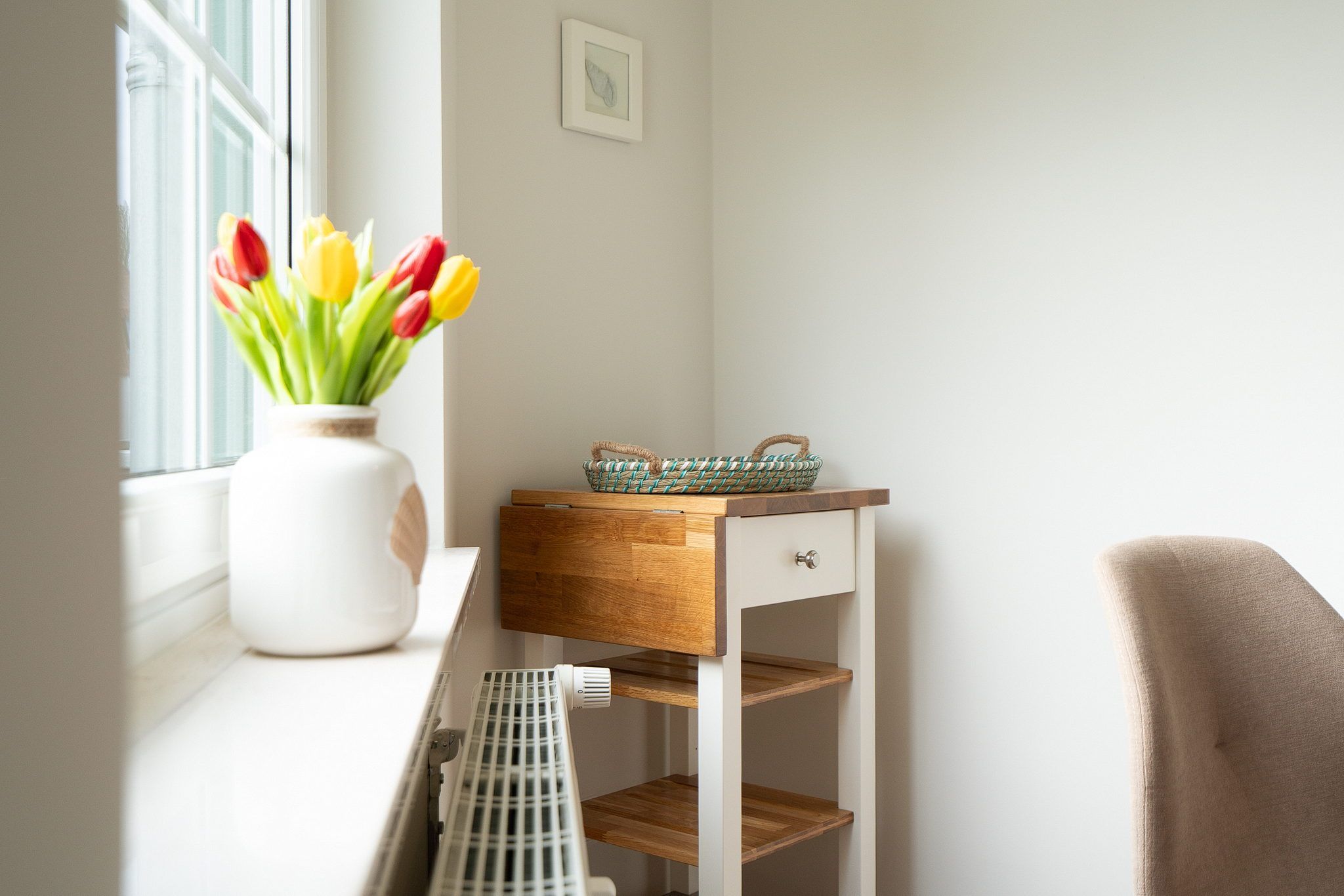 Separate Küche mit 4 Platten-Cerankochfeld, Kühlschrank mit Gefrierfach, Spülmaschine, Backofen und Mikrowelle. Ein Wasserkocher, Kaffeemaschine und Toaster gehören ebenfalls zur Ausstattung.