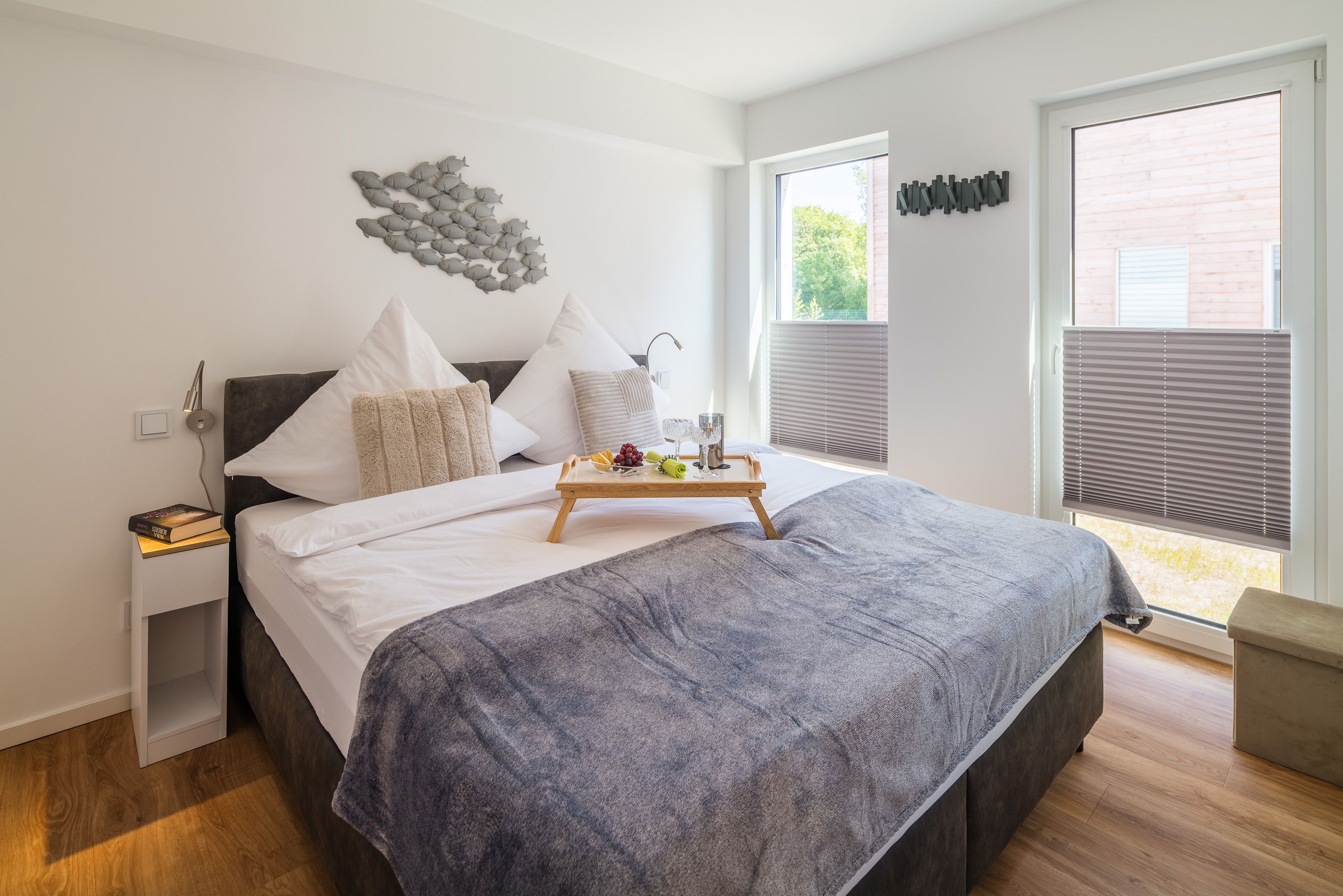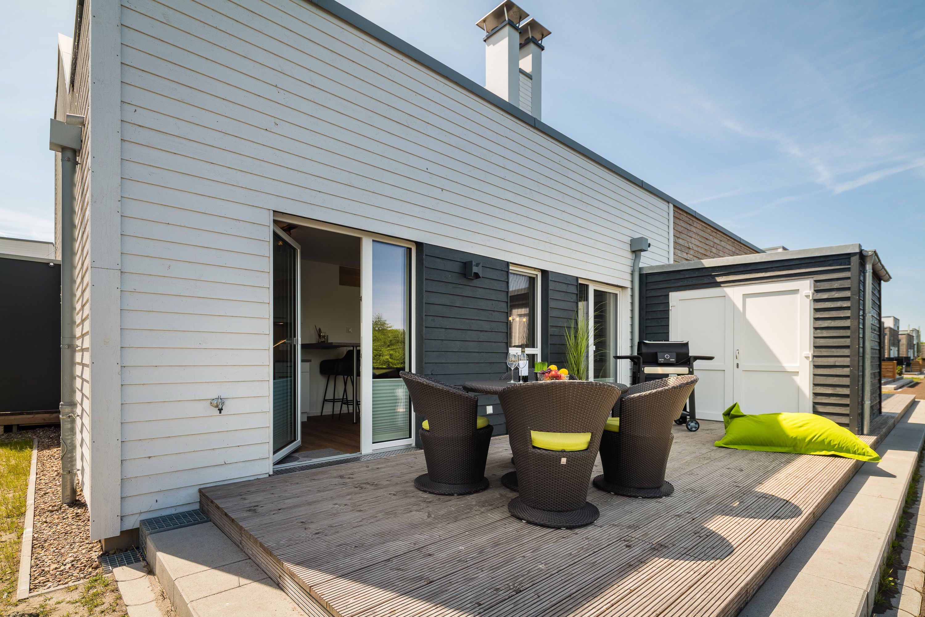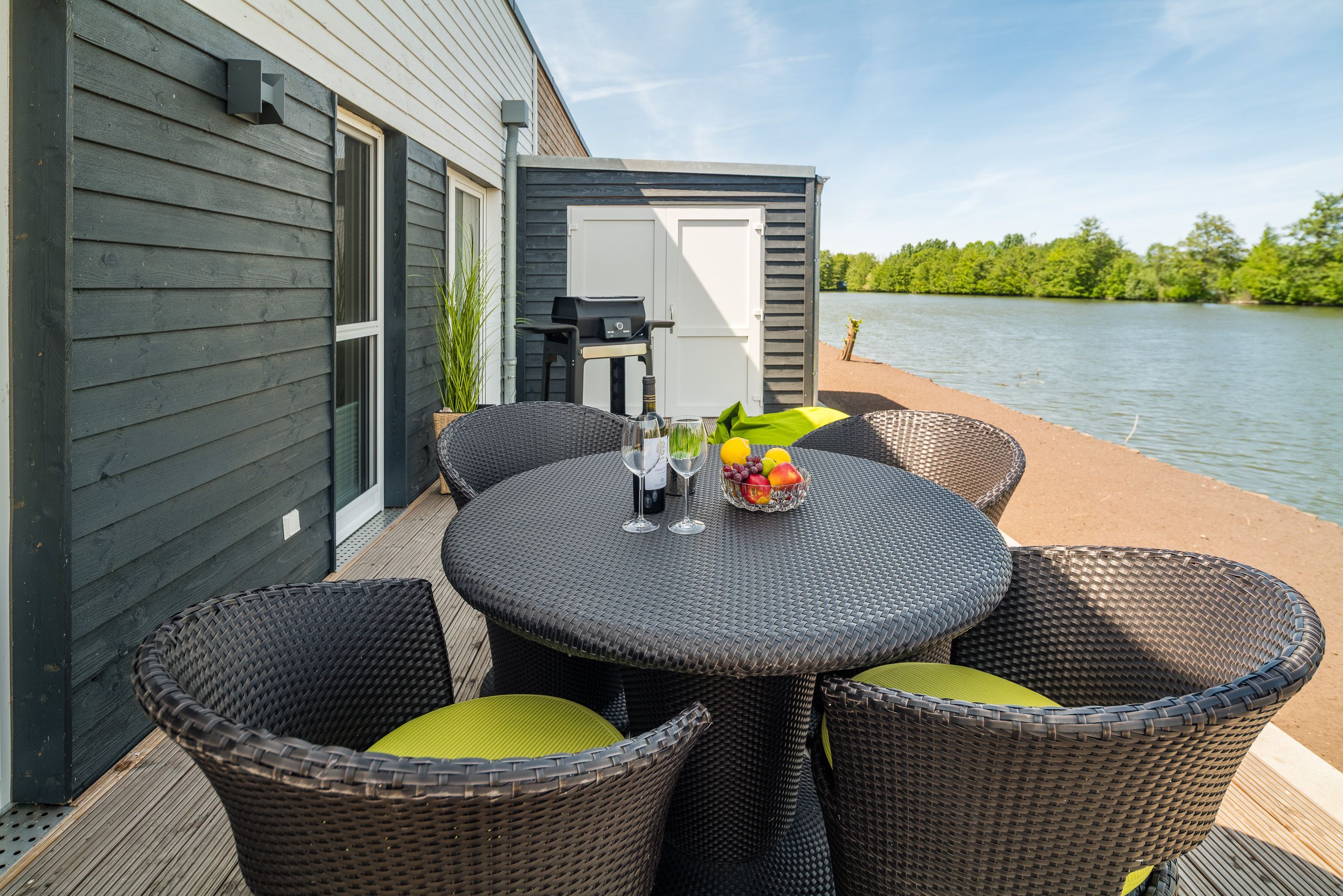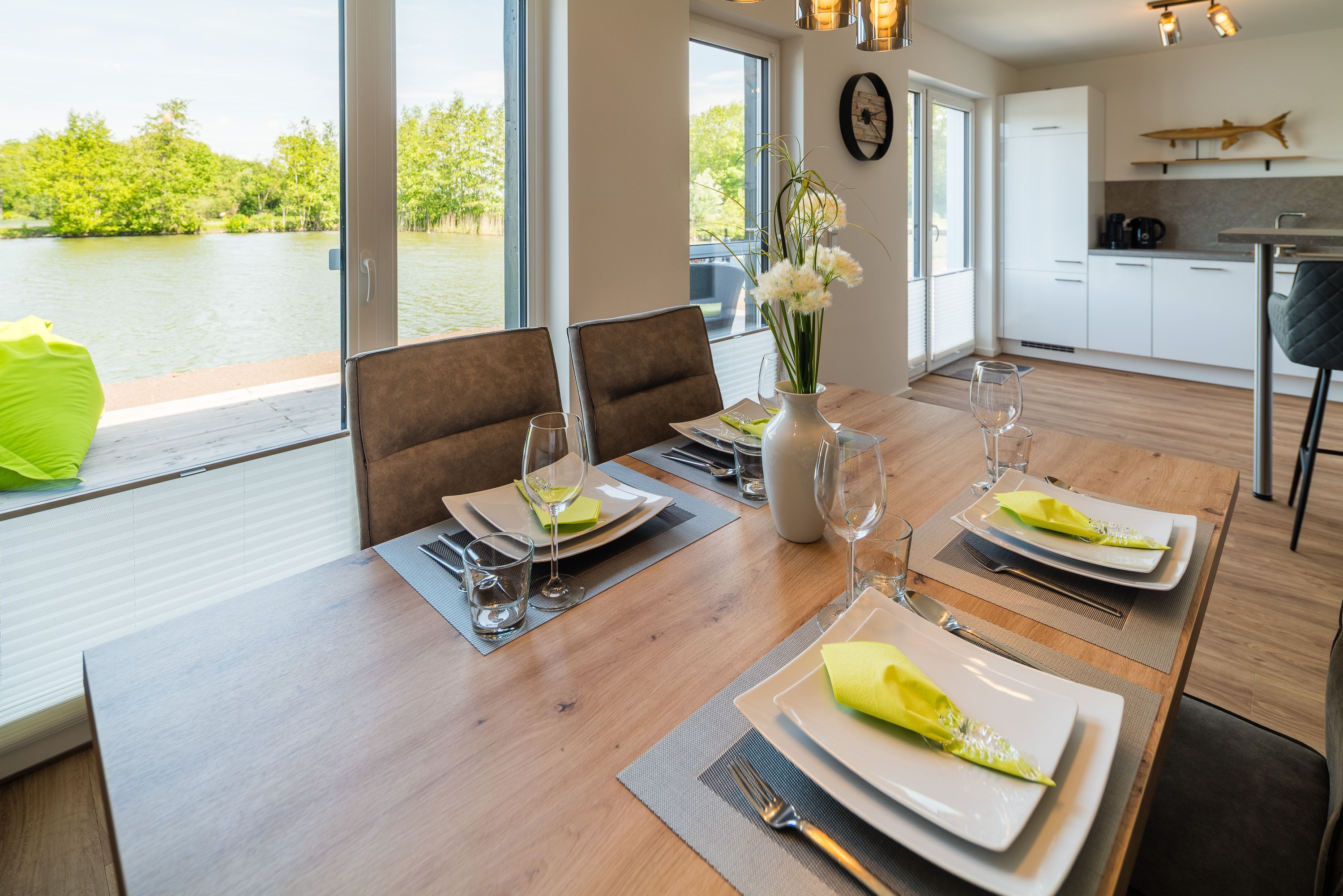 Unser großzügiges Ferienhaus bietet Platz für bis zu vier Personen. Es verfügt über zwei gemütliche Schlafzimmer, ein modernes Badezimmer und einen offenen Wohnbereich mit voll ausgestatteter Küche. Der lichtdurchflutete Wohnraum ist der ideale Ort, um nach einem ereignisreichen Tag zu entspannen. Die große Terrasse mit Blick auf den See lädt dazu ein, den Sonnenuntergang bei einem Glas Wein zu genießen.