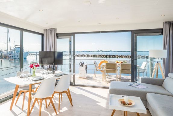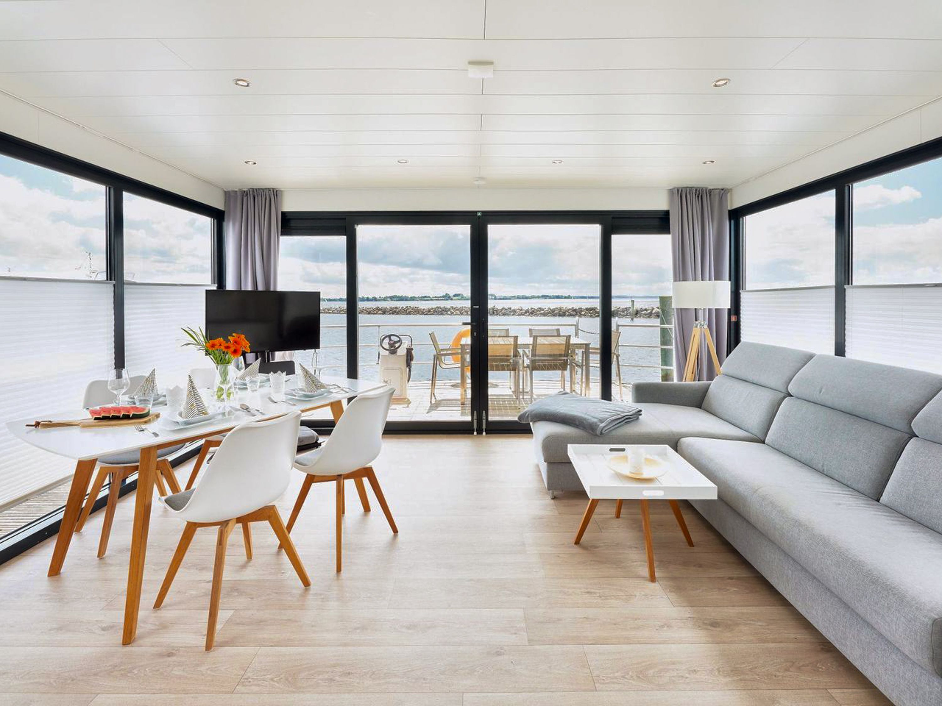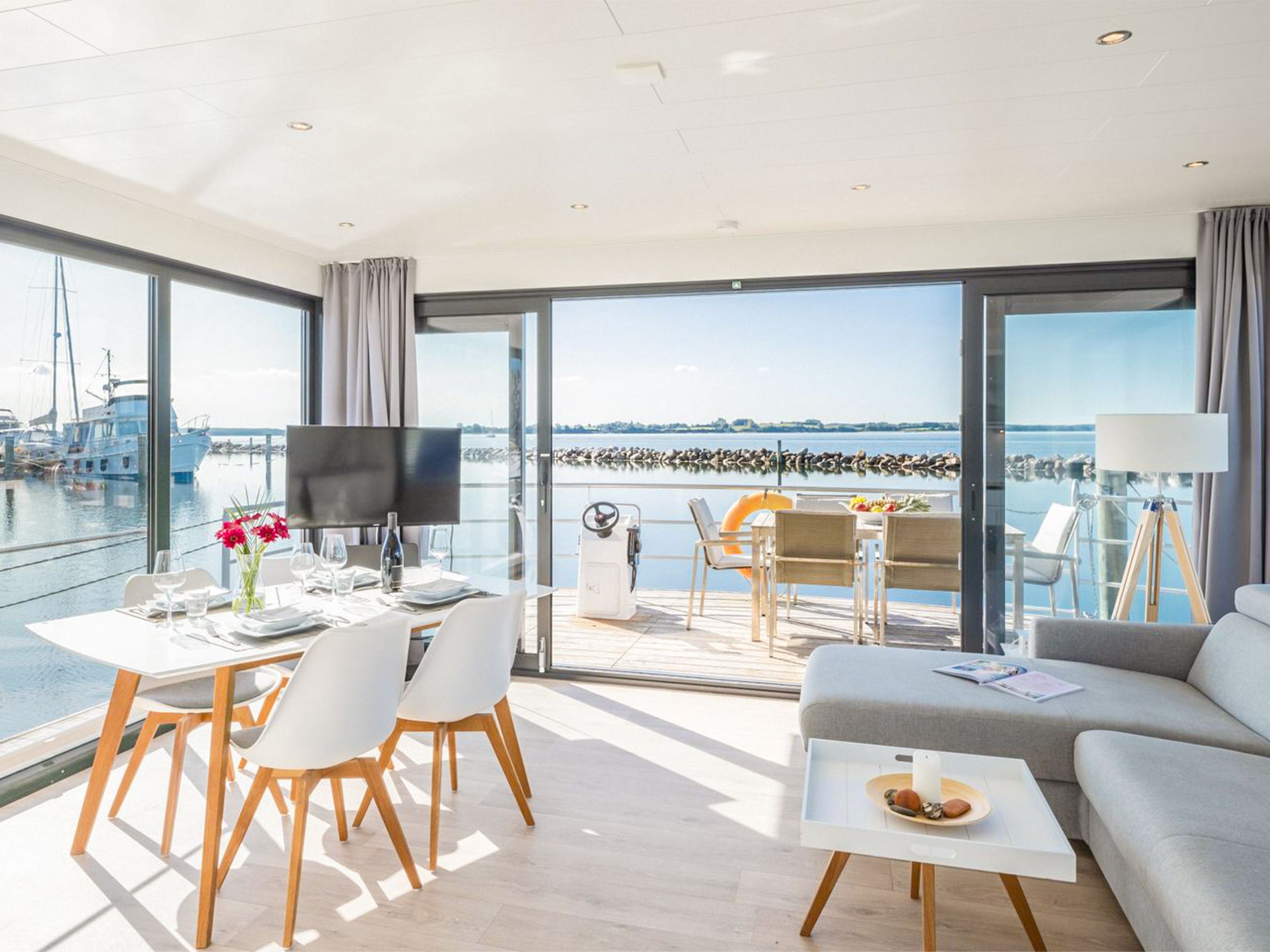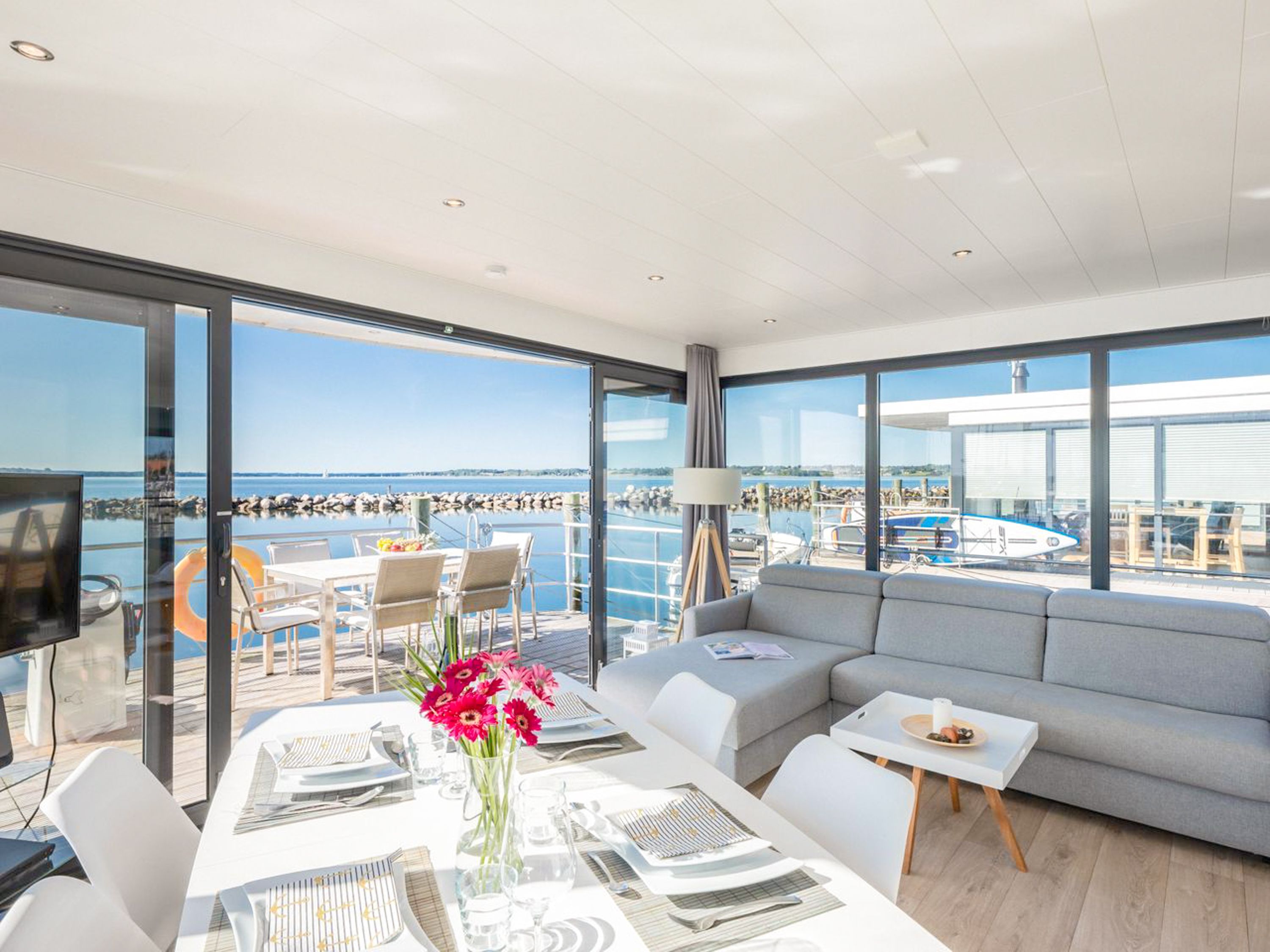 Modern, lichtdurchflutet und liebevoll eingerichtet das Floating House Fjordblik ist ein echtes Raumwunder auf 44m². Dieses festliegende Hausboot bietet dir ein Urlaubszuhause mit klarer Linie, maritimer Leichtigkeit und allem Komfort, den du brauchst, um dich rundum wohlzufühlen. Platz ist für bis zu 6 Personen, aufgeteilt in zwei separate Schlafzimmer und einen offenen Wohnbereich. Der Wohn- und Essbereich ist das Herzstück des Hausboots: Großzügige Fensterfronten lassen das Licht hereinströmen und schenken dir vom Sofa oder Esstisch aus einen wunderbaren Blick auf den Hafen. Die offene Küche ist stilvoll in den Raum integriert und komplett ausgestattet mit Ceranfeld, Mikrowelle, Kühlschrank mit Gefrierfach, Spülmaschine, Kaffeemaschine, Wasserkocher und Toaster. Ob Frühstück mit Blick aufs Wasser oder ein Glas Wein zum Sonnenuntergang hier wird selbst das Kochen zum Urlaubsritual. Die beiden Schlafzimmer sind mit bequemen Doppelbetten (160x200) ausgestattet, jedes mit Klimaanlage, Stauraum und Verdunklungsmöglichkeiten für erholsame Nächte. Auch im Wohnzimmer sorgt eine moderne Klimaanlage für angenehmes Raumklima oder eine Heizung, falls es draußen mal frischer wird. Das Schlafsofa (140x200) sorgt hier für erholsamen Schlaf. Das Hausboot verfügt über ein modernes Duschbad mit Waschbecken und Spiegel sowie ein separates WC, sodass es morgens auch bei voller Belegung entspannt bleibt. Draußen warten gleich zwei echte Highlights auf dich: Die überdachte Bugterrasse mit Gartenmöbeln und Grill lädt zum Frühstück im Freien oder gemütlichen Abendessen ein. Auf dem Sonnendeck oben kannst du dich auf den Liegen entspannen, lesen, Sonne tanken oder einfach aufs Wasser schauen und die Zeit vergessen.