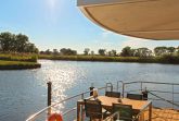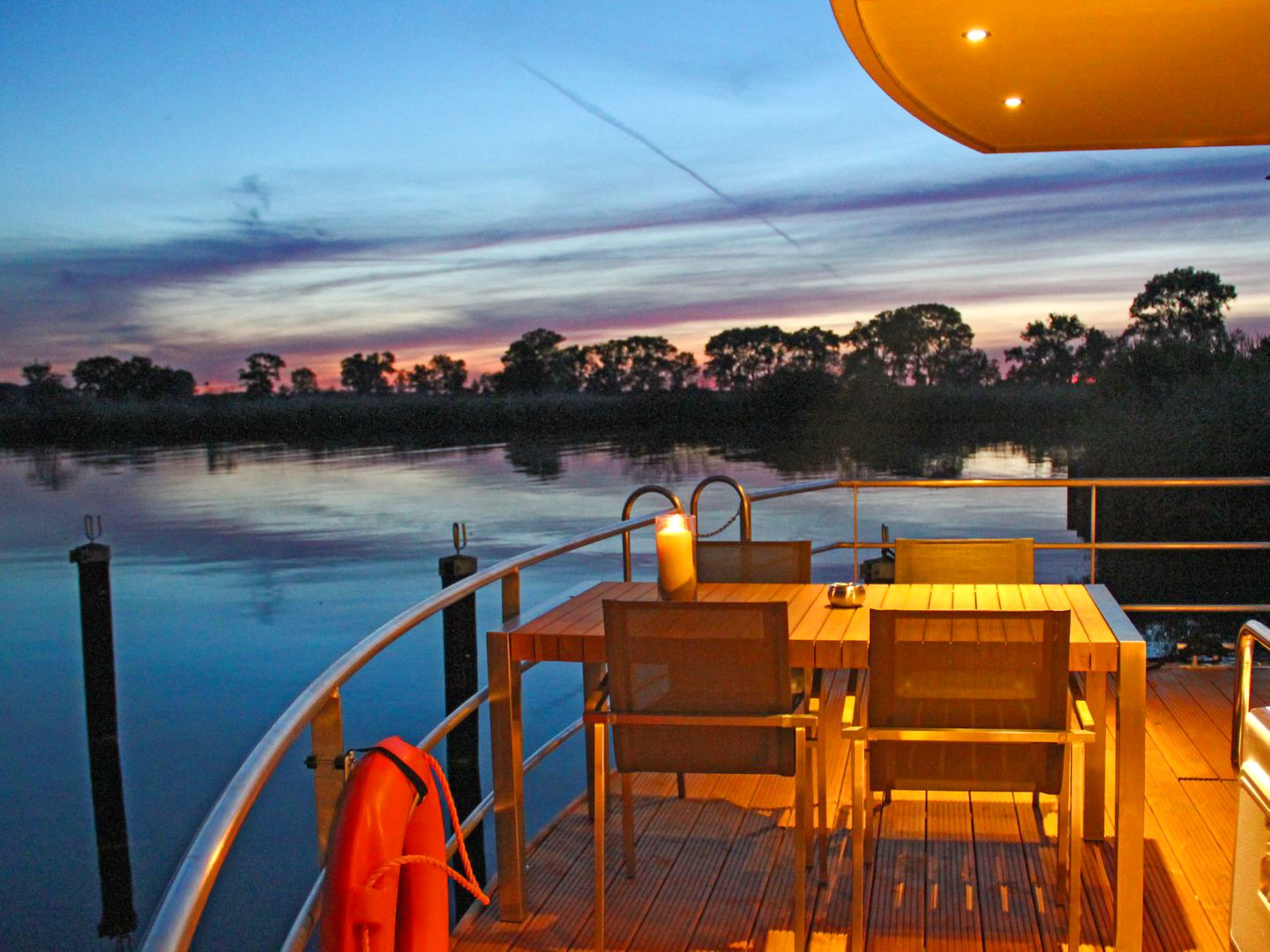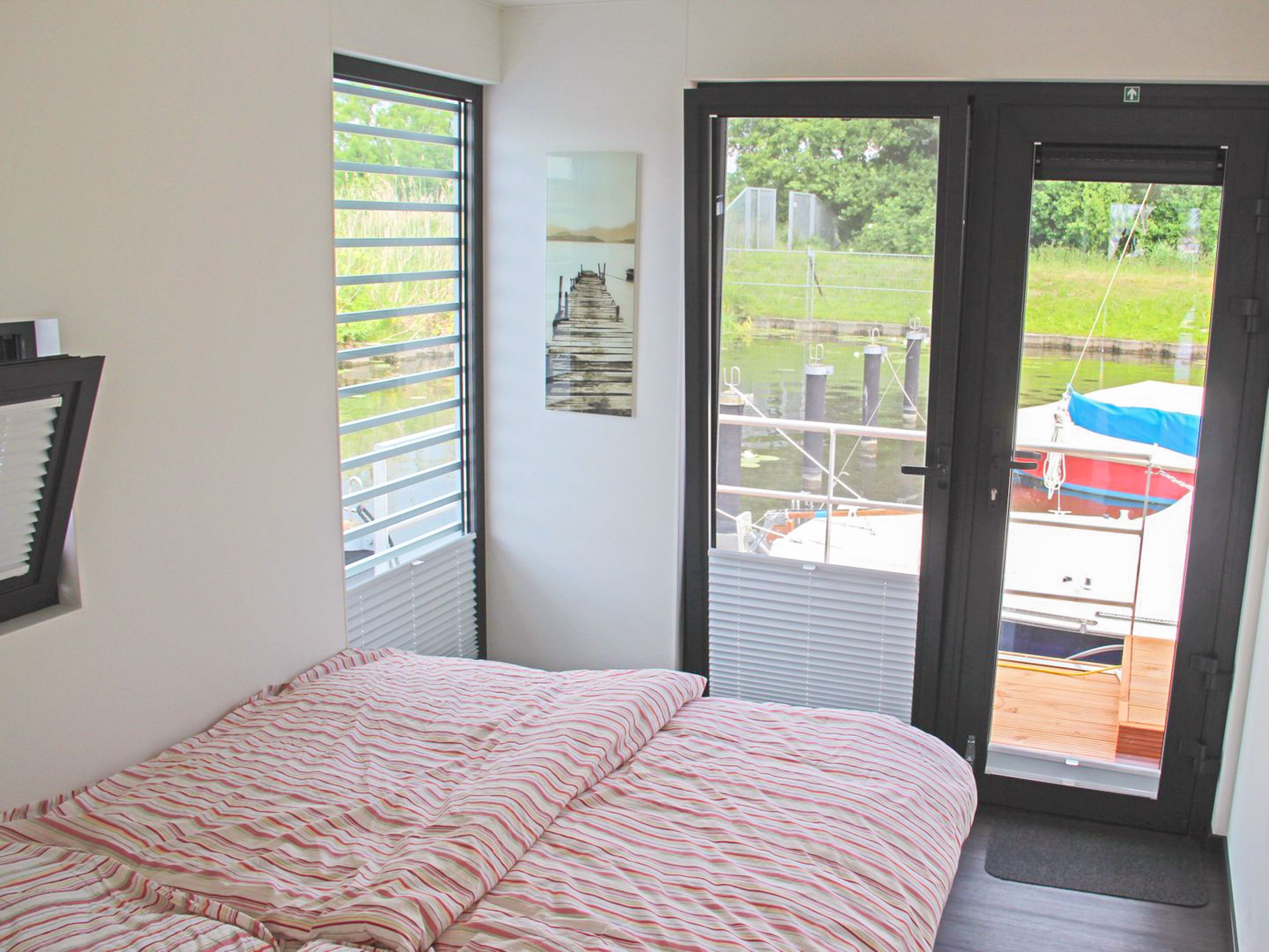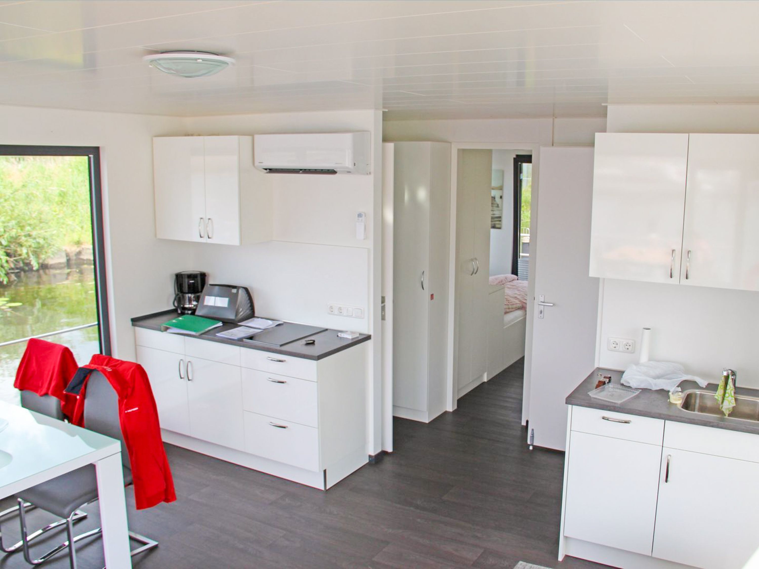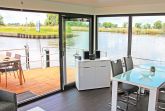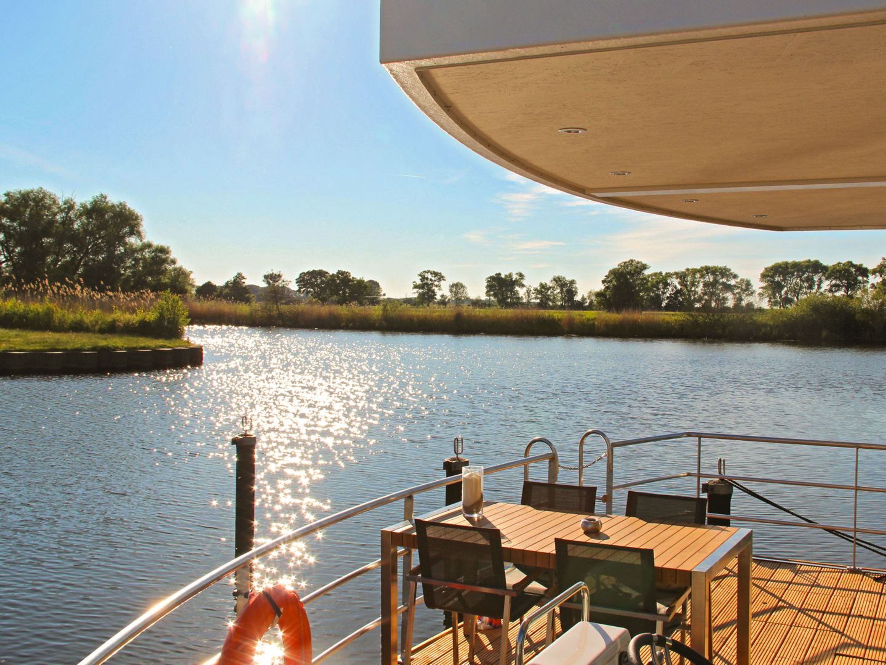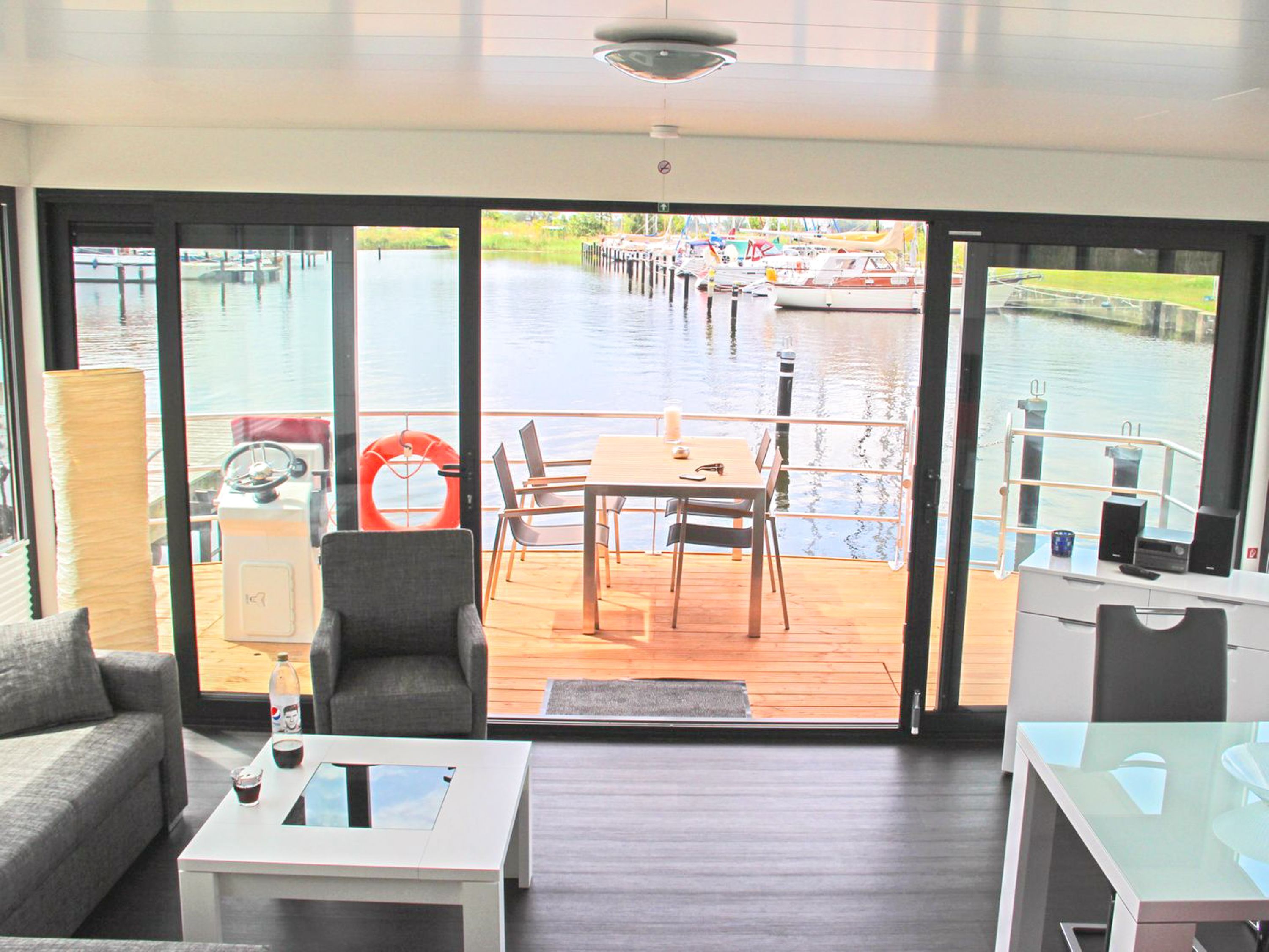 Floating House Undine erwartet dich im Seebad Ueckermünde fest verankert am Rande der Marina, ganz nah am feinsandigen Strand und umgeben von Natur, Wasser und Ruhe. Das modern eingerichtete Hausboot bietet Platz für bis zu 4 Personen und verfügt über zwei separate Schlafzimmer mit Doppelbetten (160x200) perfekt für Paare, Freunde oder kleine Familien. Auf rund 44m² Wohnfläche findest du alles, was du für entspannte Tage auf dem Wasser brauchst. Der lichtdurchflutete Wohnbereich ist offen gestaltet und verbindet die gemütliche Sitzecke mit dem Esstisch und der voll ausgestatteten Küchenzeile. Mikrowelle, Spülmaschine, Ceran-Kochfeld, Kühlschrank, Kaffeemaschine, Toaster, Wasserkocher alles ist da, um dich rundum zu versorgen. Das Badezimmer mit Dusche und das separate WC mit Waschtisch sorgen für zusätzlichen Komfort. Draußen erwarten dich gleich zwei ganz besondere Plätze: eine 15m² große Terrasse am Bug und das 25m² große Sonnendeck auf dem Dach dein privates Plätzchen für Morgenkaffee, Sonnenstunden oder den Blick aufs Wasser, wenn die Dämmerung einsetzt. Für Unterhaltung an Bord sorgen ein Sat-TV auf Flatscreen, DVD-Player, Radio und CD-Player. Das gesamte Hausboot ist mit einer Klimaanlage mit Warmluftfunktion ausgestattet, sodass du es dir zu jeder Tageszeit gemütlich machen kannst. Ein kleiner, gut erzogener Hund darf mit an Bord. Dein Auto parkst du ganz bequem direkt am Hafen. Das Floating House Undine ist von Frühjahr bis Herbst buchbar, jeweils in der frostfreien Zeit.