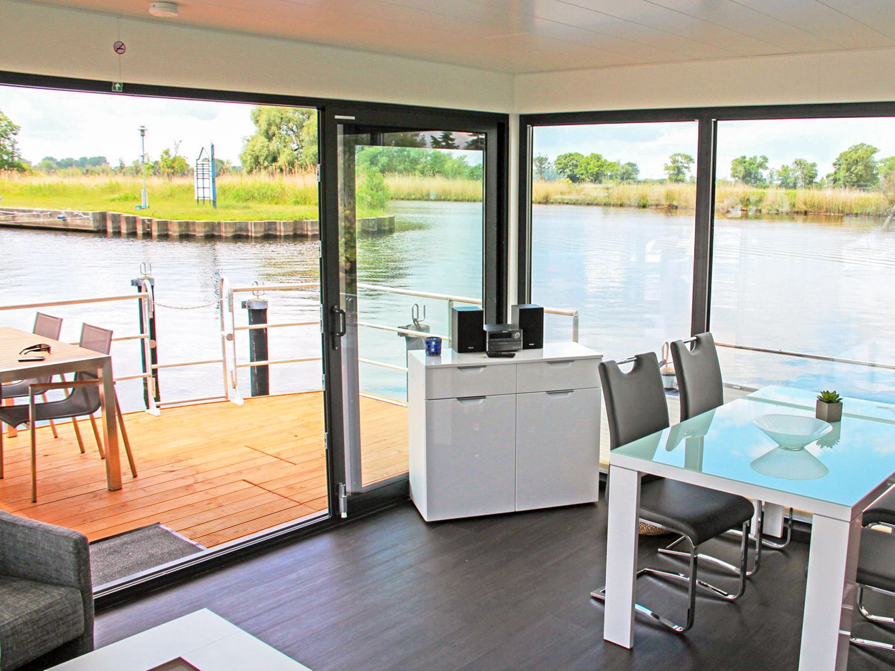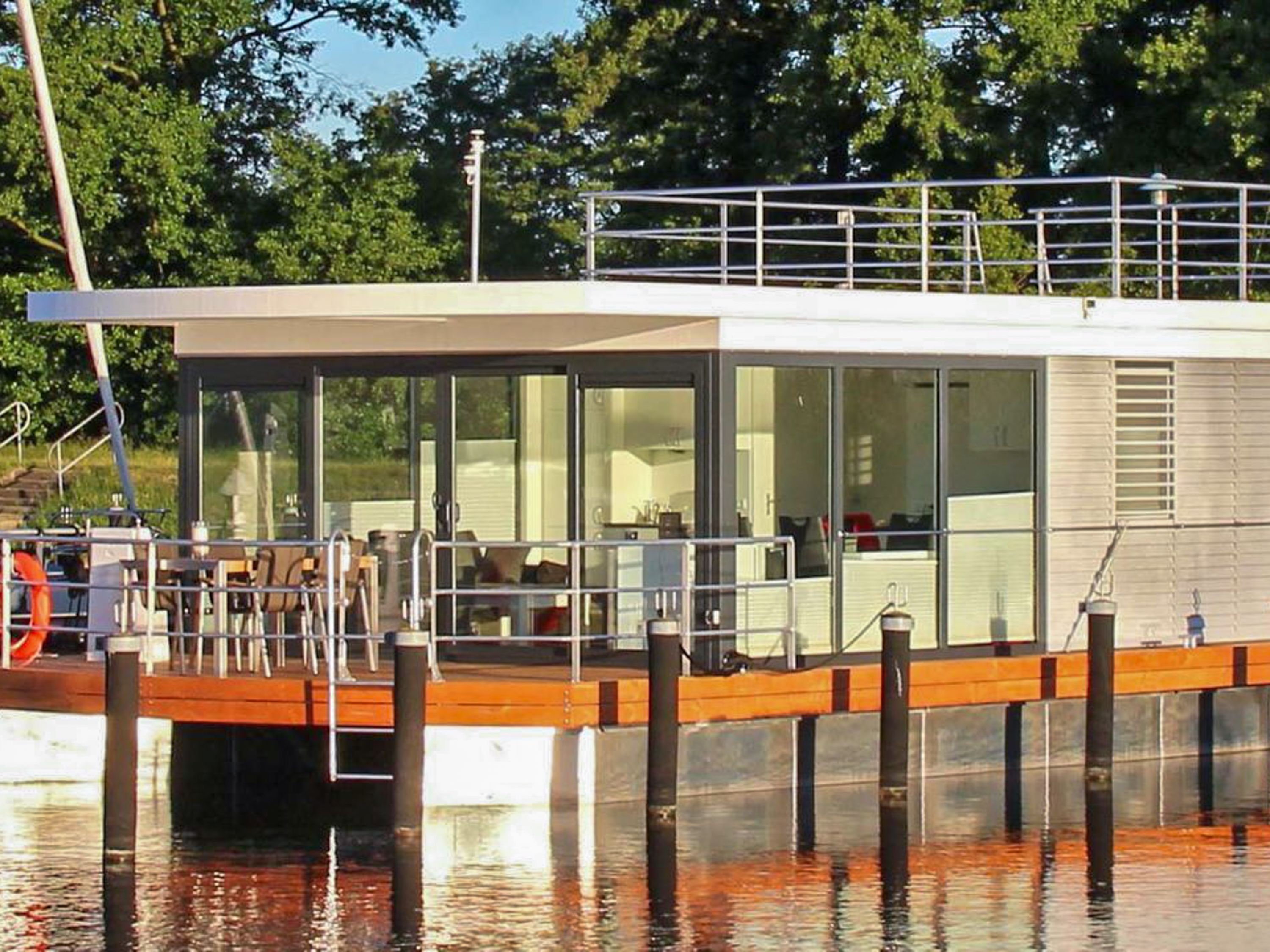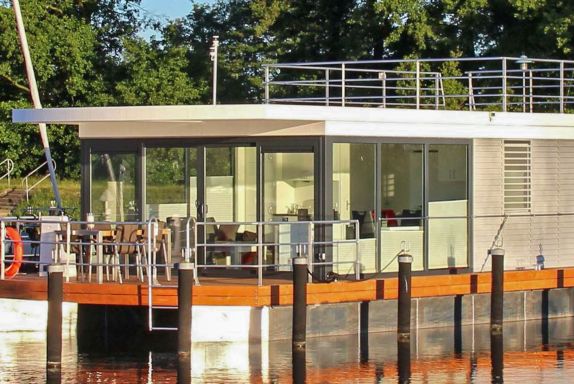 Die beiden schwimmenden Ferienhäuser Floating House Undine und Floating House Xenia liegen idyllisch am Rand des Hafens in der Lagunenstadt Ueckermünde, direkt an der Uecker und nur wenige Schritte vom feinsandigen Strand entfernt. Inmitten der geschützten Natur an der Südküste des Oderhaffs bieten sie dir einen ruhigen Rückzugsort mit echtem Wasserblick und viel Komfort. Das Floating House Undine verfügt über 44 m² Wohnfläche, zwei separate Schlafzimmer und bietet Platz für bis zu 4 Personen ideal für Familien oder Freunde, die das maritime Leben lieben. Die Xenia ist mit 55 m² etwas größer, aber auf maximal 3 Personen ausgelegt, was sie besonders für Paare oder kleine Familien zu einem gemütlichen Ort macht. Beide Hausboote sind hundefreundlich, klimatisiert und mit WLAN sowie einem eigenen Parkplatz auf dem Gelände ausgestattet. Große Fenster holen die Natur direkt ins Haus, ob du im lichtdurchfluteten Wohnbereich entspannst, auf der Terrasse am Bug deinen Kaffee genießt oder den Sonnenuntergang vom Sonnendeck aus beobachtest das Leben auf dem Wasser ist hier zum Greifen nah. Die Umgebung rund um die Hausboote bietet zahlreiche Freizeitmöglichkeiten. In der Marina selbst findest du unter anderem ein Restaurantschiff, Boots- und Fahrradverleih, eine Minigolfanlage, ein Volleyballfeld und sogar einen Grillplatz. Am nahen Badestrand kannst du dich in die Ostseeluft legen oder sportlich aktiv werden. Auch Touren mit dem Ausflugsschiff oder im Kanu auf der Uecker starten direkt vor deiner Haustür. Die Floating Houses Undine und Xenia sind zwischen April und Oktober buchbar genau dann, wenn das Wasser glitzert, der Himmel weit ist und die Region ihre volle Schönheit entfaltet.