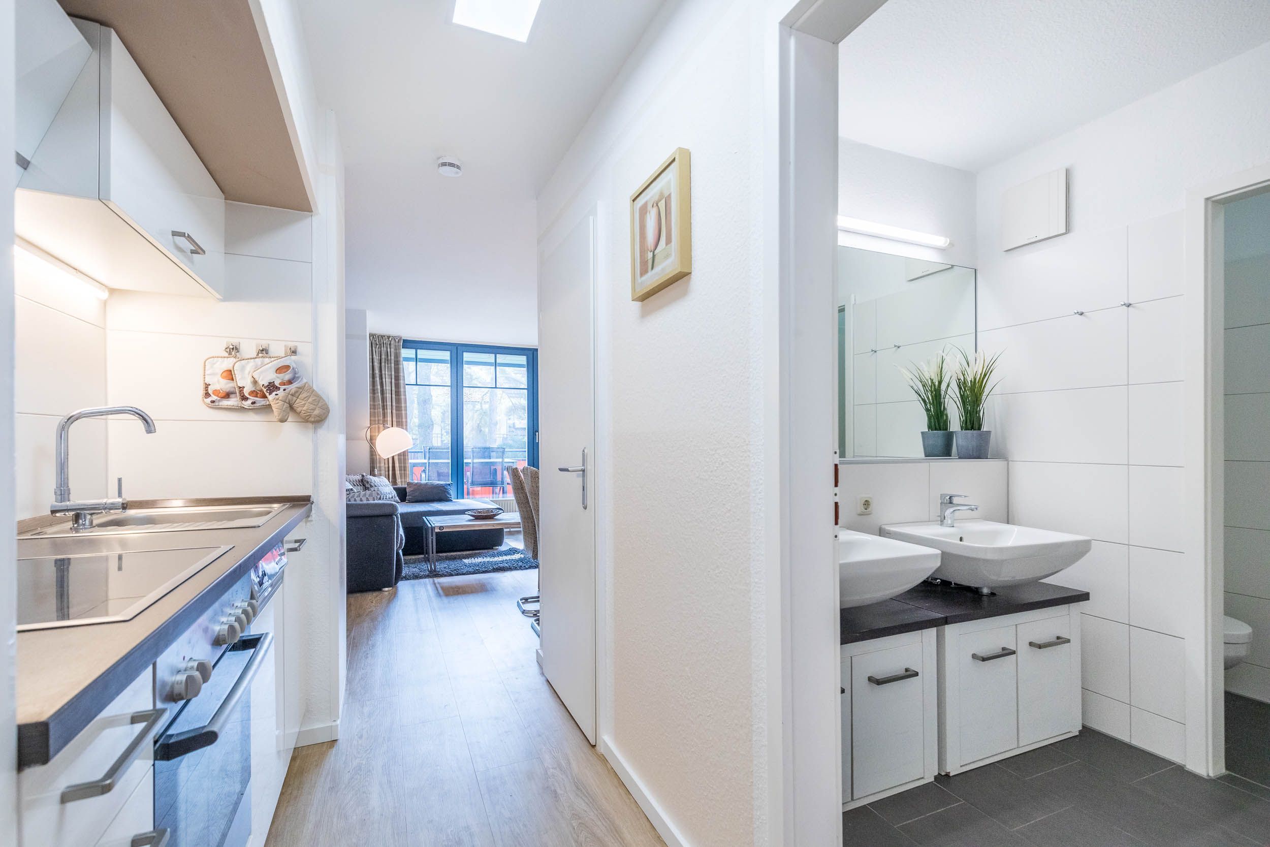 Die Küchenzeile ist gut ausgestattet. So finden Sie einen Backofen mit Herdplatten, Mikrowelle, Spülmaschine, Toaster, Wasserkocher und ebenso eine Kaffeemaschine. Gemeinsame Mahlzeiten nehmen Sie am Esstisch ein, der mit vier Schwingstühlen bestückt ist. Vom Essbereich aus blicken Sie direkt auf den Balkon mit Gartenmöbeln.