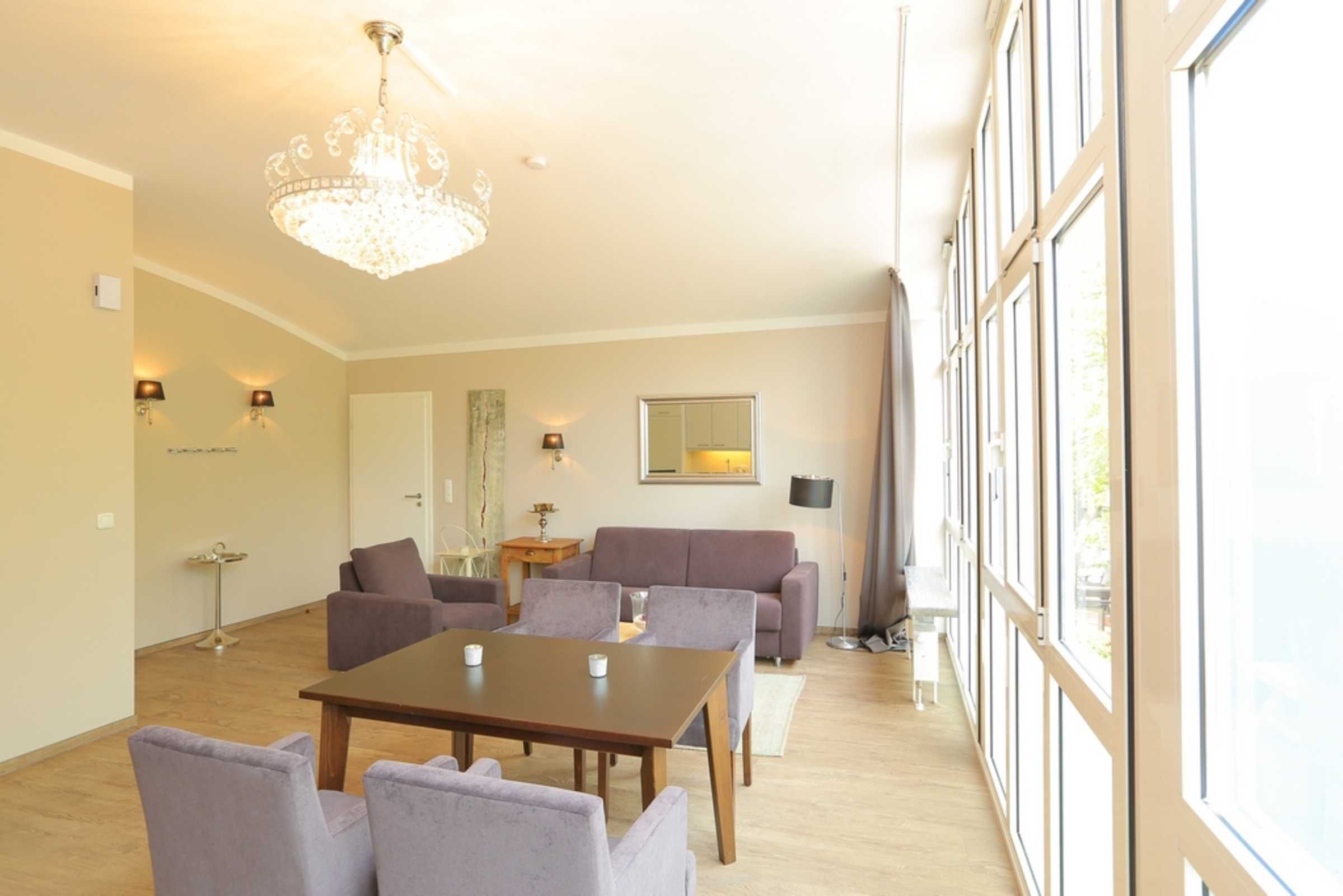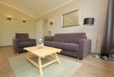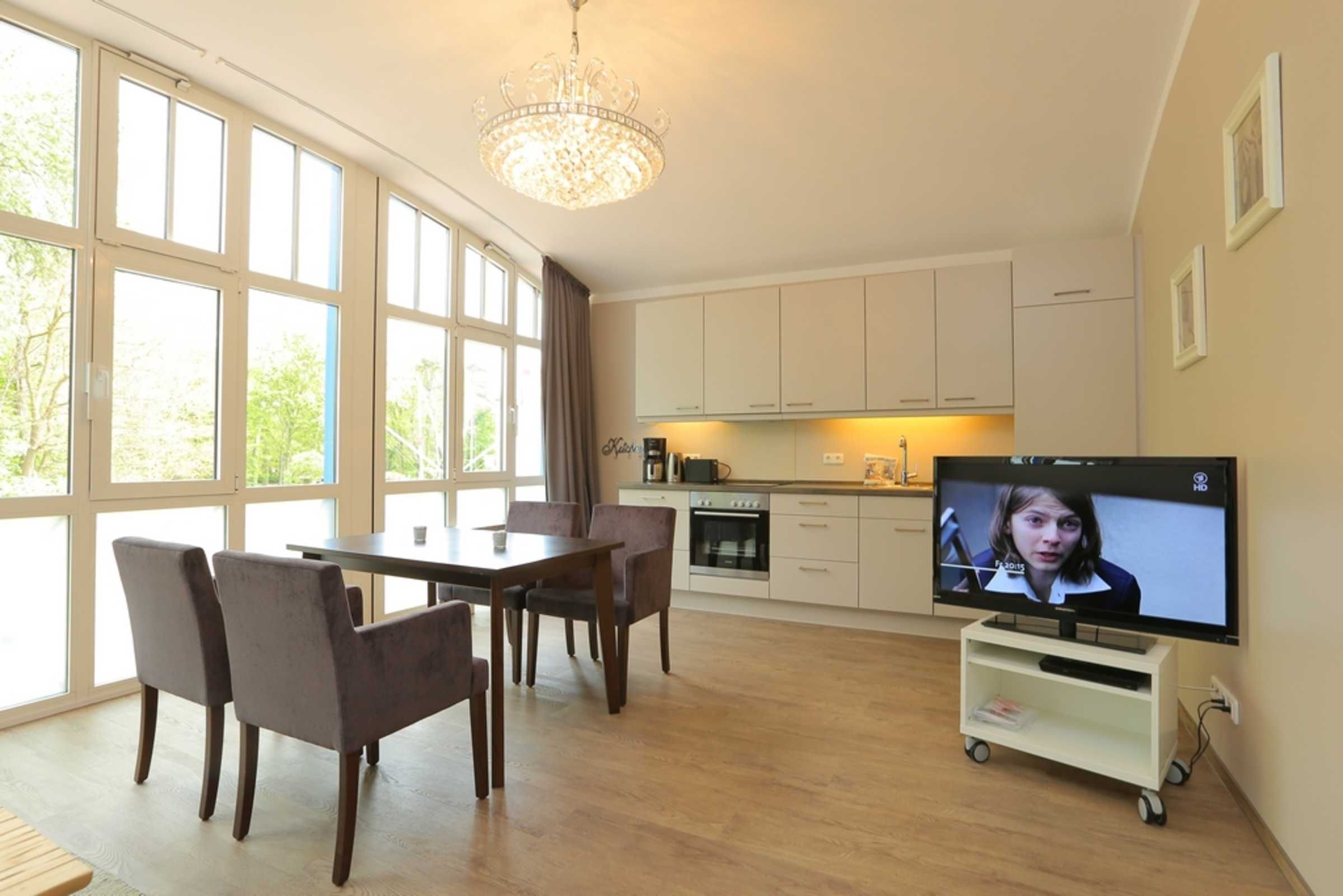In den lichtdurchfluteten Wohn- und Essbereich ist eine technisch hochwertig bestückte Küchenzeile integriert. Der Raum ist einheitlich und ebenso elegant wie zweckmäßig möbliert. Neben einer gemütlichen Polstergarnitur mit ausziehbarer Couch gibt es einen großzügigen Essplatz. Es stehen Flatscreen-TV und DVD-Player zur Verfügung.