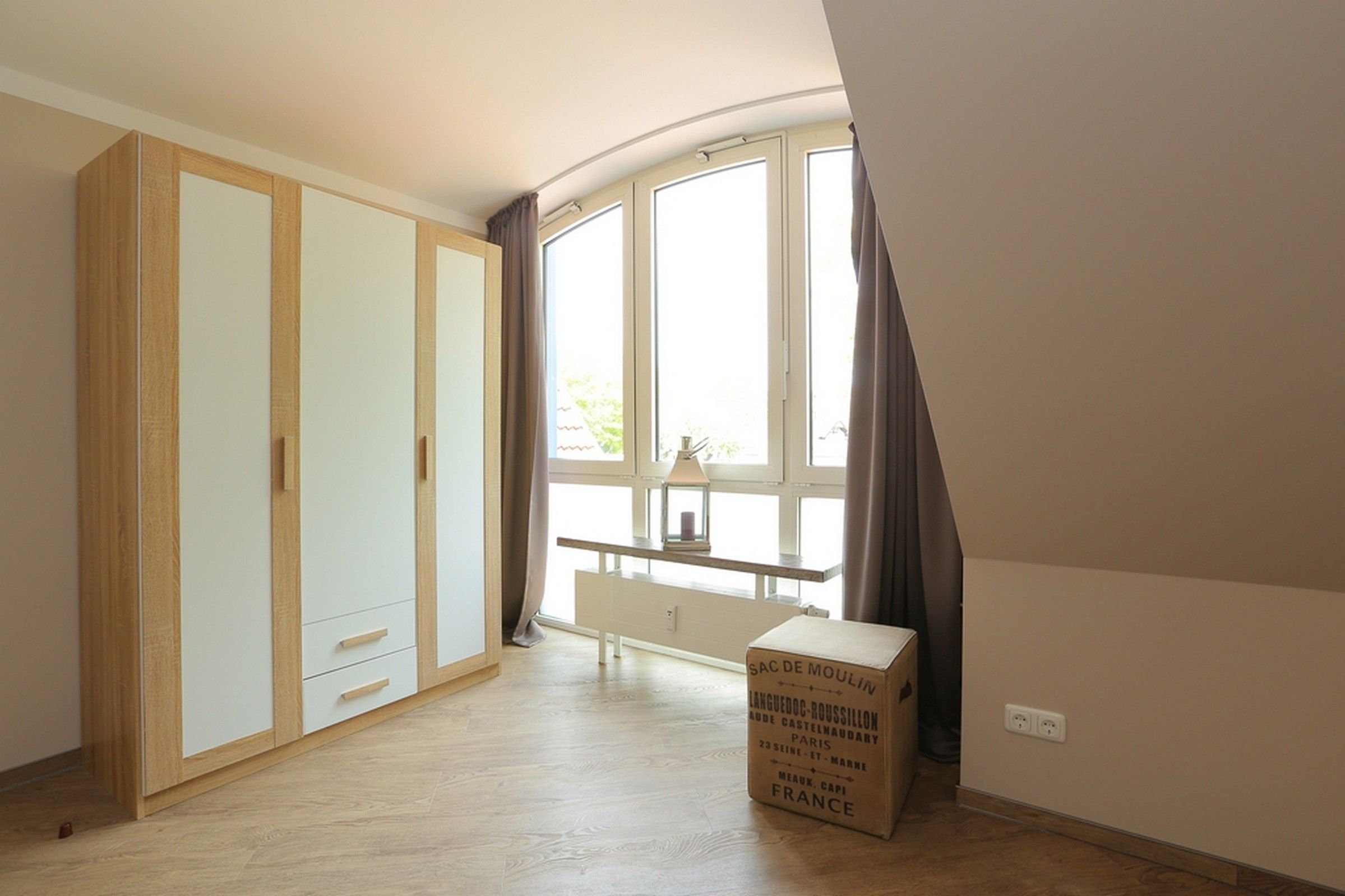 Das separate Schlafzimmer ist mit einem bequemen Doppelbett und einem geräumigen Kleiderschrank eingerichtet.