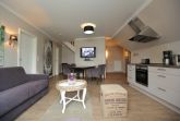 Im geräumigen Wohn-/Essbereich in der unteren Ebene ist Wohlfühlen angesagt, selbst an Regentagen. Langeweile kommt beim Spielenachmittag am großen Tisch im Essbereich garantiert nicht auf. Weiterhin befinden sich im unteren Bereich das Wohnzimmer mit bequemer Sitzgarnitur und hochmoderner Multimedia-Anlage und Flatscreen-TV. Die großen Fenster bringen viel Tageslicht ins Quartier.