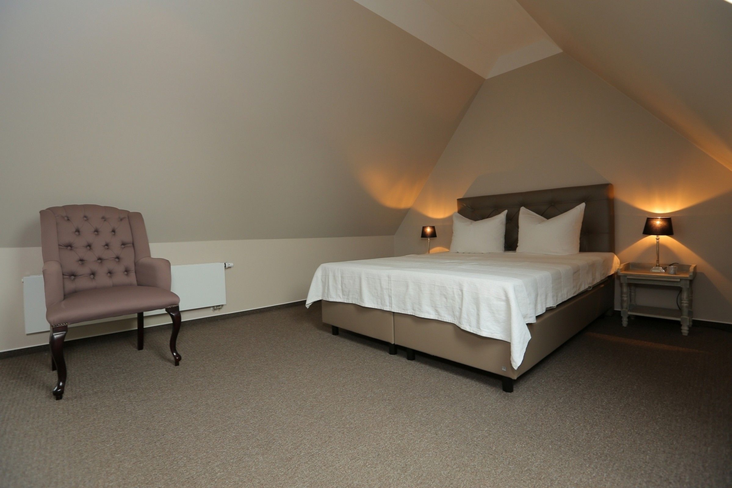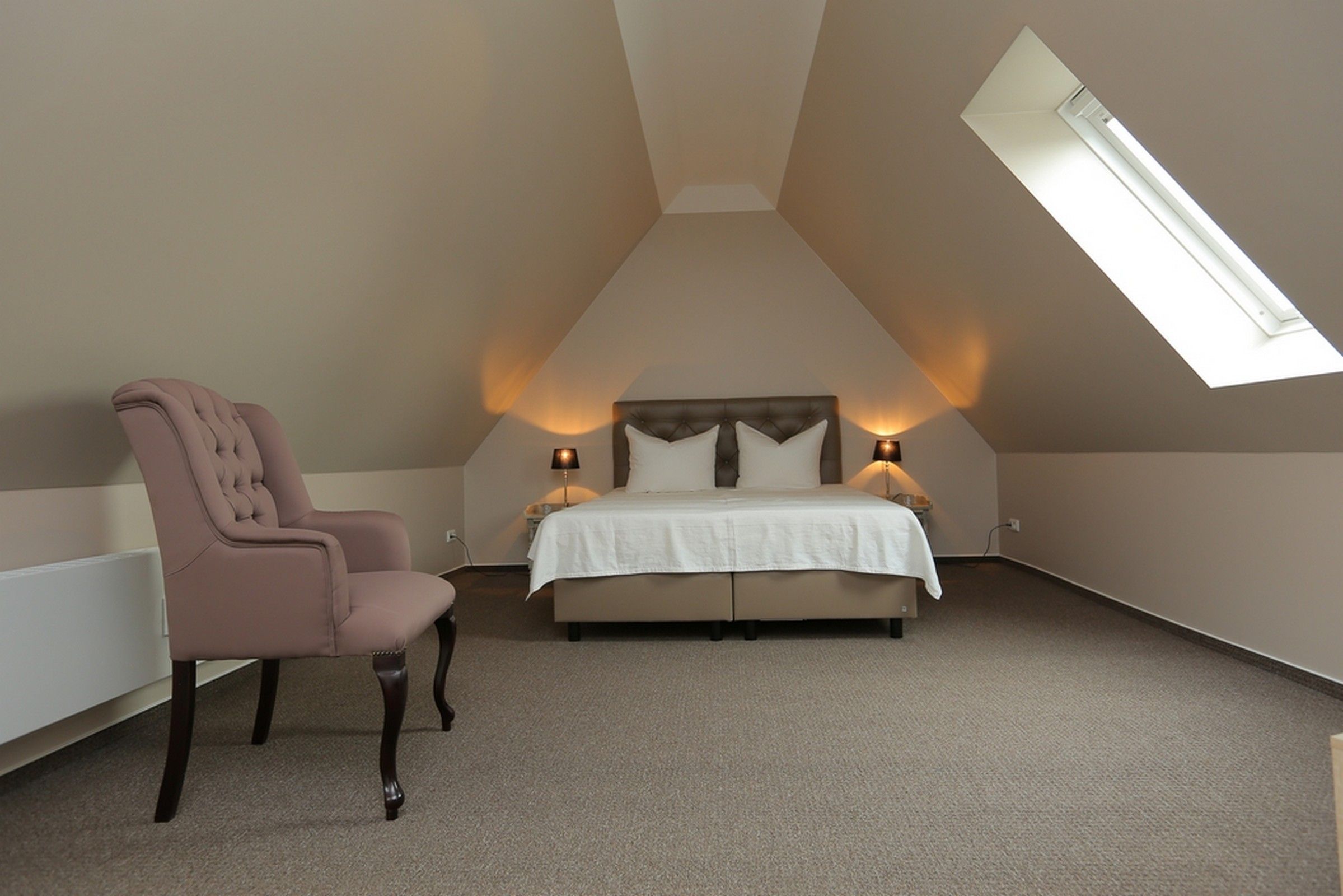 Das zweite Schlafzimmer befindet sich dann in 2. Ebene, im Dachgeschoss. Dieses Schlafzimmer bietet einen 2. TV und für Ihre Garderobe eine Kommode. Auch dieses Schlafzimmer bietet ein bequemes Boxspringbett für erholsamen Schlaf.