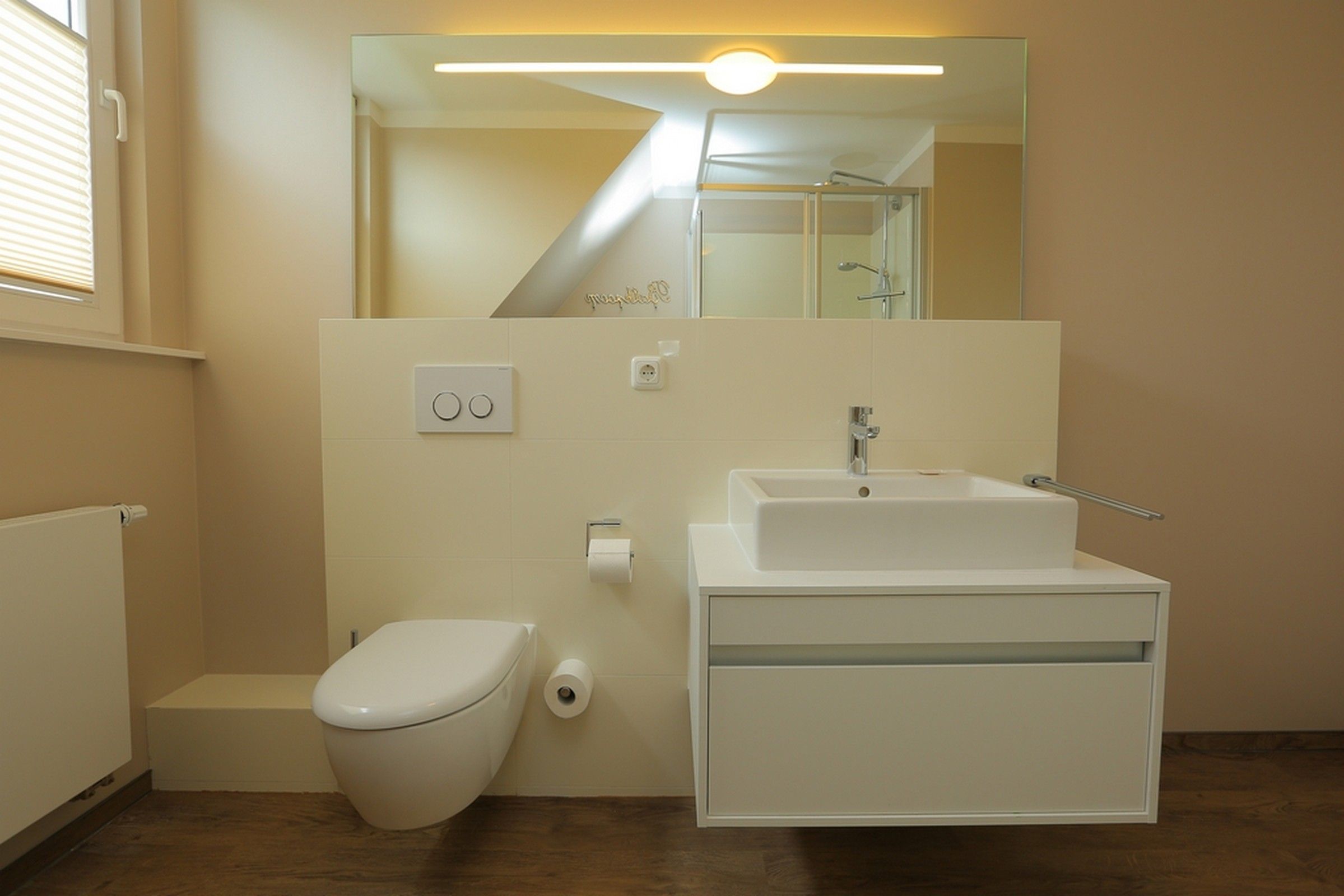 Zusätzlich besitzt die Wohnung auf dieser Etage ein helles Bad mit Dusche und WC sowie eines der beiden geräumigen Schlafzimmer, welches neben einem bequemen Boxspringbett auch mit einem Kleiderschrank ausgestattet ist.