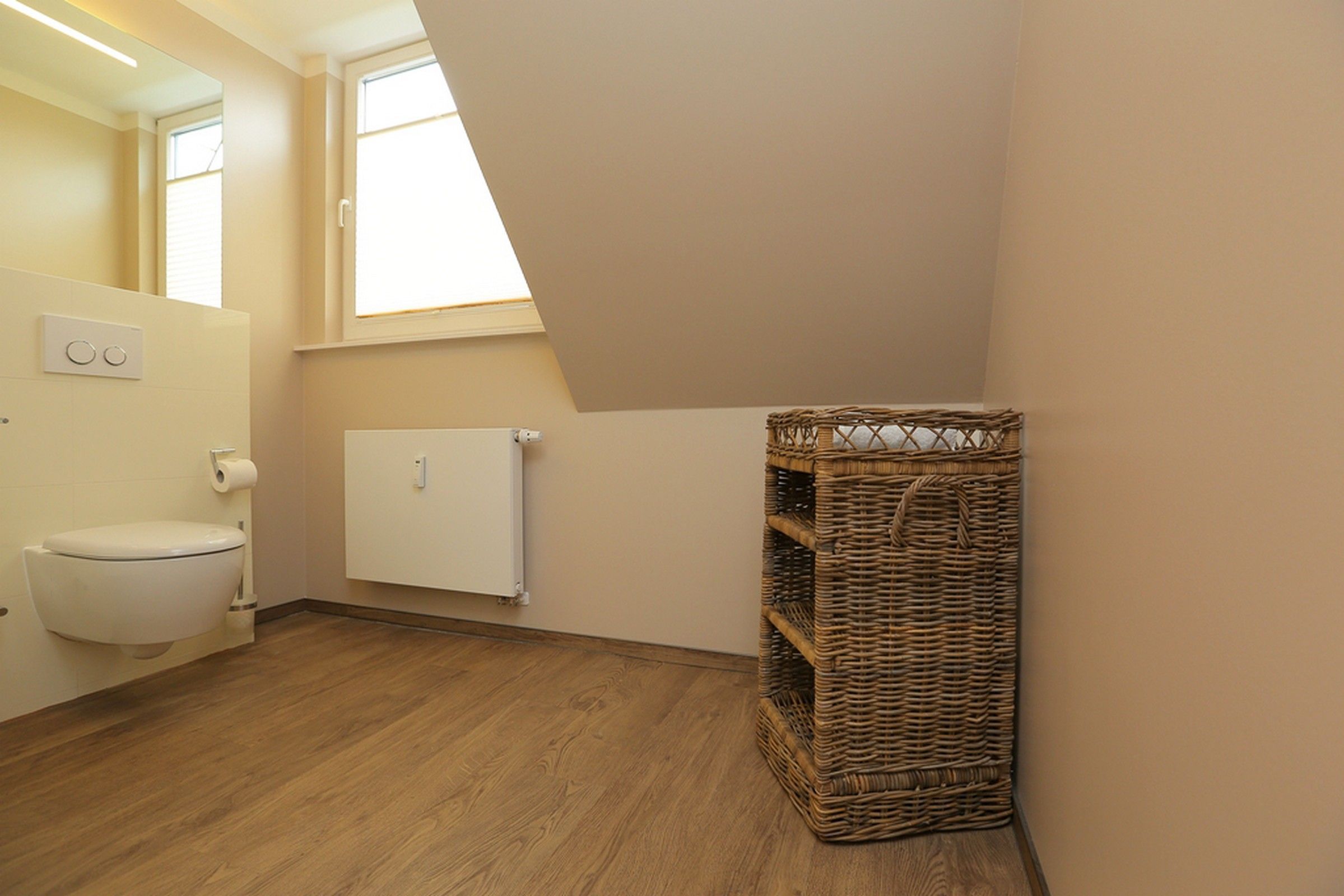 Das zweite Schlafzimmer befindet sich dann in 2. Ebene, im Dachgeschoss. Dieses Schlafzimmer ist ebenfalls, wie das Wohnzimmer, mit TV ausgestattet. Für Ihre Garderobe finden Sie hier eine Kommode. Auch hier sorgt ein bequemes Boxspringbett für wohligen Schlaf.