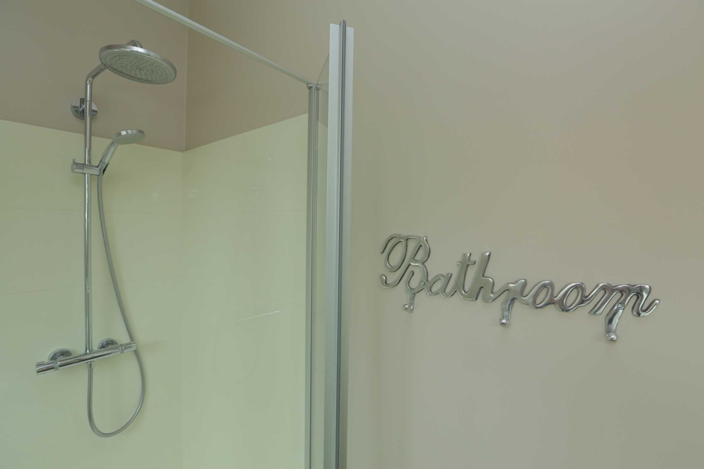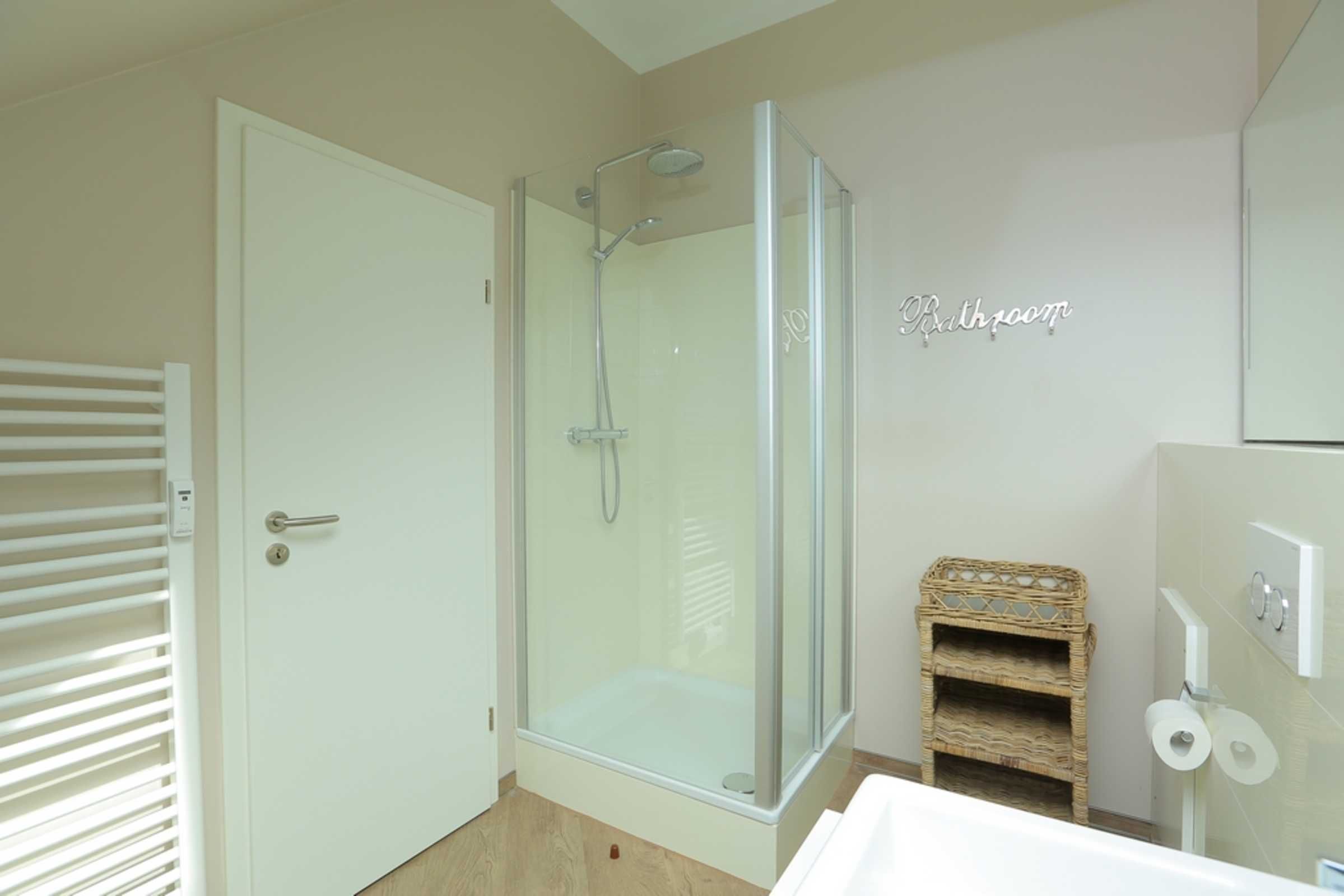 Das Bad ist hell und modern ausgestattet und verfügt über eine Dusche, Badewanne und WC.