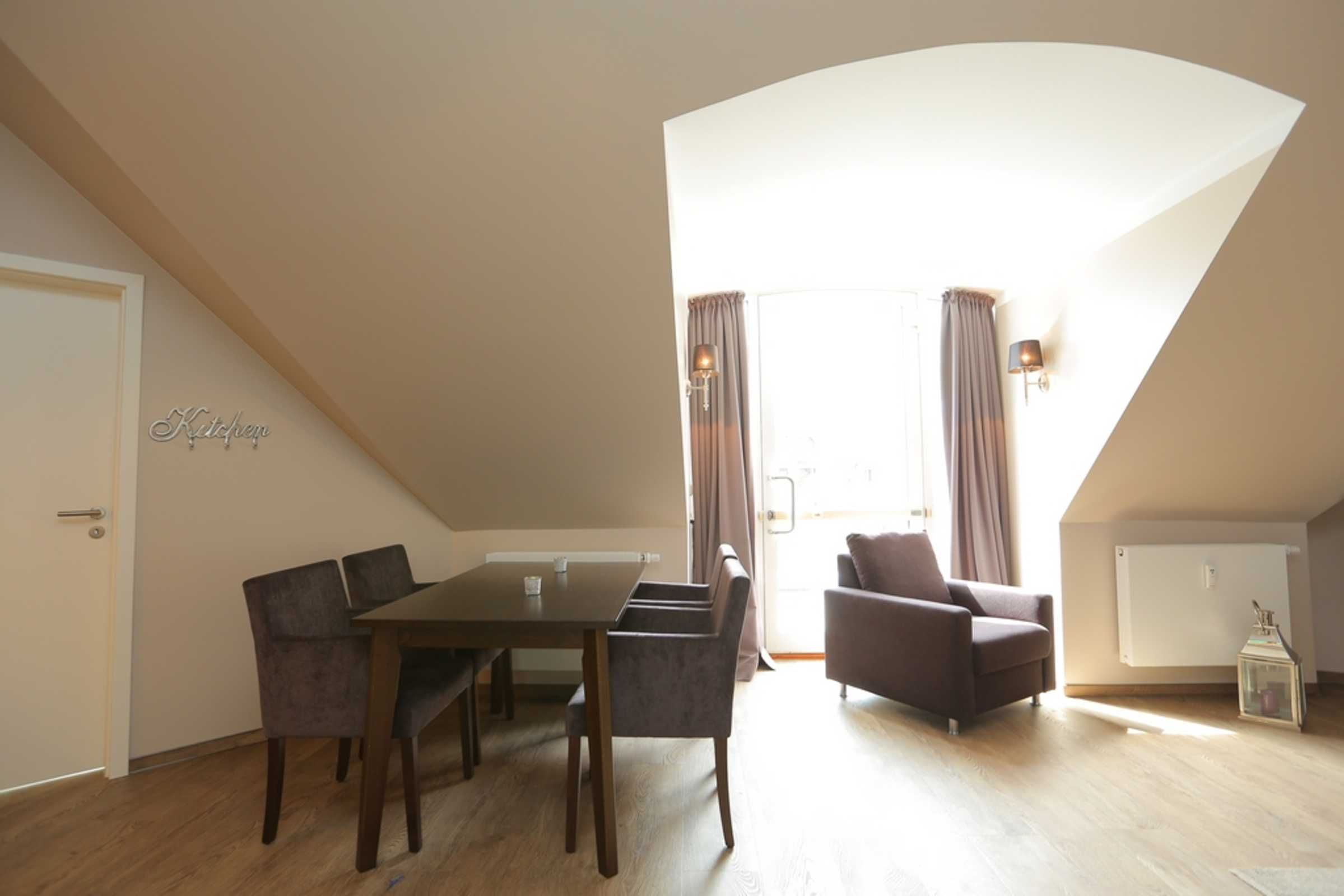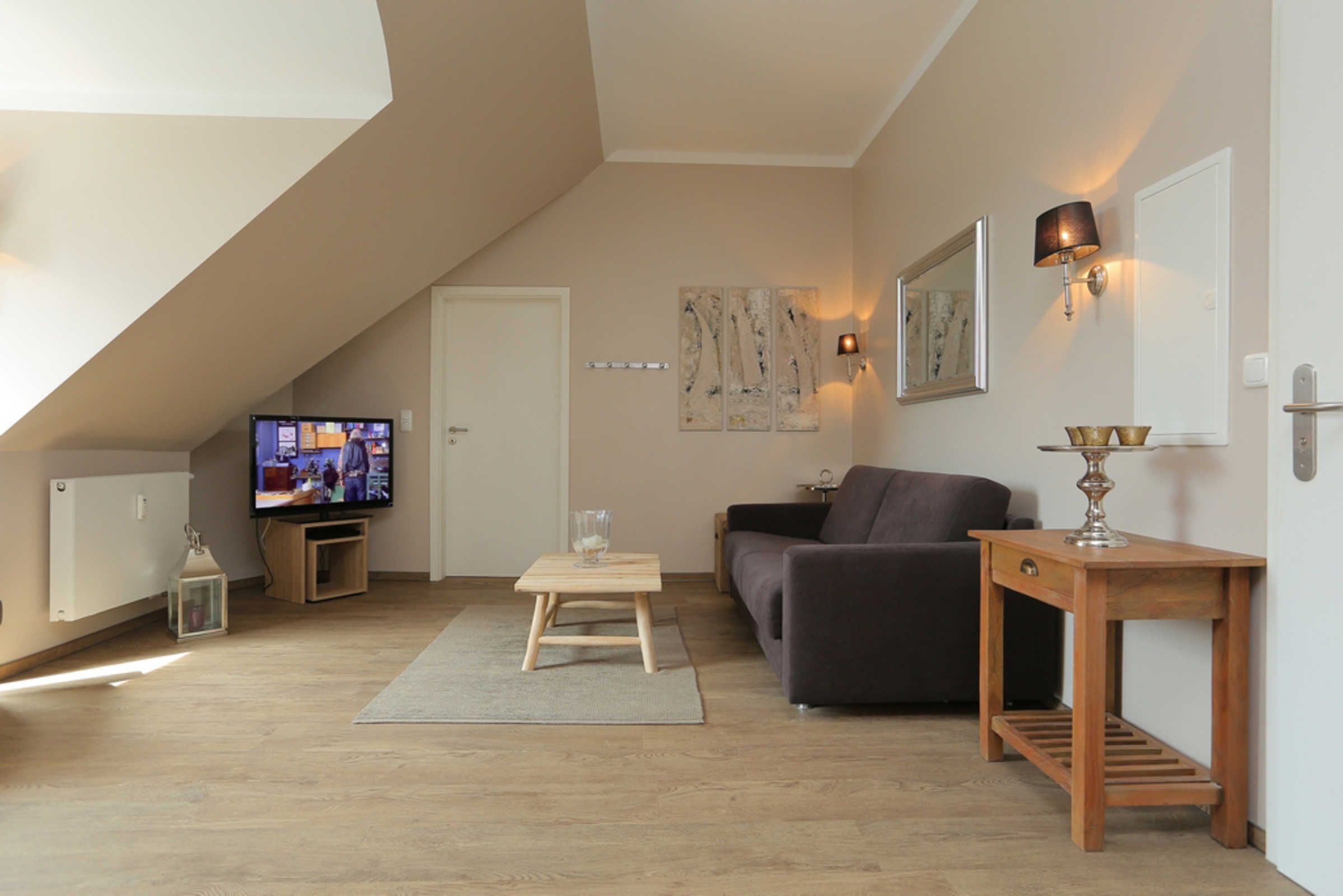 Die Ferienwohnung im 1.OG (Richtung Innenhof) verfügt über einen modernen, aber gemütlich eingerichteten Wohn- und Essbereich mit SAT-TV (Flatscreen) und integrierter Küchenzeile, die unter anderem mit Kühlschrank, Kaffeemaschine und Wasserkocher ausgestattet ist. Im gemütlichen Wohnbereich finden Sie eine harmonisch abgestimmte Einrichtung mit SAT-TV (Flatscreen) und DVD-Player.