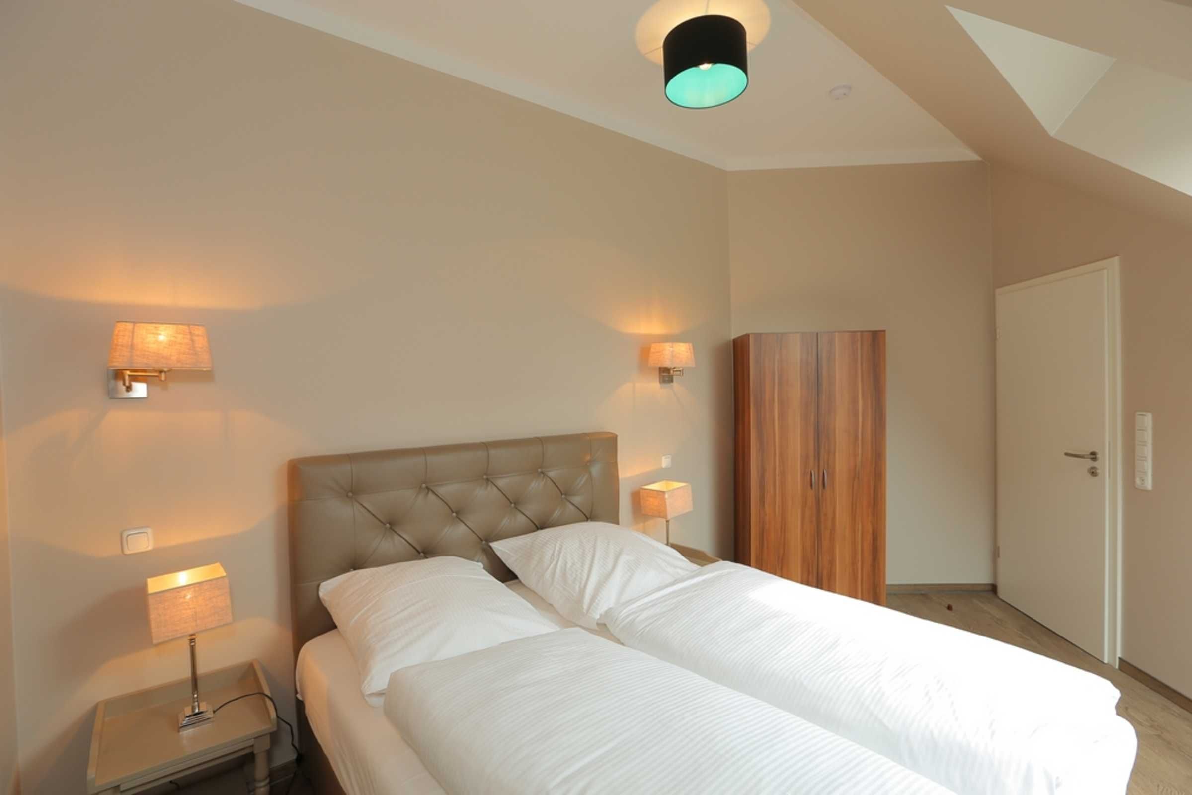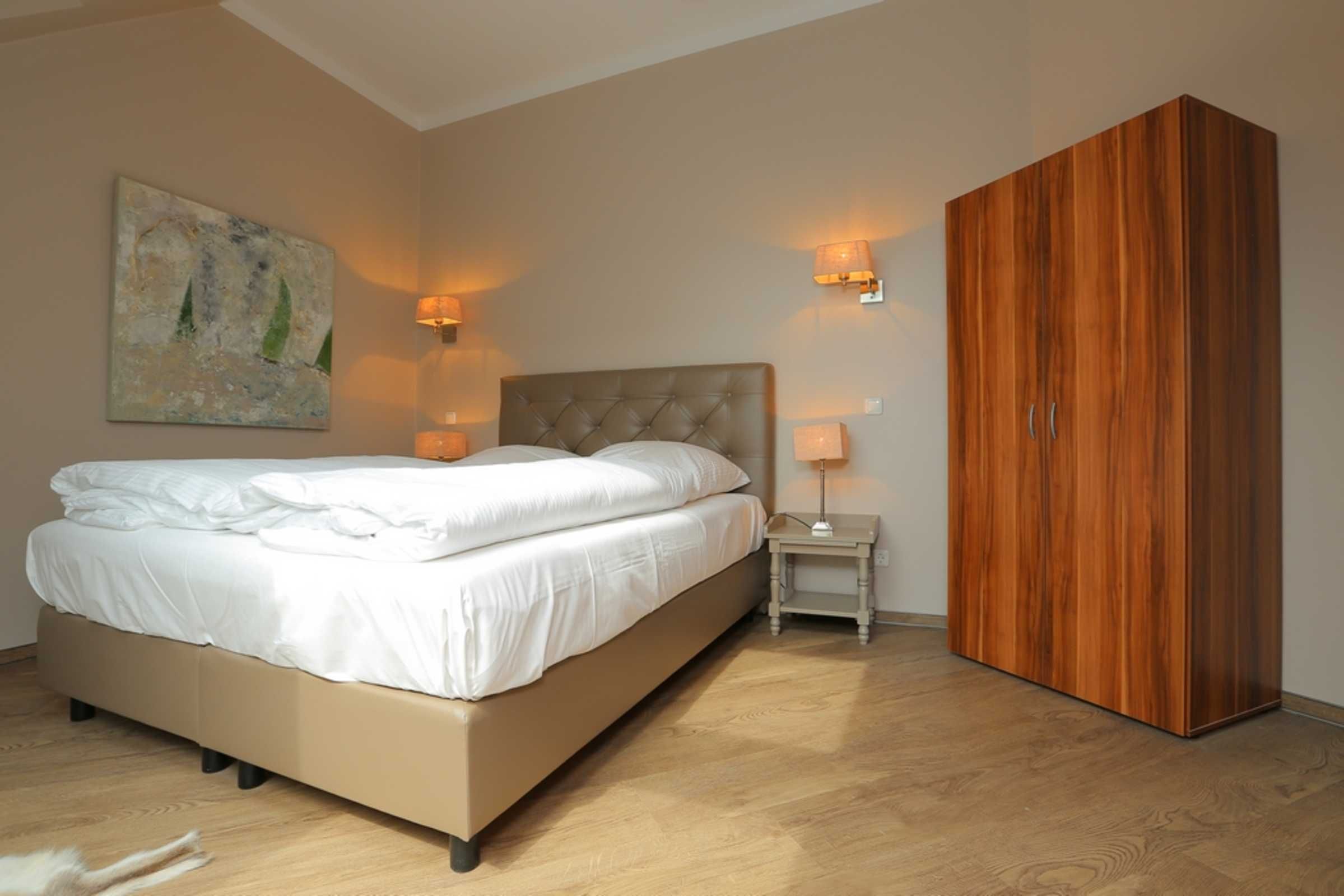 Ein separates Schlafzimmer mit einem bequemen Boxspringbett (160x200) sorgt für erholsamen Schlaf. Im Kleiderschrank können Sie Ihre Urlaubsgarderobe ablegen.