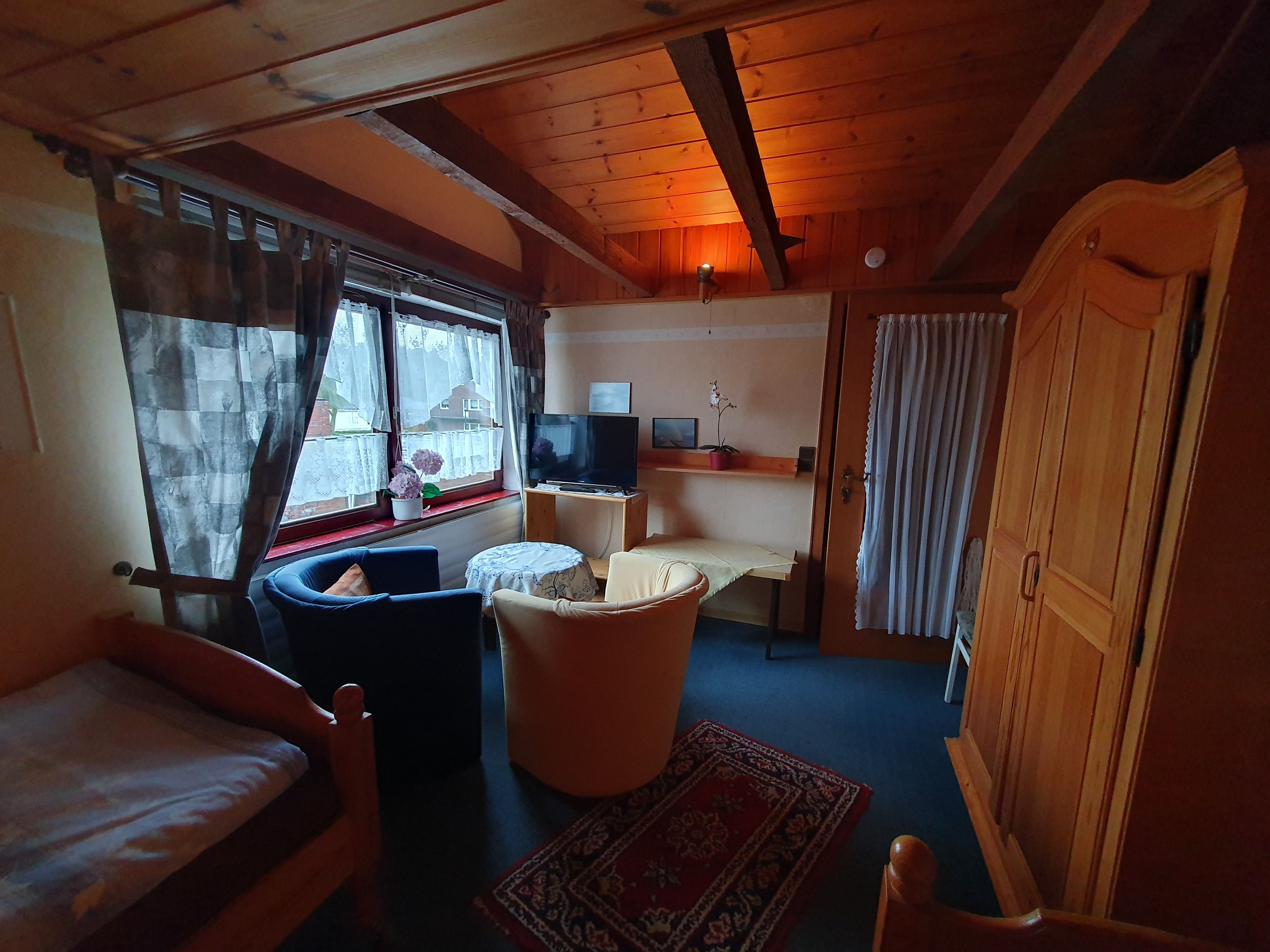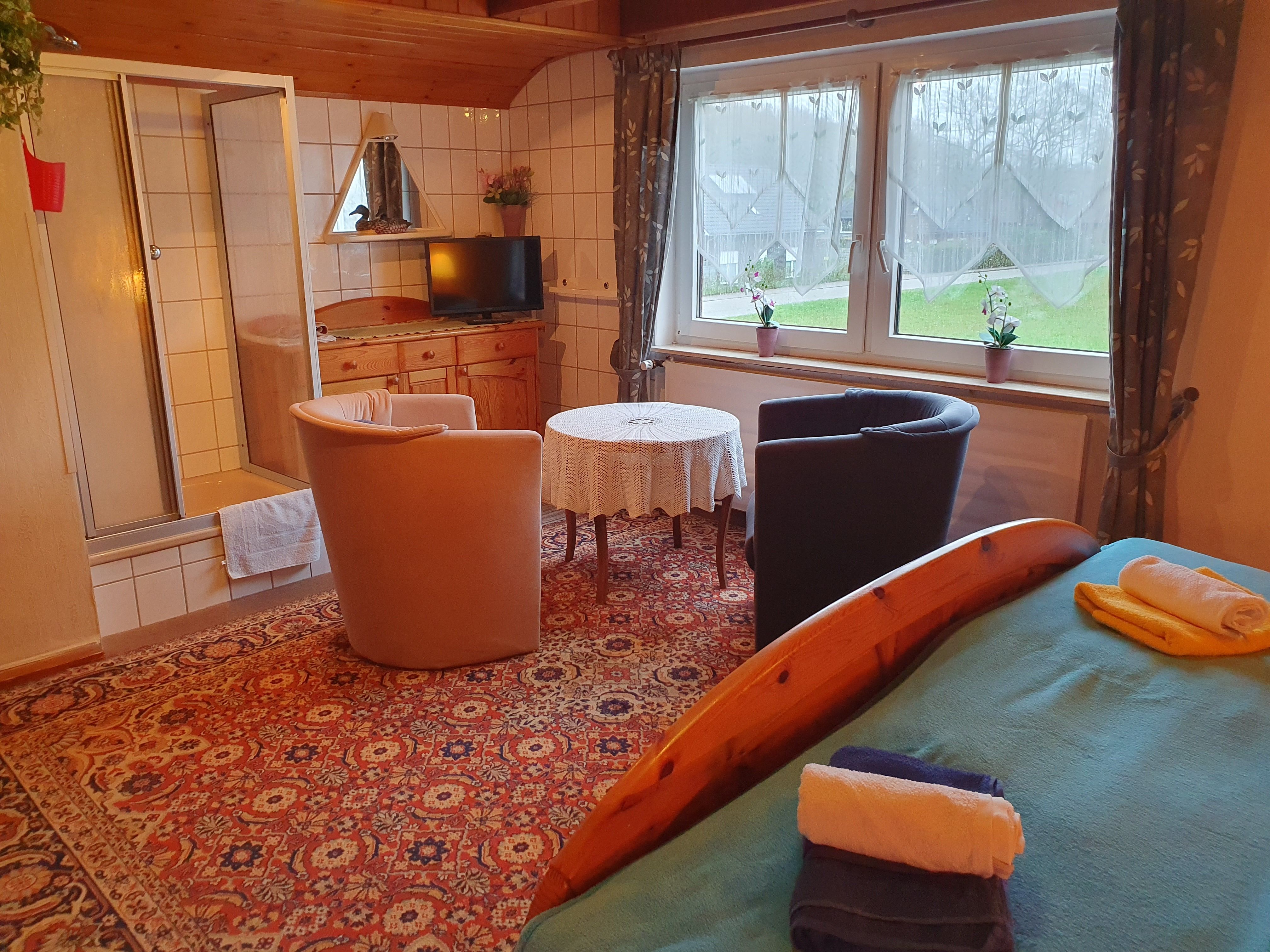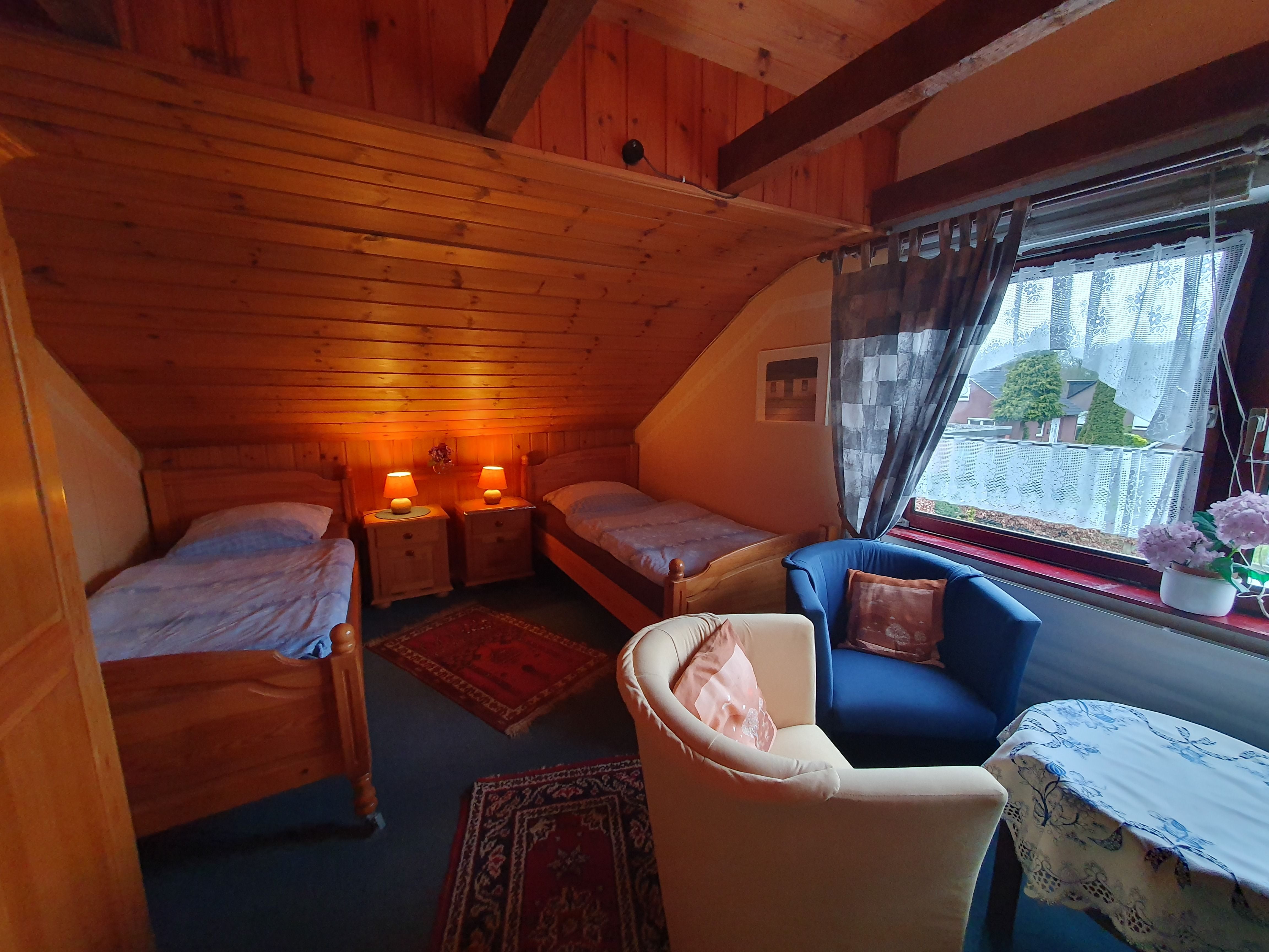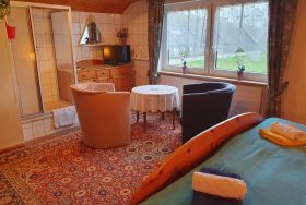 Wir bieten unseren Gästen 2 Doppelzimmer und 1 Einzelzimmer in zentraler, aber ruhiger Wohnlage (FeWo in Mehrfamilienhaus). Dabei steht weiterhin ein Aufenthaltsraum sowie eine Küche zur Verfügung - unsere Ferienwohnung ist somit auch auf Wunsch als Privatunterkunft nutzbar. Auch der vorhandene Wintergarten, wie auch unser schöner Garten am Haus steht unseren Gästen zur Verfügung.Infos über die Region und zu Veranstaltungen liegen aus. Die Zimmer bzw. Wohnung hat keinen separaten Eingang und befindet sich im Wohnhaus vom Vermieter.
