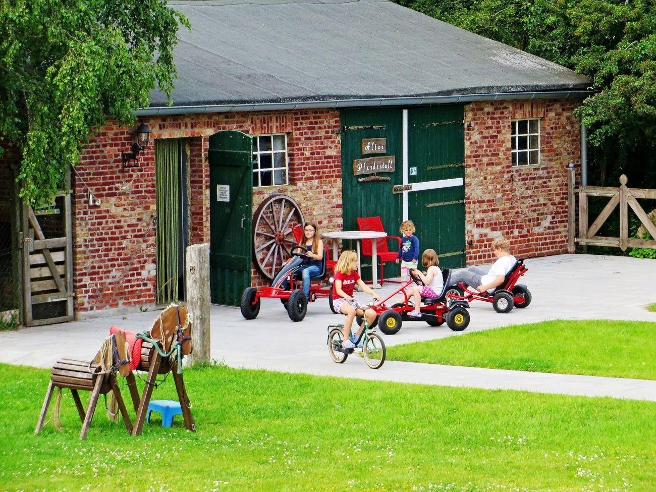 Unser Ferienhof Wohler - Hof Anno 1856 -, benannt nach dem Baujahr des Bauernhauses, welches im Jahre 1856 erbaut wurde, befindet sich auf einem 10.000 m² großen gepflegten Grundstück, auf dem sich unsere Ferienwohnungen auf mehrere zum Ferienhof gehörige Gebäude verteilen. Alle unsere Ferienwohnungen, so auch Ihre, haben eine eigene Terrasse mit Strandkorb, Liegen, Gartenmöbeln, Sonnenschirm und Grill. Ihr Auto kann auf unserem großen Parkplatz geparkt werden. Unser weitläufiger Spielplatz bietet mit Trampolin, Klettergerüst mit Schaukel und Rutsche, Sandkiste, Fußballtor, Tischtennisplatte, Kettcar-Bahn mit Kettcars und weiteren Fahrzeugen, Kletterpyramide sowie dem Alten Pferdestall, in welchem sich unsere Hühner und ein Hobbyraum mit Tischkicker, Air-Hockey sowie Tischtennis (kostenlos) befinden, Spaß für Groß und Klein. Weiterhin gibt es in der Scheune ein weiteres Spielzimmer für die kleinen Gäste mit Spiel- und Malsachen sowie Büchern. Für unsere großen Gäste gibt es auf dem Spielplatz einen Grillpavillon sowie diverse idyllische Sitzmöglichkeiten. In unserem Heizungsraum zwischen Scheune und Bauernhaus stehen Ihnen Waschmaschine und Trockner gegen Gebühr zur Verfügung.