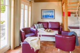 Der im Erdgeschoss befindliche Wohnbereich ist geschmackvoll möbliert mit zwei bequemen Sesseln und einer komfortablen Couchgarnitur. Diese kann mit ein paar wenigen Handgriffen in eine Schlafmöglichkeit für 2 Personen umfunktioniert werden.