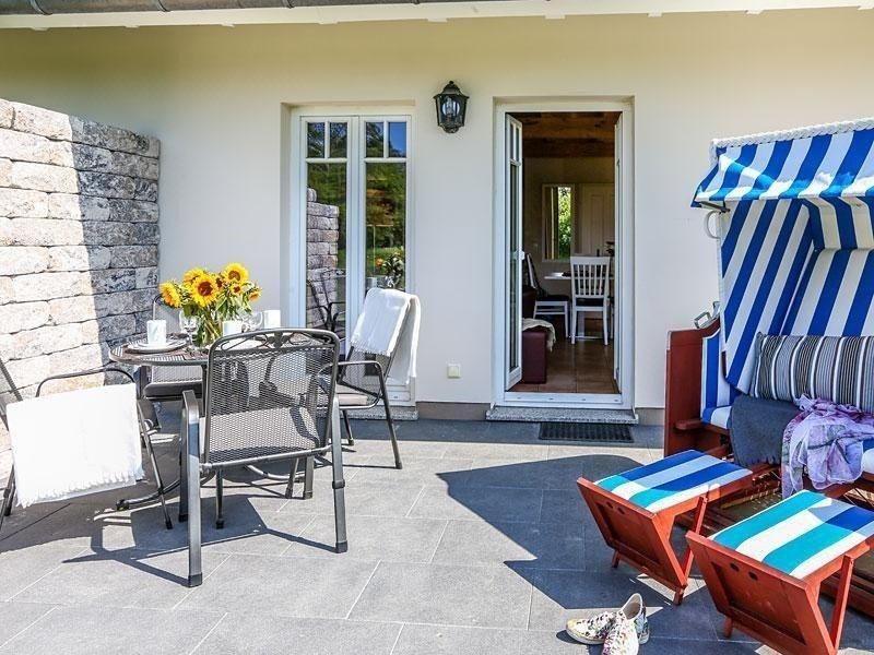 Die Terrasse ist ausgestattet mit modernen Gartenmöbeln, ein hübscher Strandkorb für das maritime Flair vervollständigt das harmonische Gesamtbild.