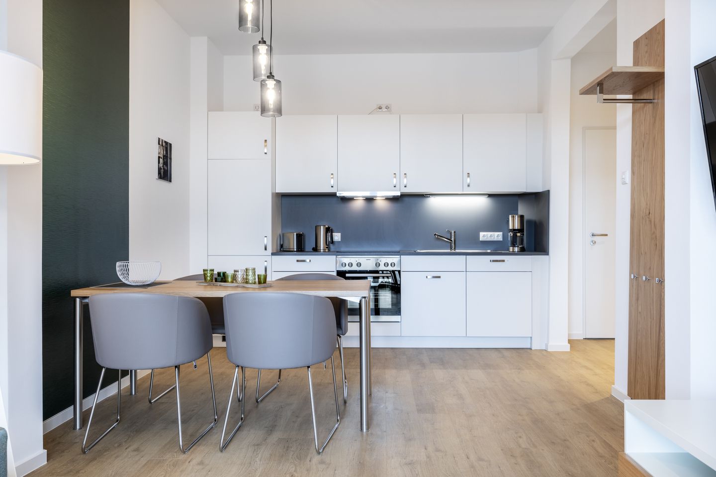 Die barrierearmen Apartments verfügen über WLAN, Fußbodenheizung, offene Küchen sowie eine hochwertige Inneneinrichtung und Ausstattung. Das harmonische Farbkonzept sorgt für Behaglichkeit und modernes Wohlgefühl. Zur Ausstattung der Ferienanlage gehören außerdem ein abschließbarer Fahrradraum, Waschmaschinen und Trockner zur gemeinschaftlichen Nutzung sowie eine Aufzugsanlage für den komfortablen Zugang zu allen Etagen. Öffentliche Parkplätze und eine Tiefgarage befinden sich in unmittelbarer Nähe.