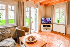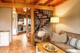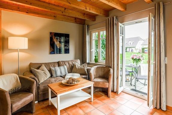 Im Erdgeschoss befindet sich der geschmackvoll möblierte Wohnbereich. Zwei gemütliche Sessel sowie eine bequeme Sofa-Garnitur sorgen für eine familiäre Atmosphäre zum Wohlfühlen. Das Sofa ist ausziehbar und bietet 2 Personen eine Schlafmöglichkeit für die Nacht.