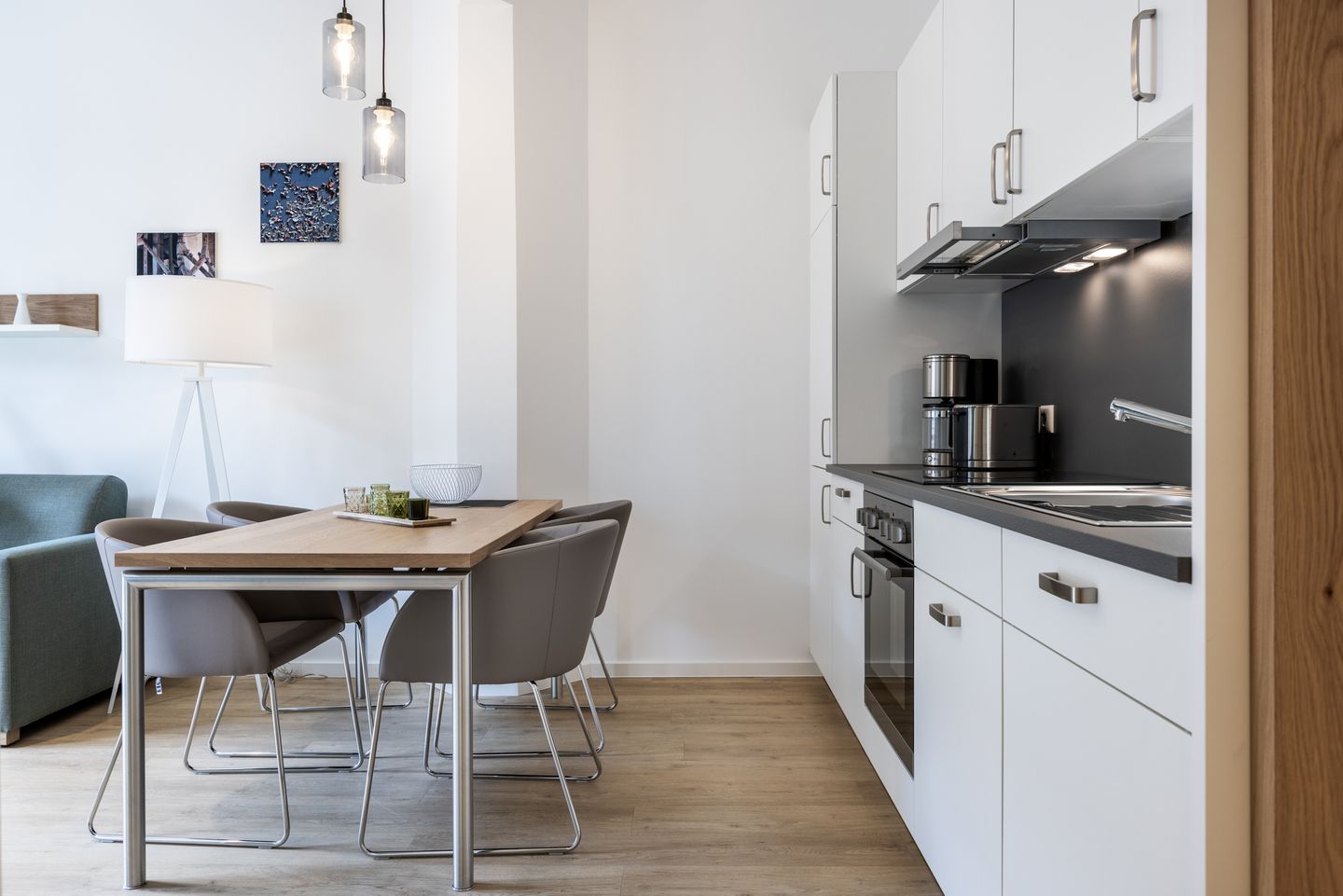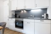 Das helle Apartment verfügt über bodentiefe Fenster, Fußbodenheizung, kostenfreies WLAN und eine voll ausgestattete offene Küche mit Geschirrspüler, Kühlschrank mit Tiefkühlfach, Herd mit 4 Glaskeramikkochfeldern und Backofen, Kaffeemaschine, Toaster, Wasserkocher und Mixstab. Im kombinierten Wohn-Essbereich befinden sich eine Einzelschlafcouch (1,20 x 2,00 m), ein Flatscreen-TV (42 Zoll), eine HiFi-Anlage sowie Gesellschaftsspiele. Genießt schöne Stunden auf dem Balkon mit Blick zum Hafen. Das Schlafzimmer beinhaltet ein komfortables Boxspring-Doppelbett (1,80 x 2,00 m) und einen Flatscreen-TV (42 Zoll). Im geschmackvollen Badezimmer stehen euch eine ebenerdige Regendusche, ein Waschtisch, WC, ein Handtuchwärmer sowie ein Föhn zur Verfügung. Das Apartment verfügt über einen Safe für eine Laptopgröße bis ca. 17 Zoll. Haustiere sind in diesem Apartment herzlich willkommen.