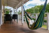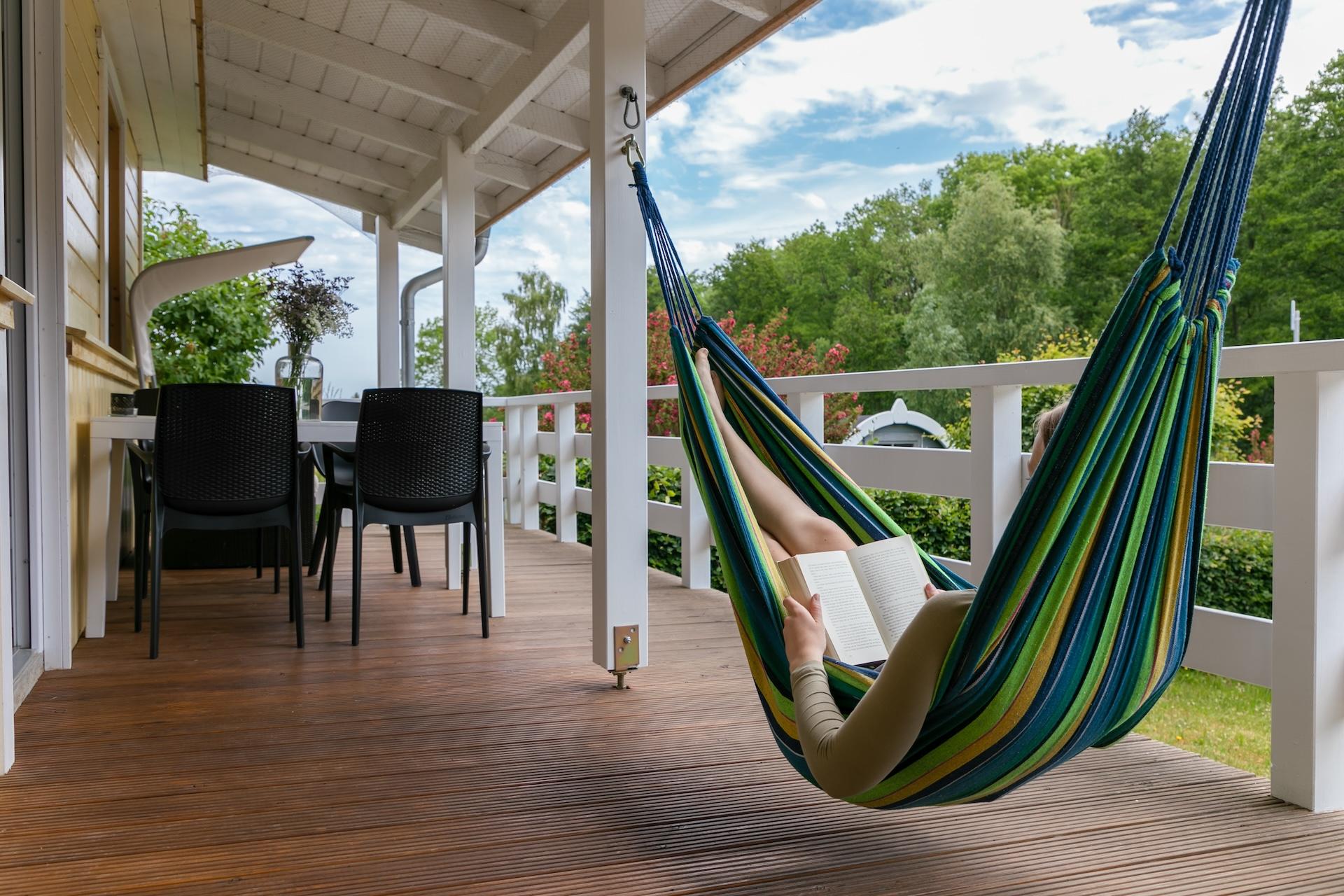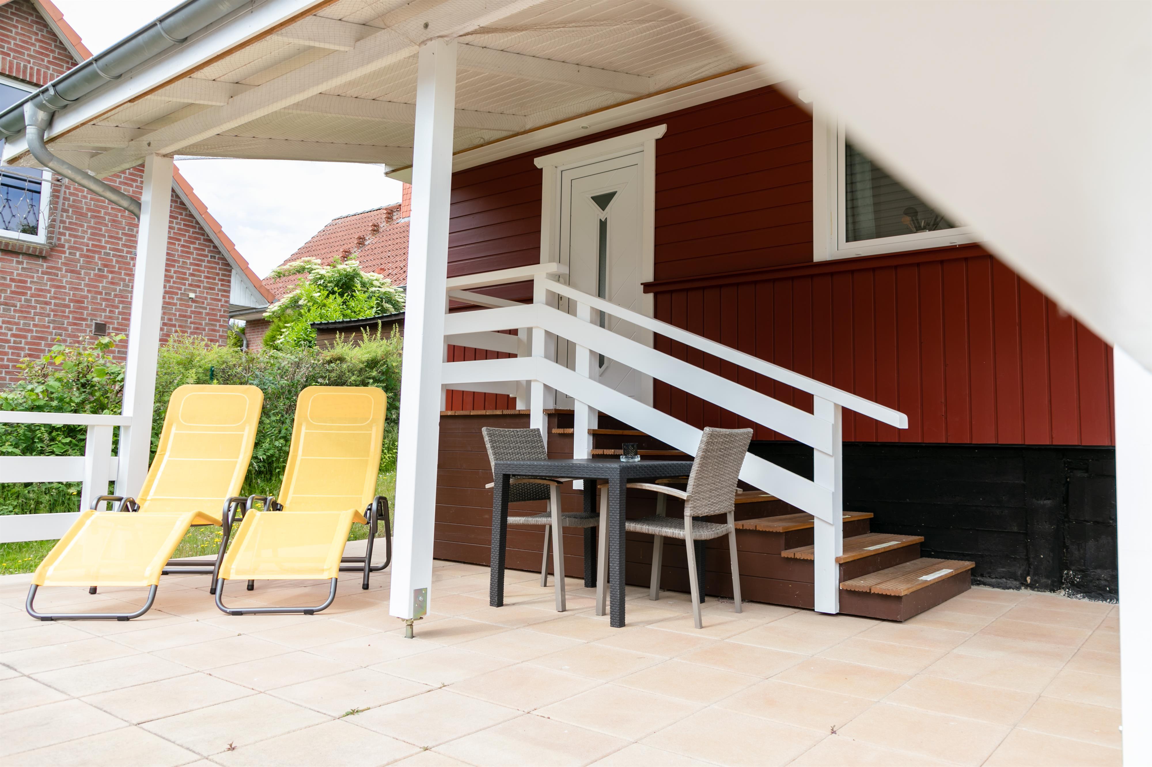 Die überdachte Holzterrasse ist mit Stühlen und einem Tisch ausgestattet und lädt euch dazu ein, den vielen Vögeln im naheliegenden Wald zu lauschen.