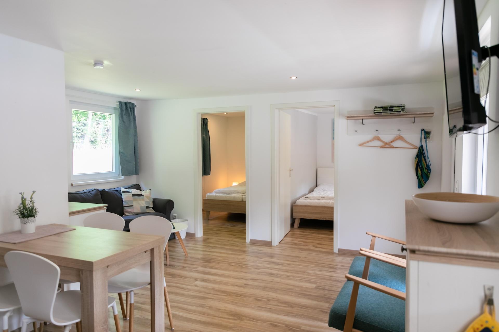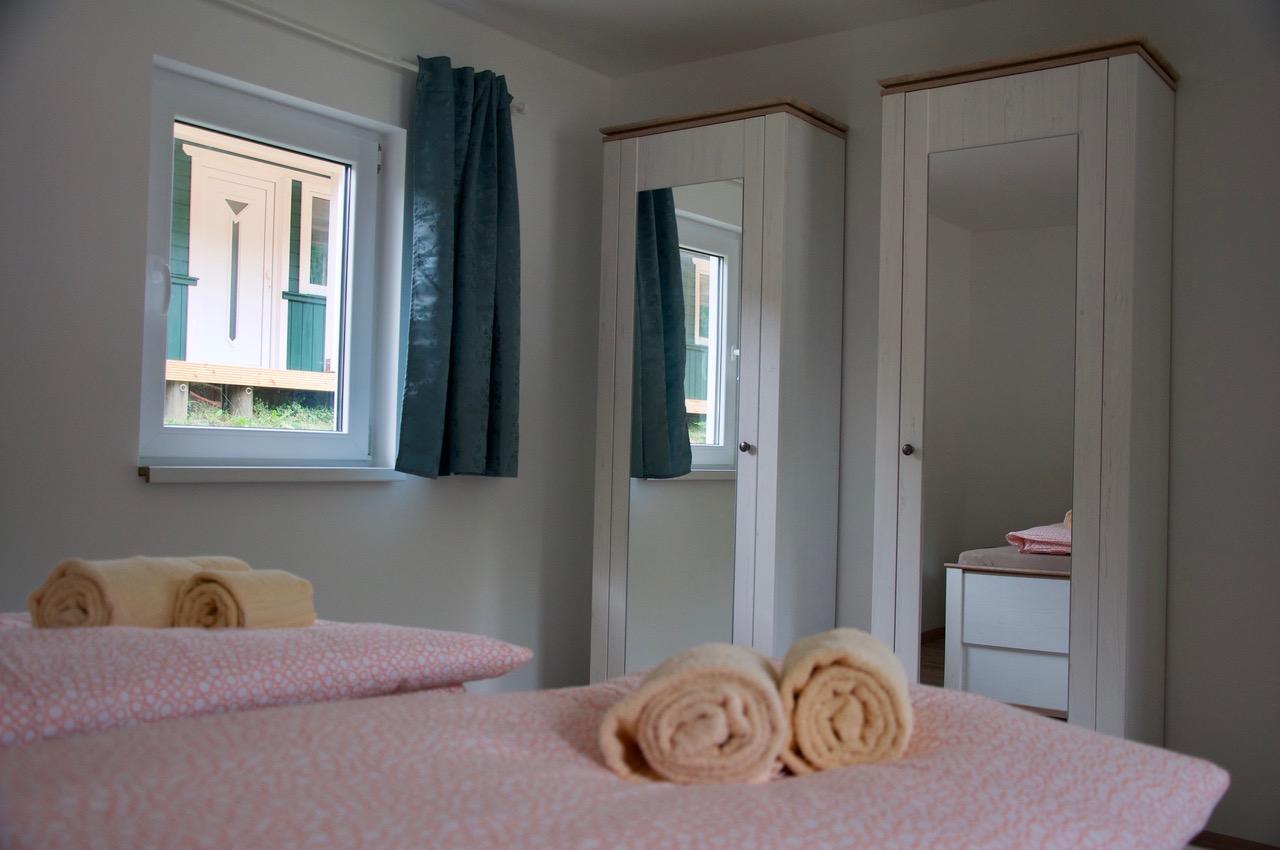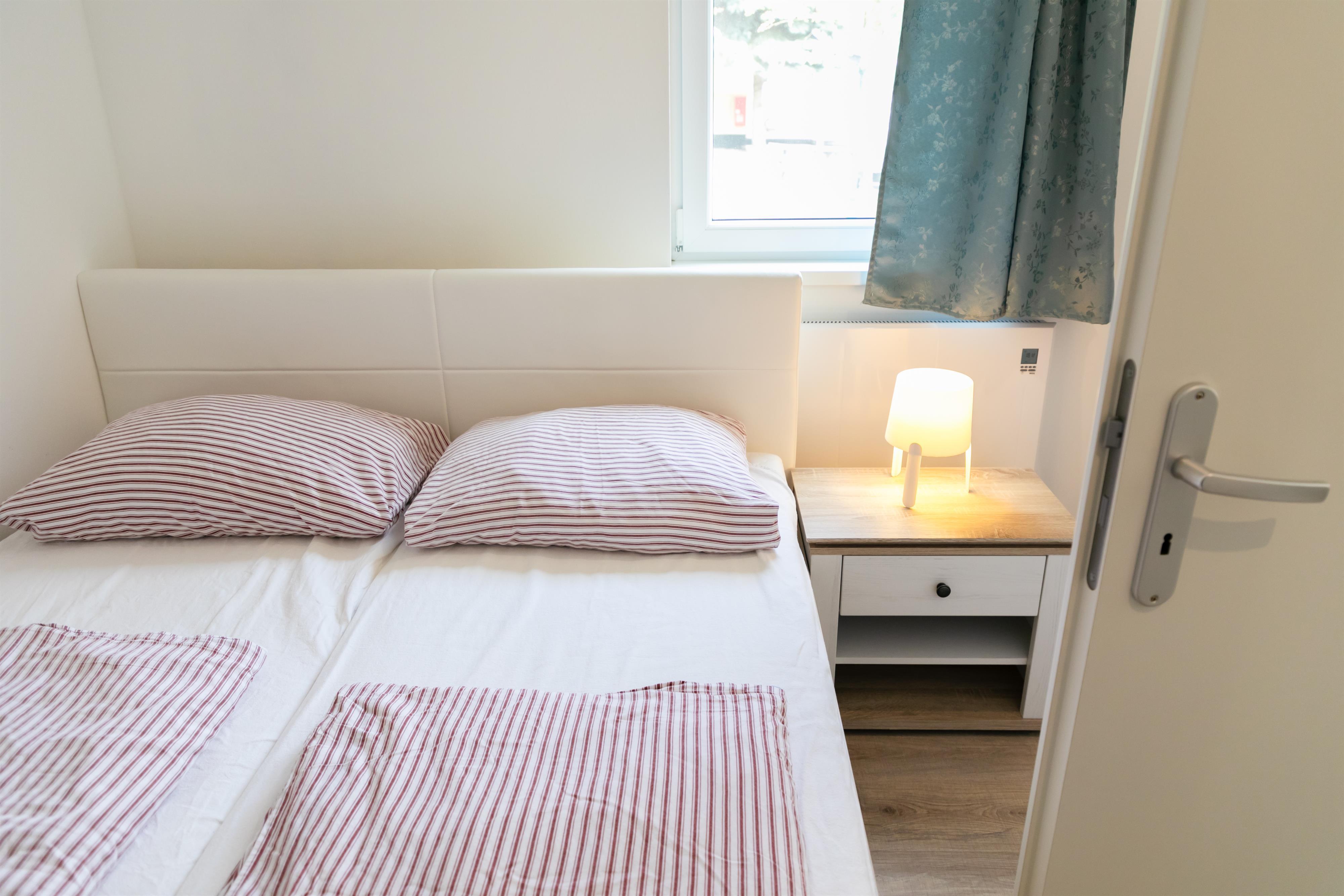 Dieser gemütliche Bungalow ist für 2 Personen und hat ca. 30 qm (Bj. 2018). Er hat ein Schlafzimmer mit Doppelbett (2 Matratzen à 80×200 cm) und Kleiderschrank. 2 Kissen und 2 Bettdecken sind vorhanden, nur die Bezüge müssen selbst mitgebracht werden. Die offene Wohnküche ist mit einem Kühlschrank, einem Herd mit Ceranfeld und einem Backofen sowie den wichtigsten Küchenutensilien ausgestattet. Ein Esstisch mit Stühlen, ein modernes Sofa, ein Couchtisch sowie ein Flachbildfernseher sorgen für Gemütlichkeit. Im Bad befindet sich eine ebenerdige Dusche, das WC und ein Waschbecken.