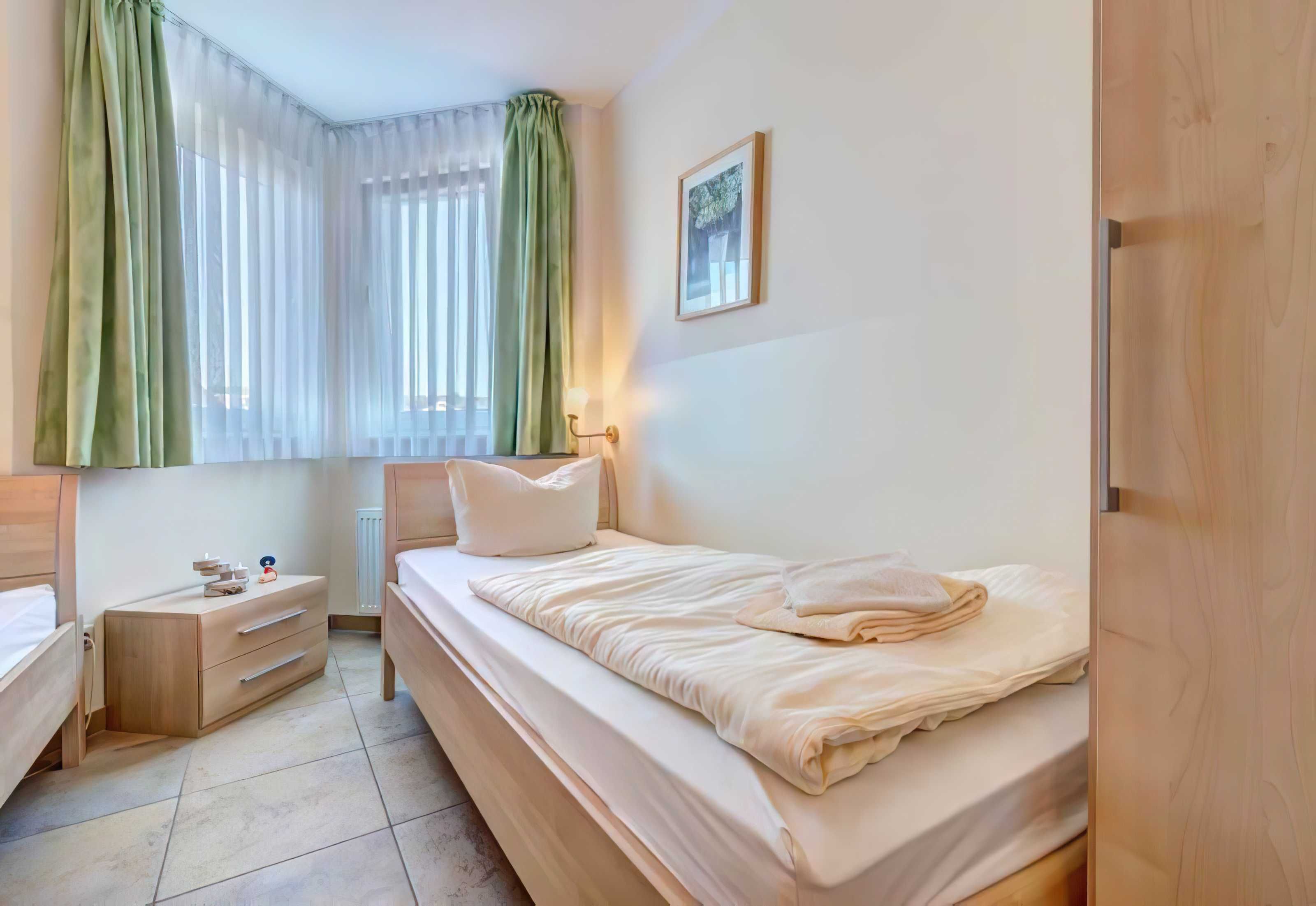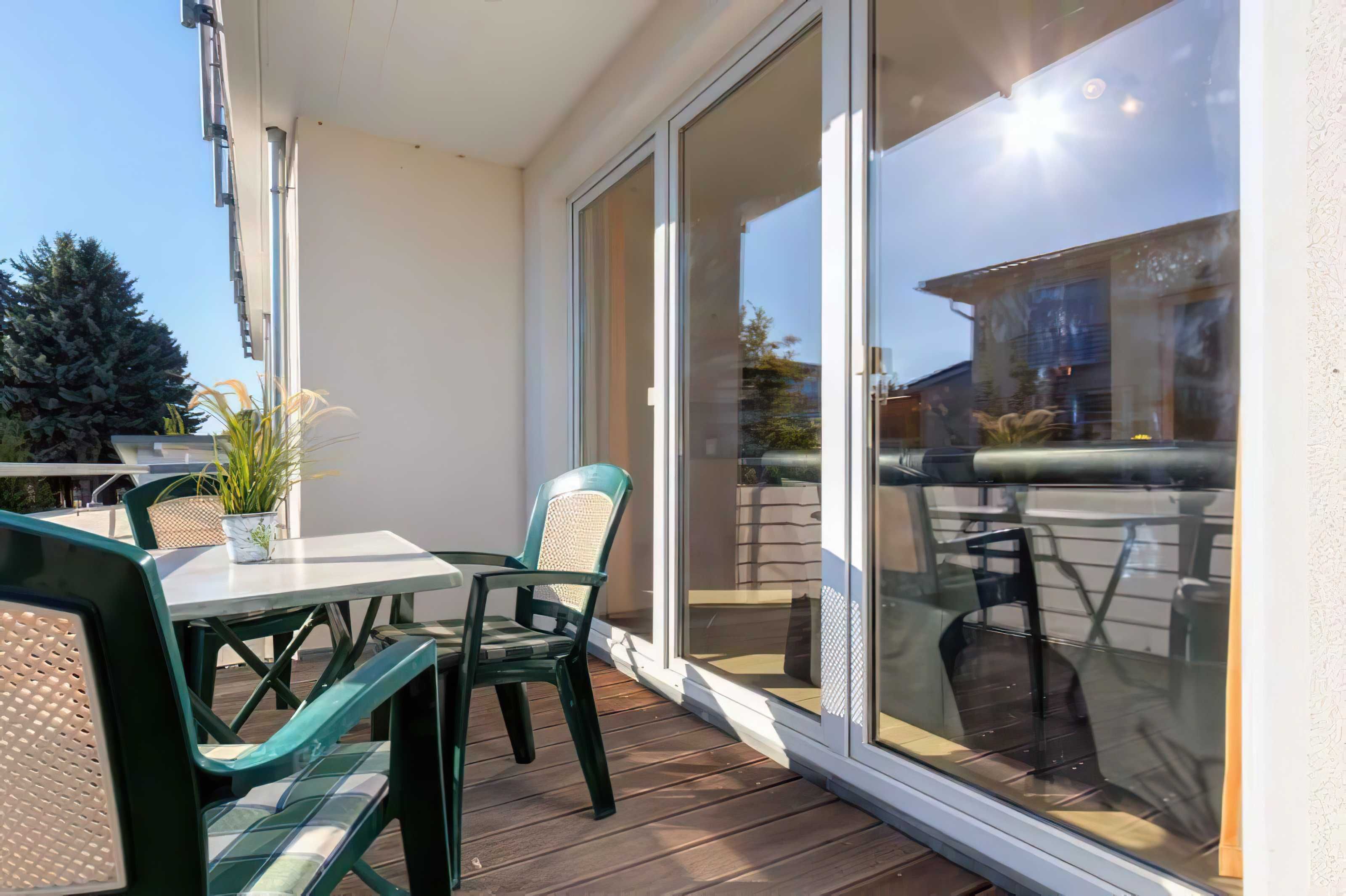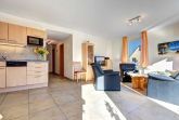 Die Wohnungen im Obergeschoß mit Balkon haben ebenfalls eine Größe von 65 m², auch hier sind 2 separate Schalzimmer vorhanden, wobei das Eine mit Doppelbett und das Andere mit 2 Einzelbetten eingerichtet ist.