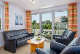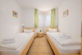 Die Wohnungen im Obergeschoss sind mit einem Balkon ausgestattet und haben eine Größe von 65 m². Jede Wohnung verfügt über zwei separate Schlafzimmer, wovon eines mit einem Doppelbett und das andere mit zwei Einzelbetten eingerichtet ist. Des Weiteren befindet sich in jeder Wohnung ein Badezimmer mit einer Dusche und einem WC. Eine voll ausgestattete Küche mit einem Ess- und Wohnbereich ist ebenfalls vorhanden.